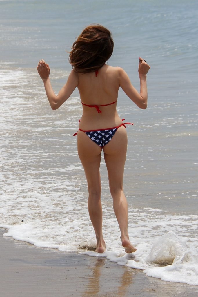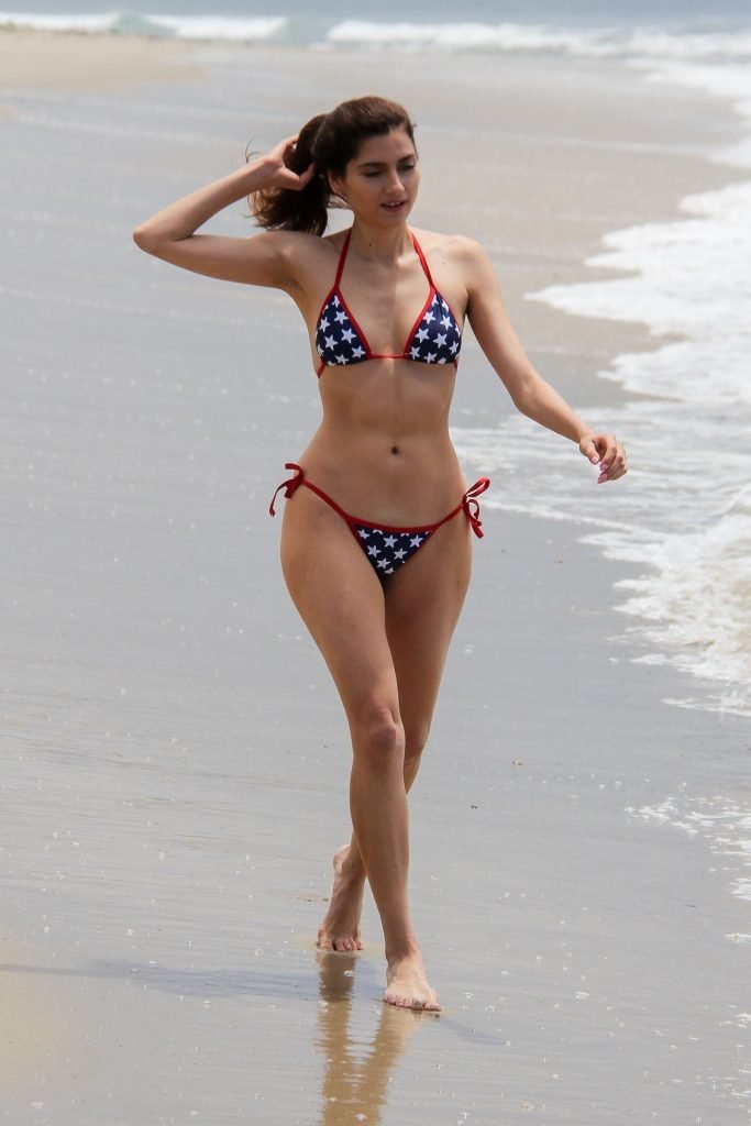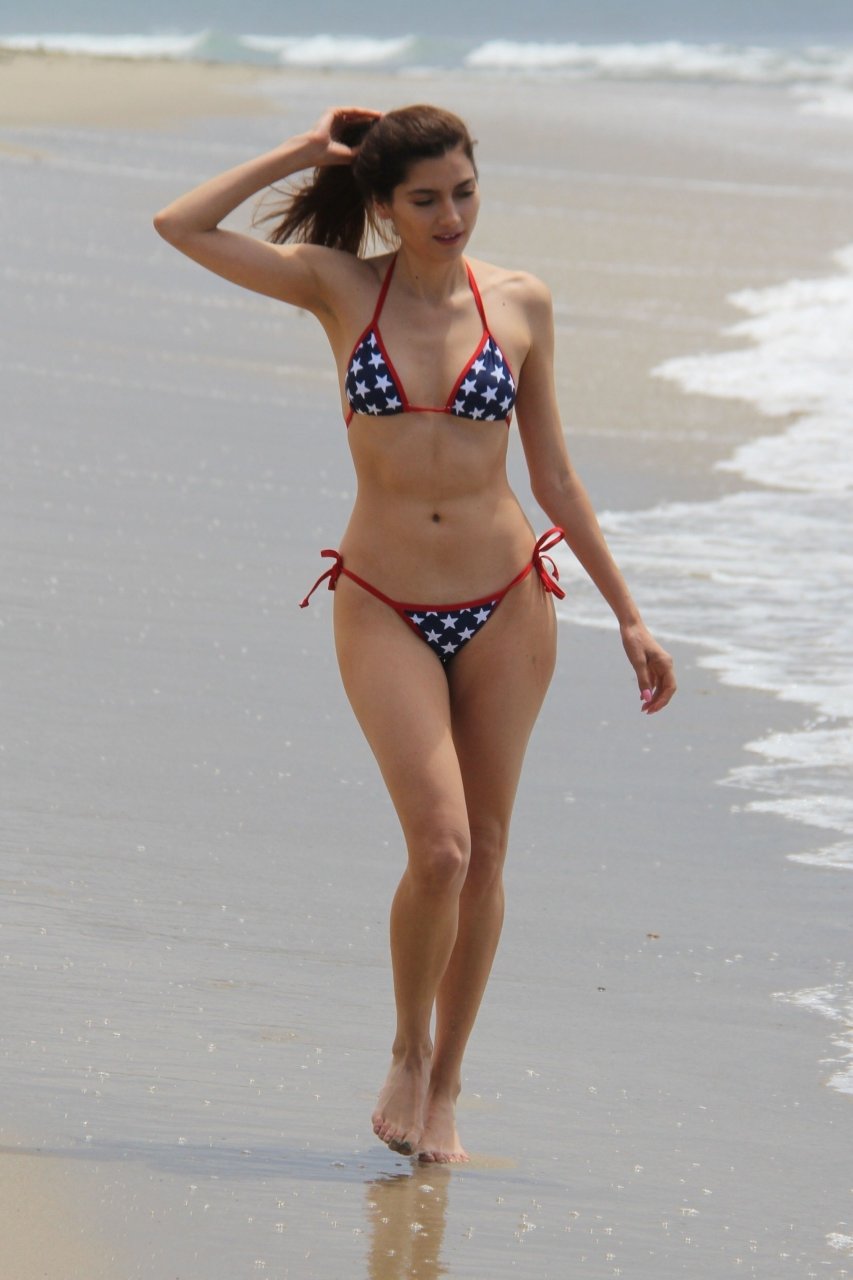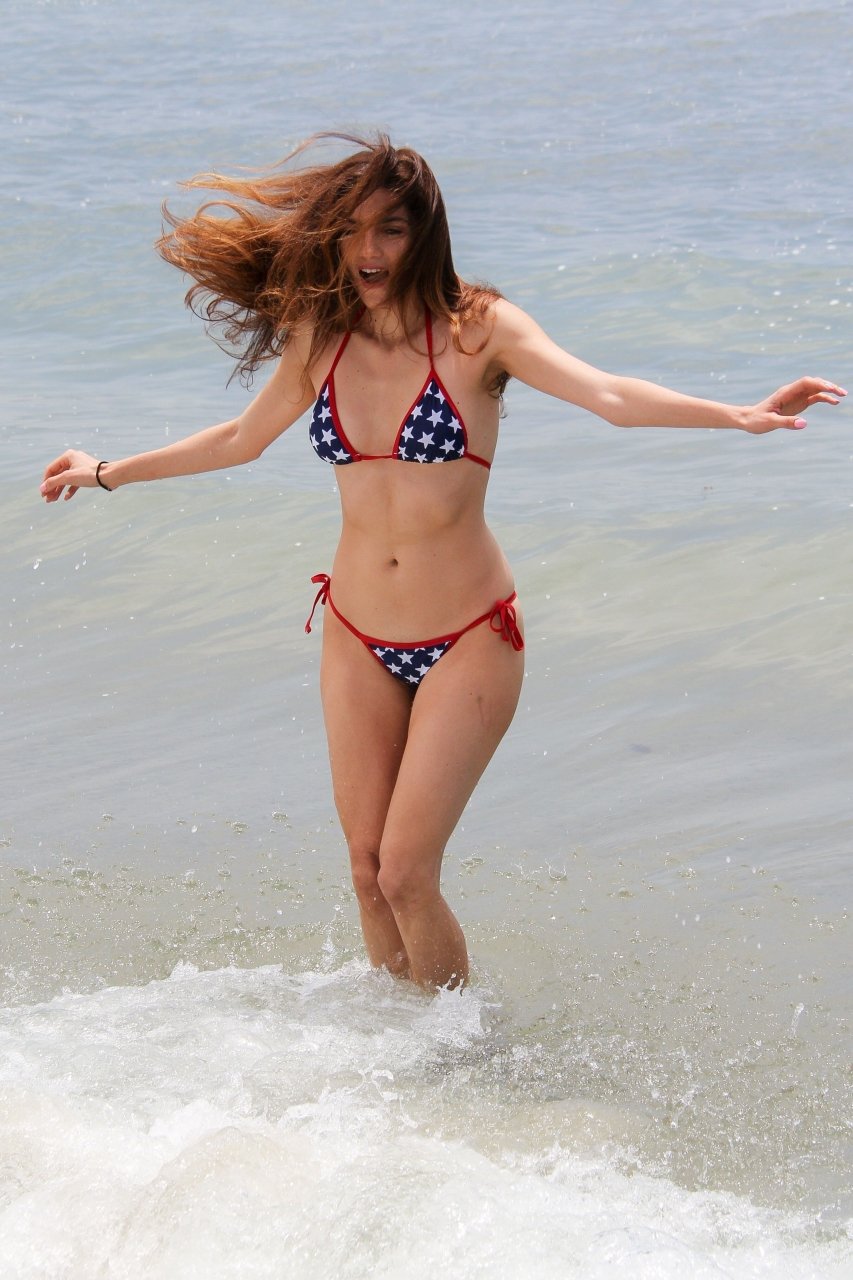 A atriz Blanca Blanco celebra o Dia da Independência em Malibu, usando um biquíni estrelado enquanto brinca nas margens do oceano, 04/07/2018.