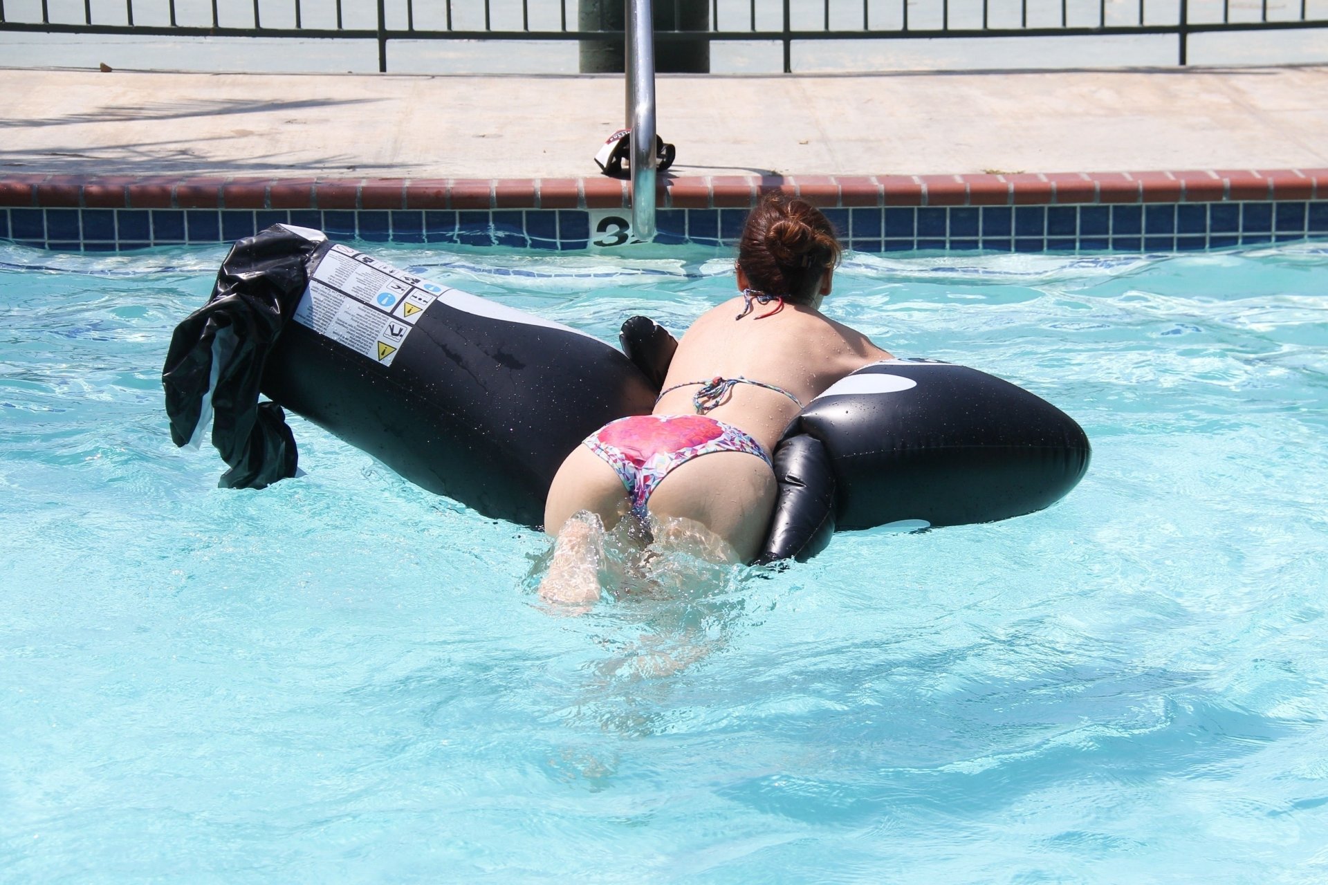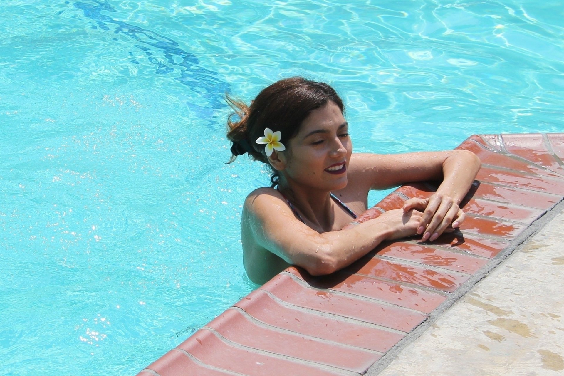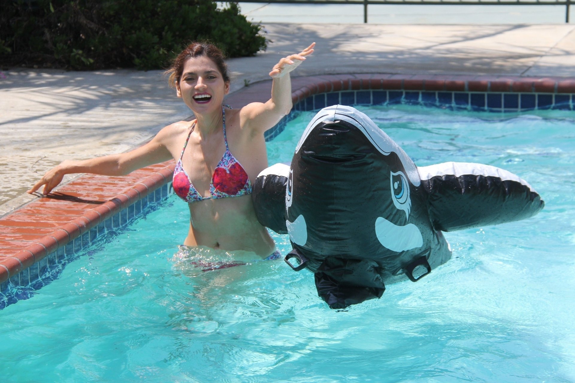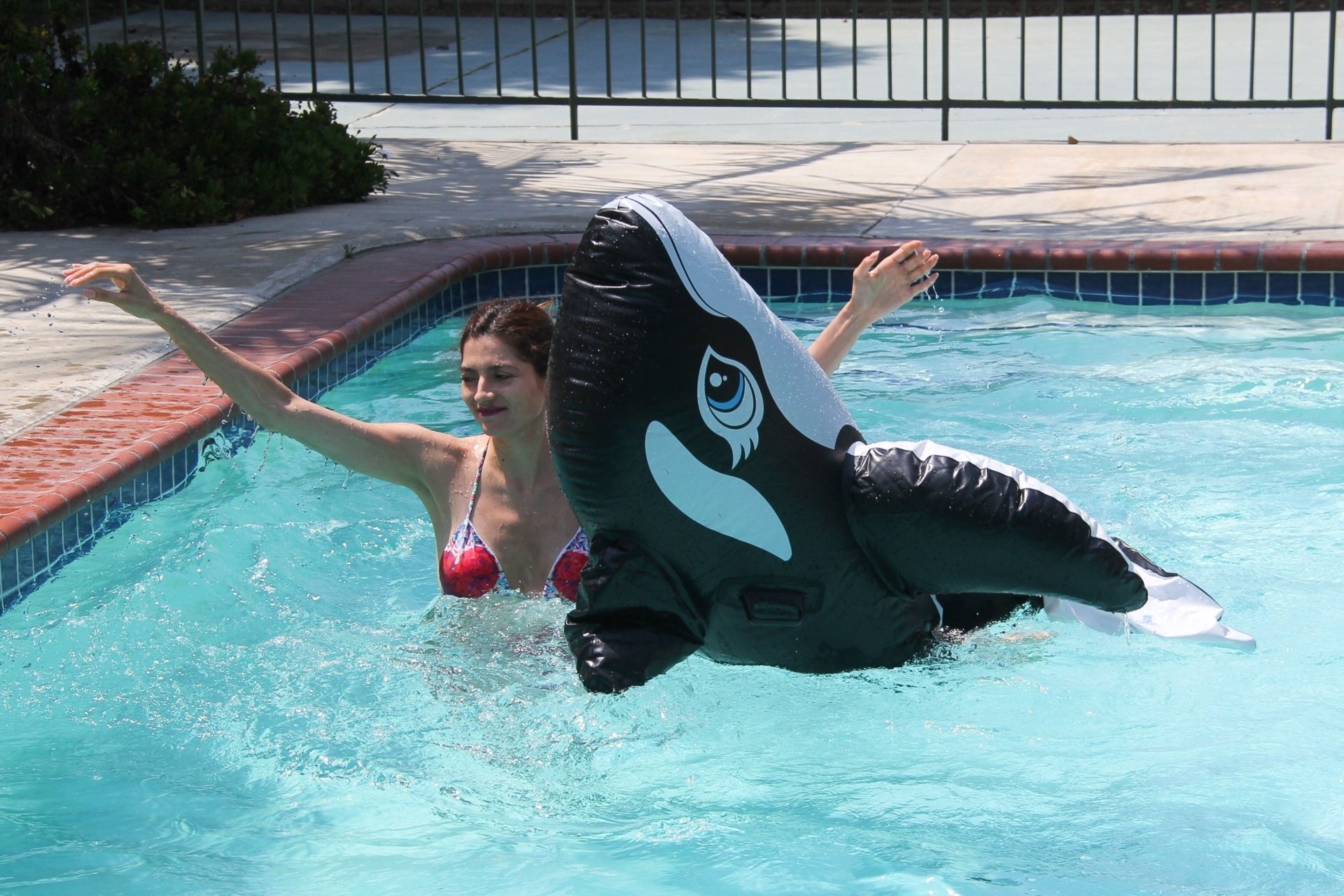 Blanca Blanco (37) pula a praia hoje e opta por um tempo na piscina em Malibu, 11/08/2018. A atriz ainda aspirante usou um biquíni com estampa de corações e brincou com um boia de orca antes de tomar sol.