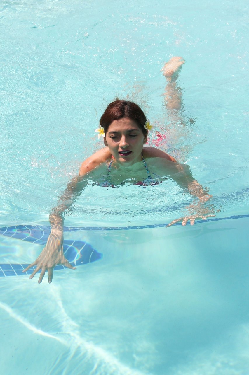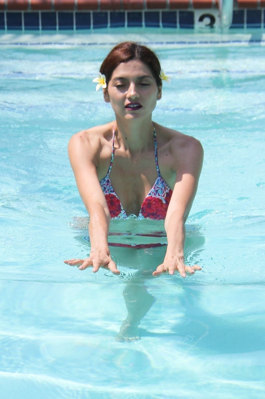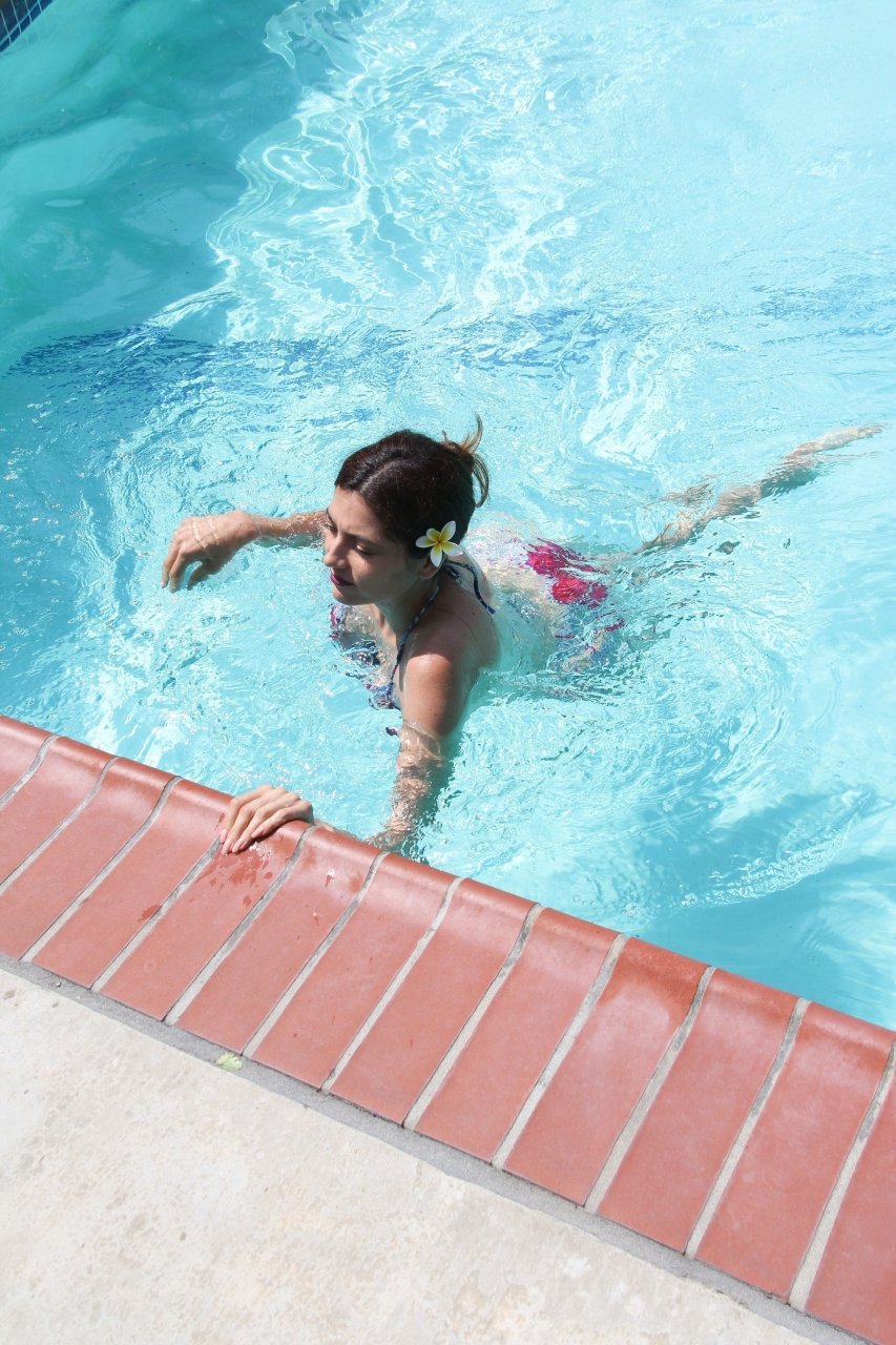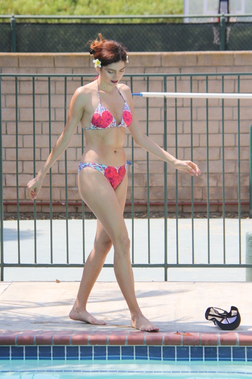 Blanca Blanco (37) pula a praia hoje e opta por um tempo na piscina em Malibu, 11/08/2018. A atriz ainda aspirante usou um biquíni com estampa de corações e brincou com um boia de orca antes de tomar sol.