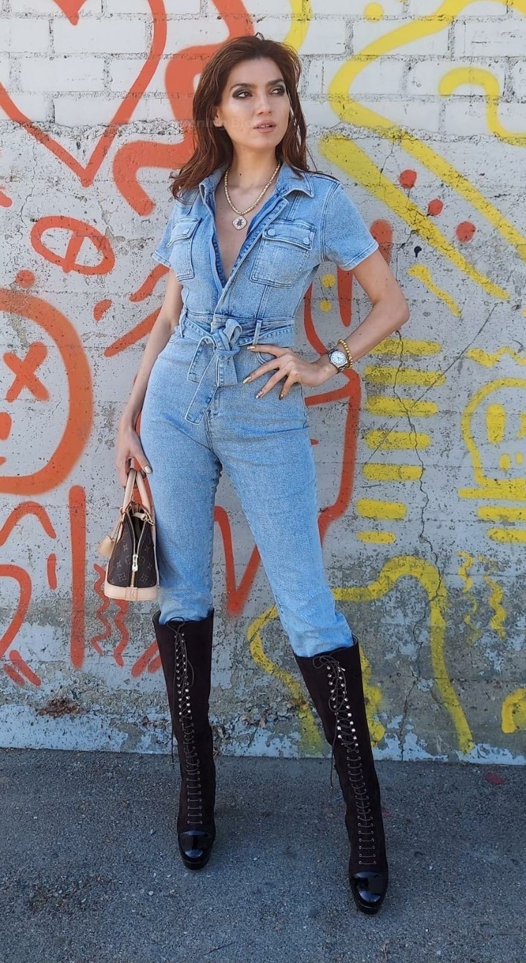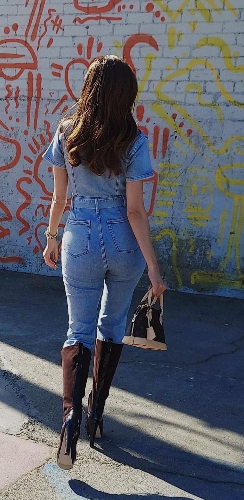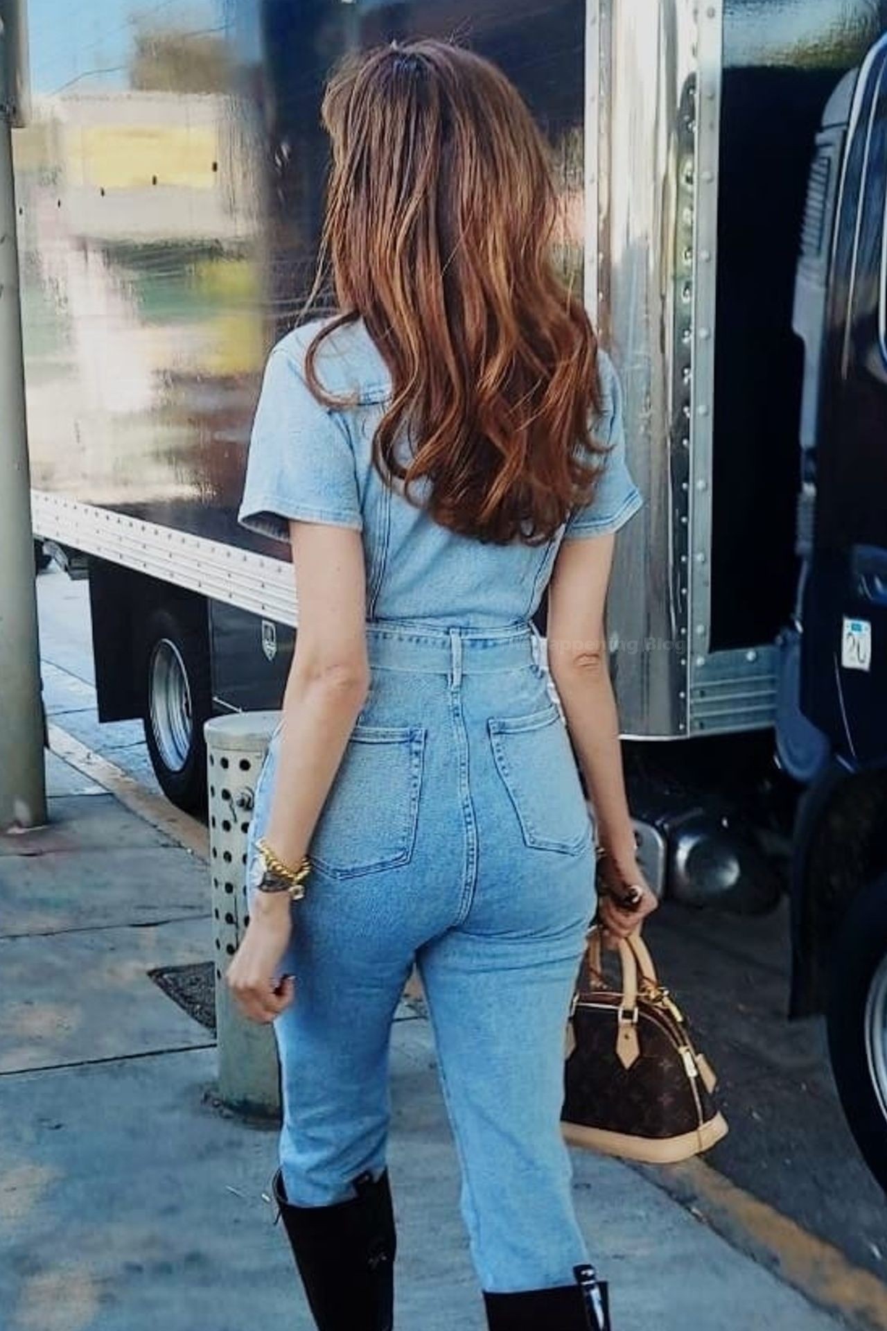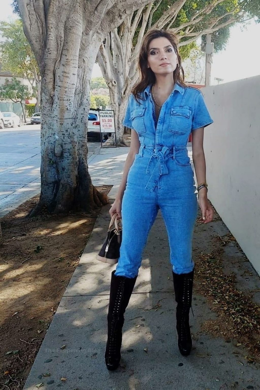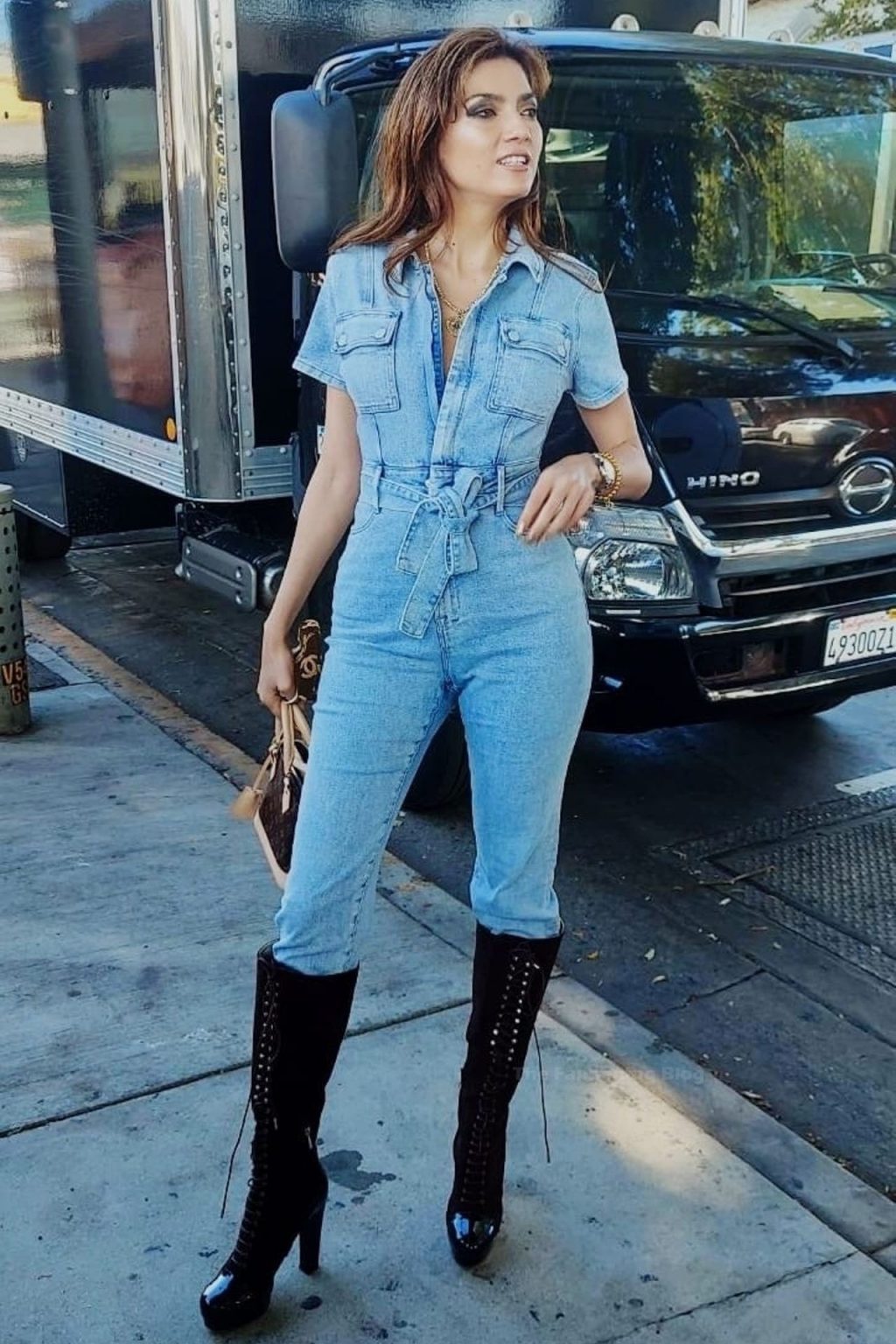 Atriz Blanca Blanco veste um macacão jeans para um ensaio fotográfico na rua em Los Angeles, 09/11/2020.