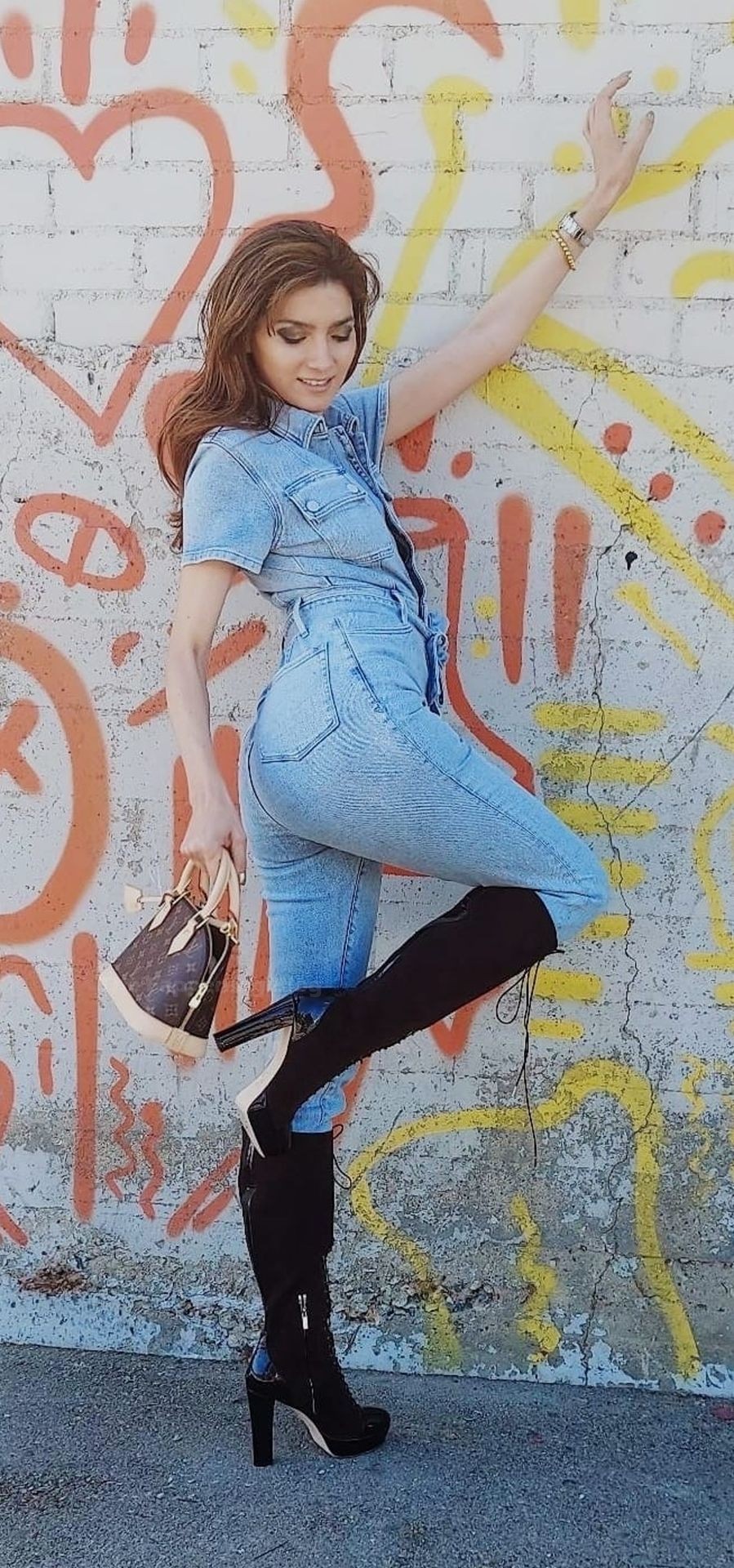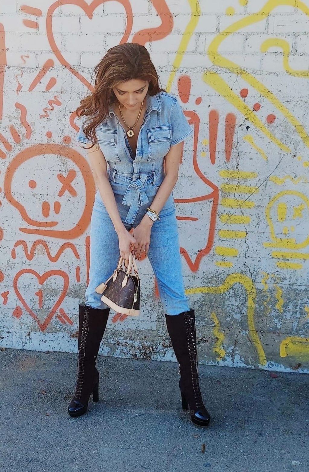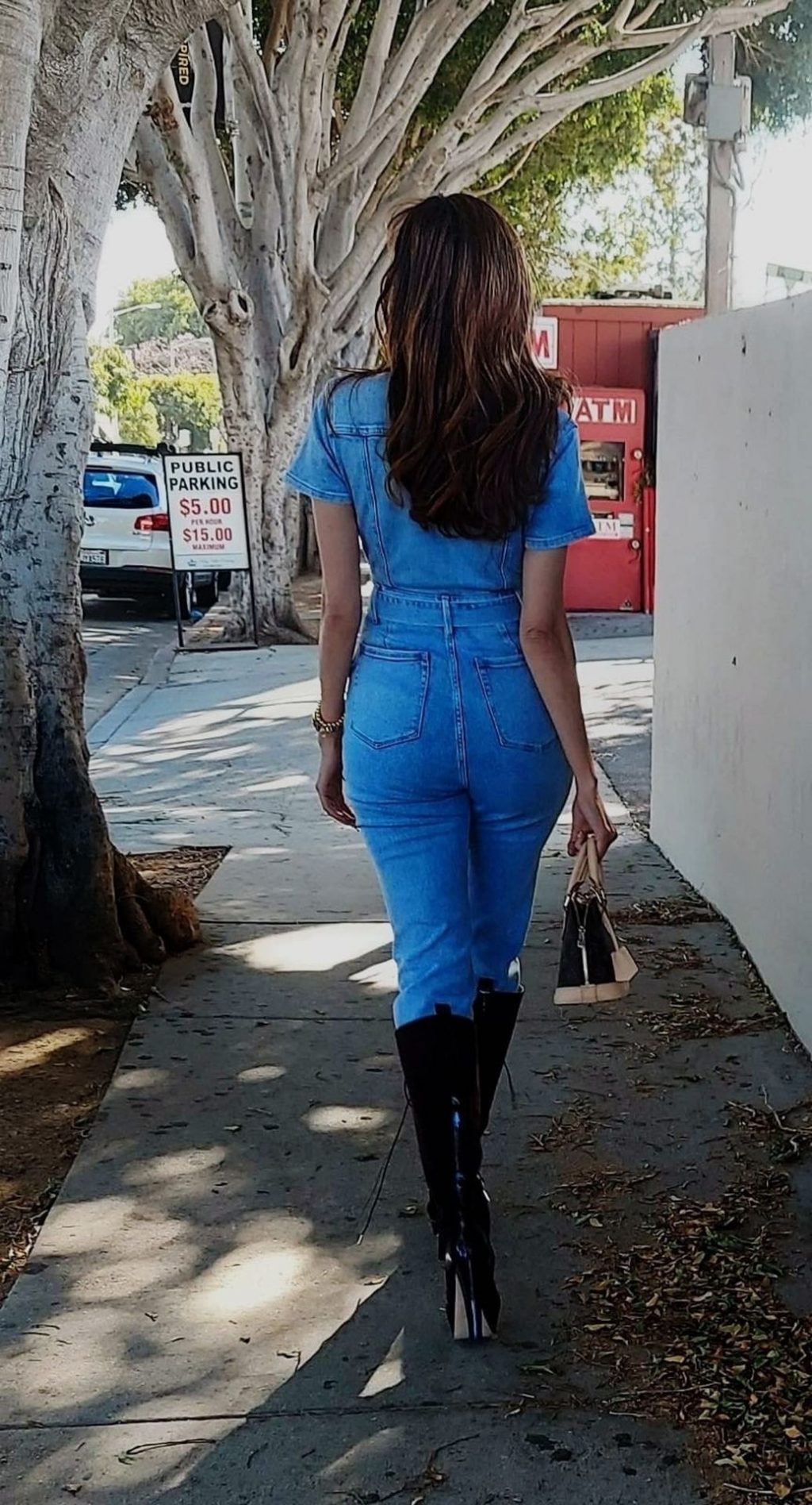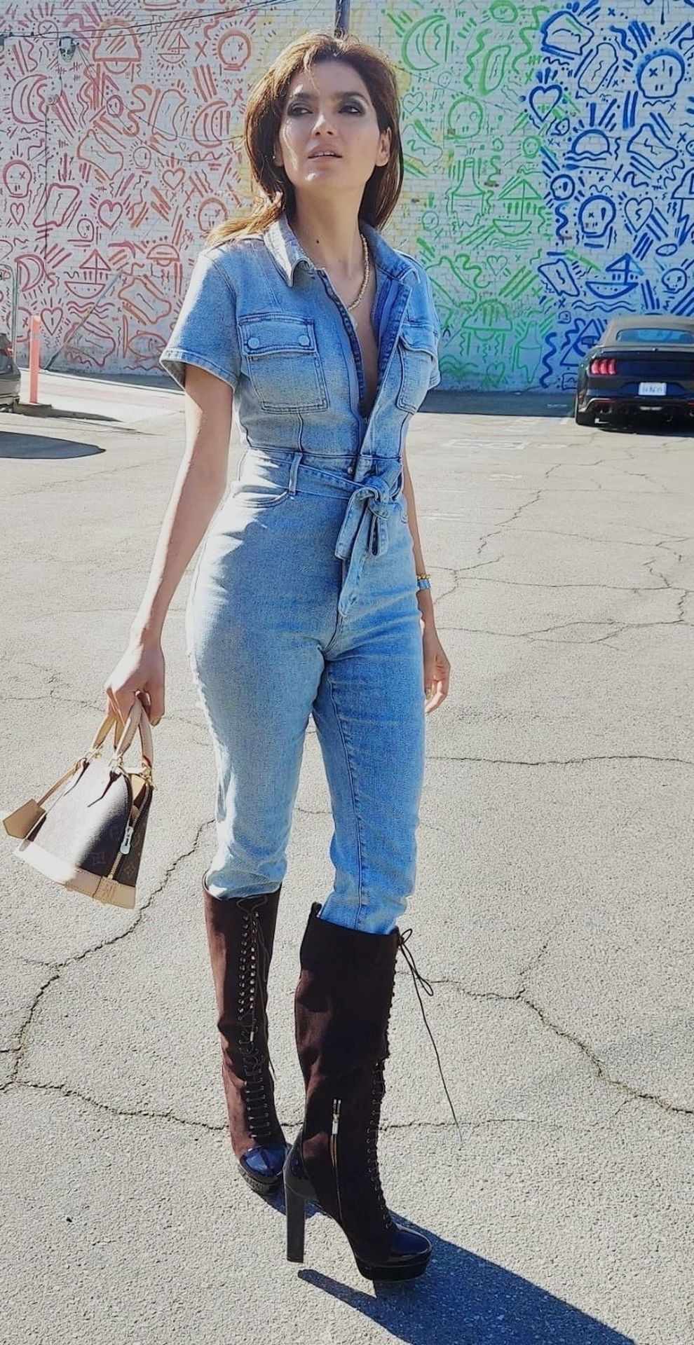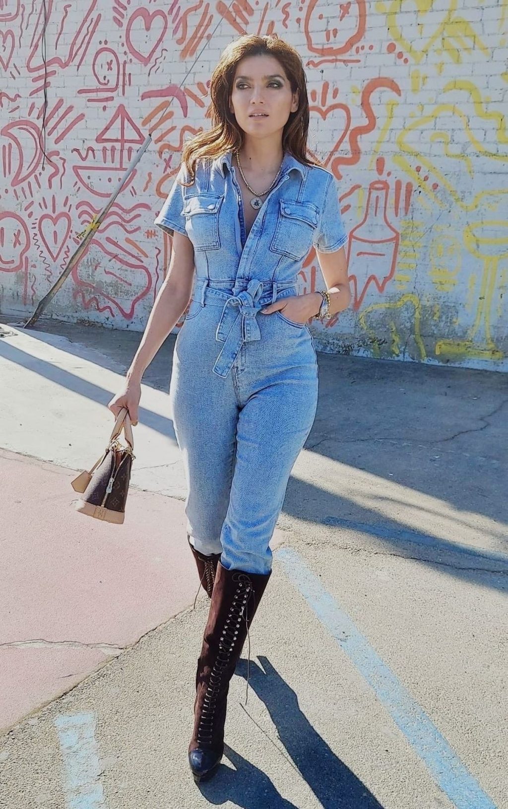Atriz Blanca Blanco veste um macacão jeans para um ensaio fotográfico na rua em Los Angeles, 09/11/2020.