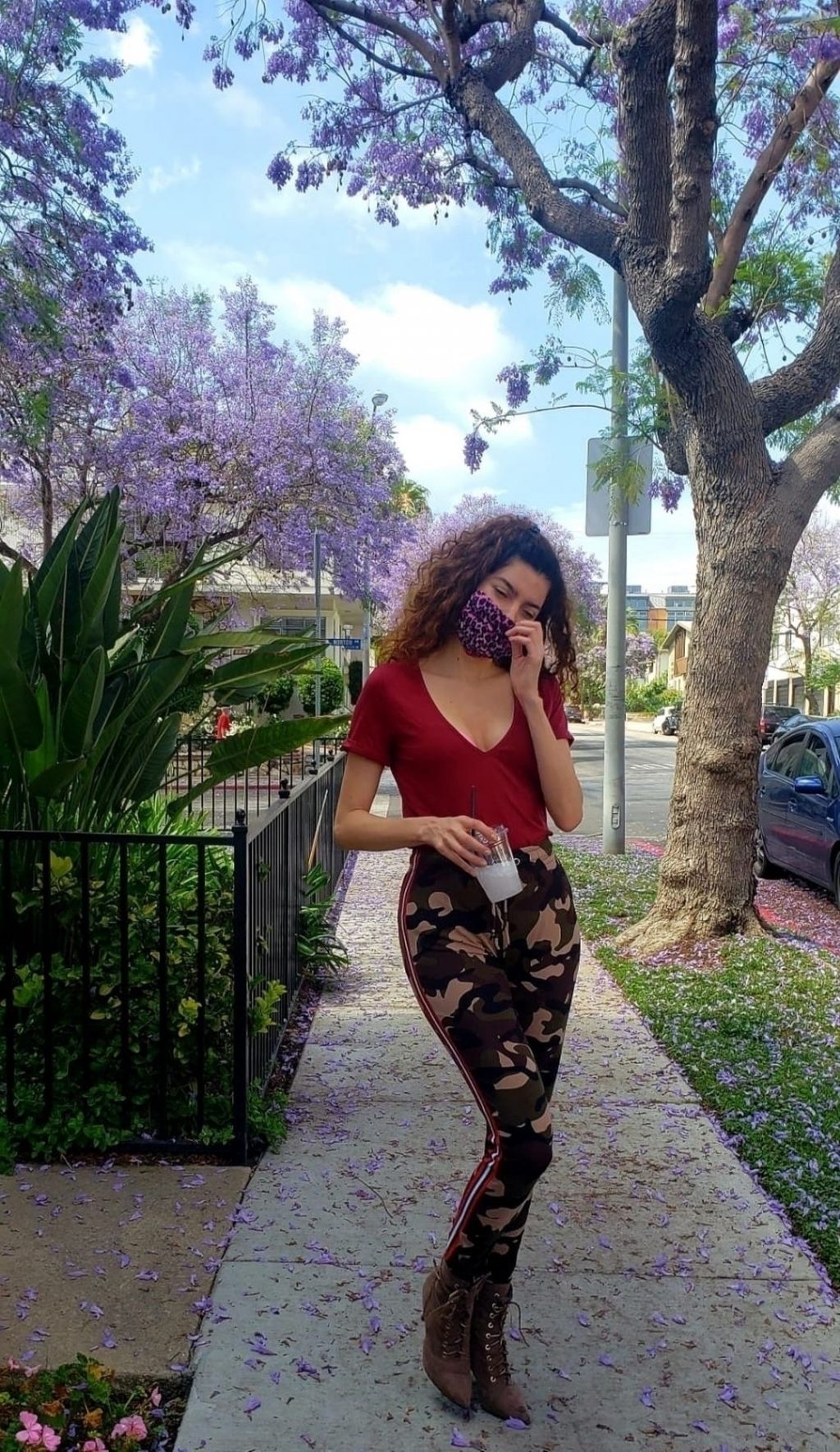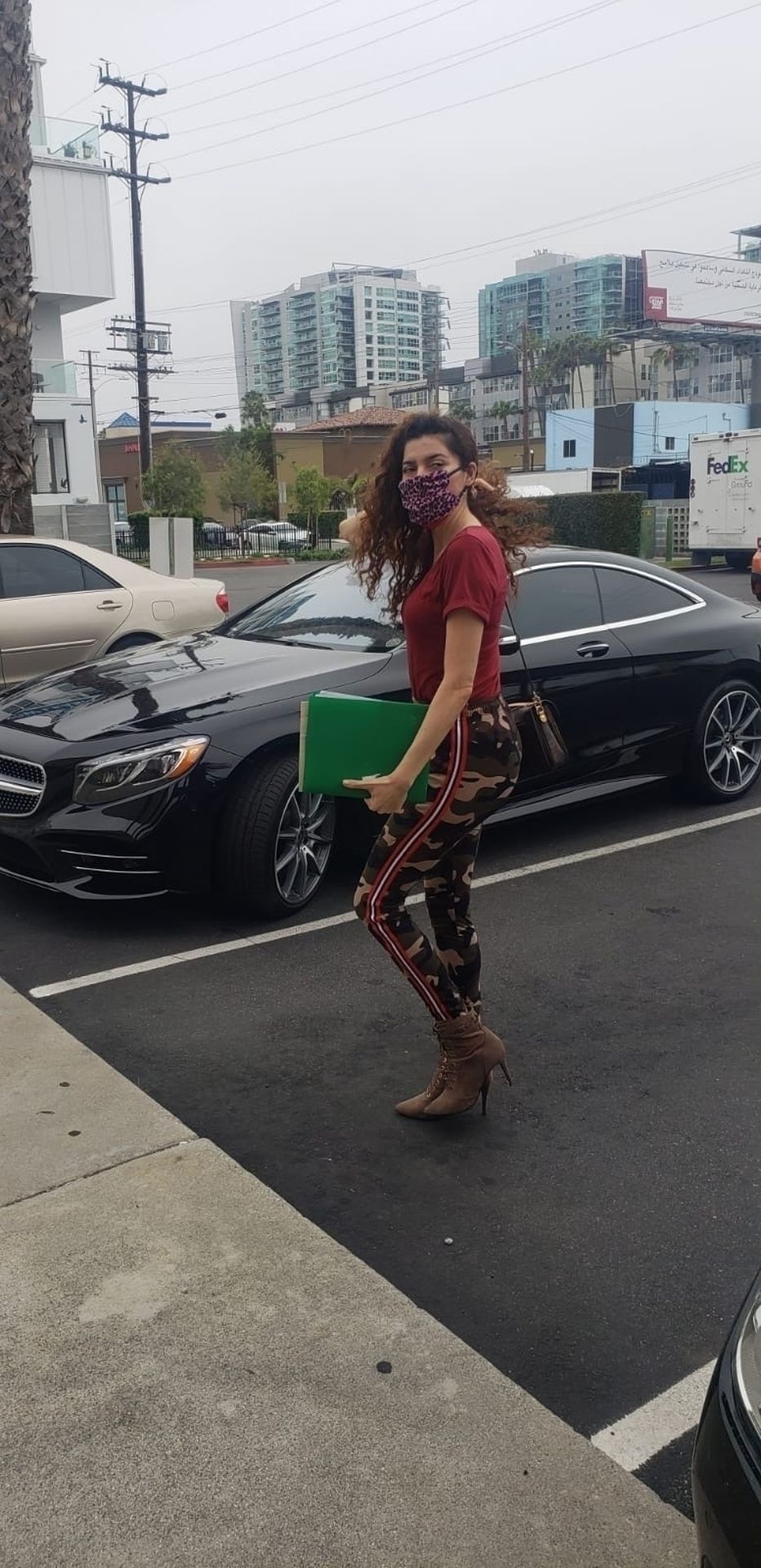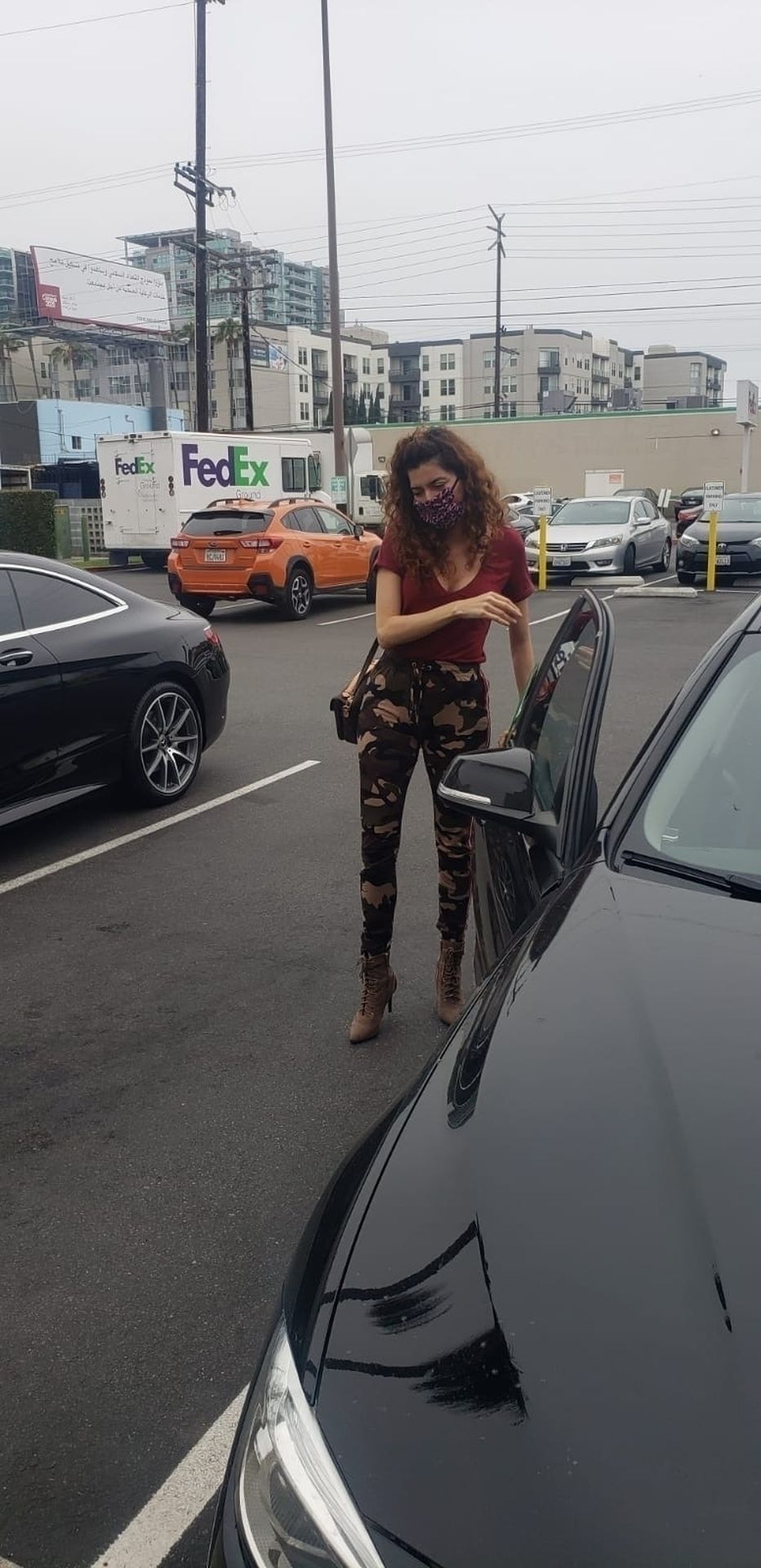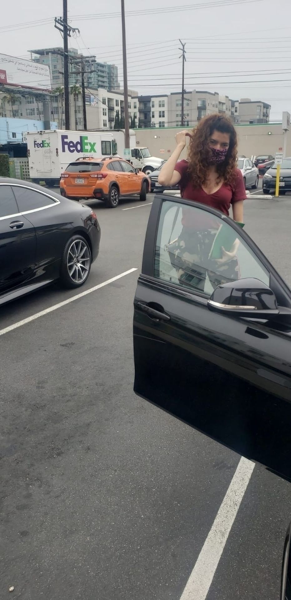 Blanca Blanco vai ao FedEx em Los Angeles, 30/05/2020. A atriz exibe seu decote na rua.
