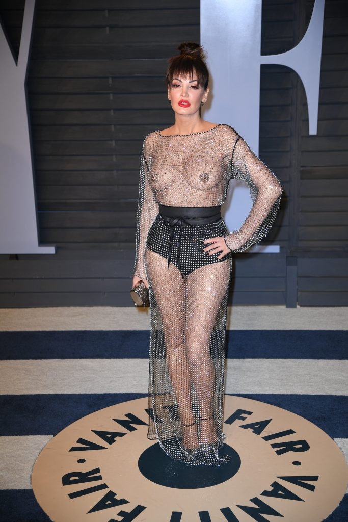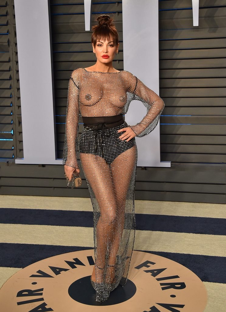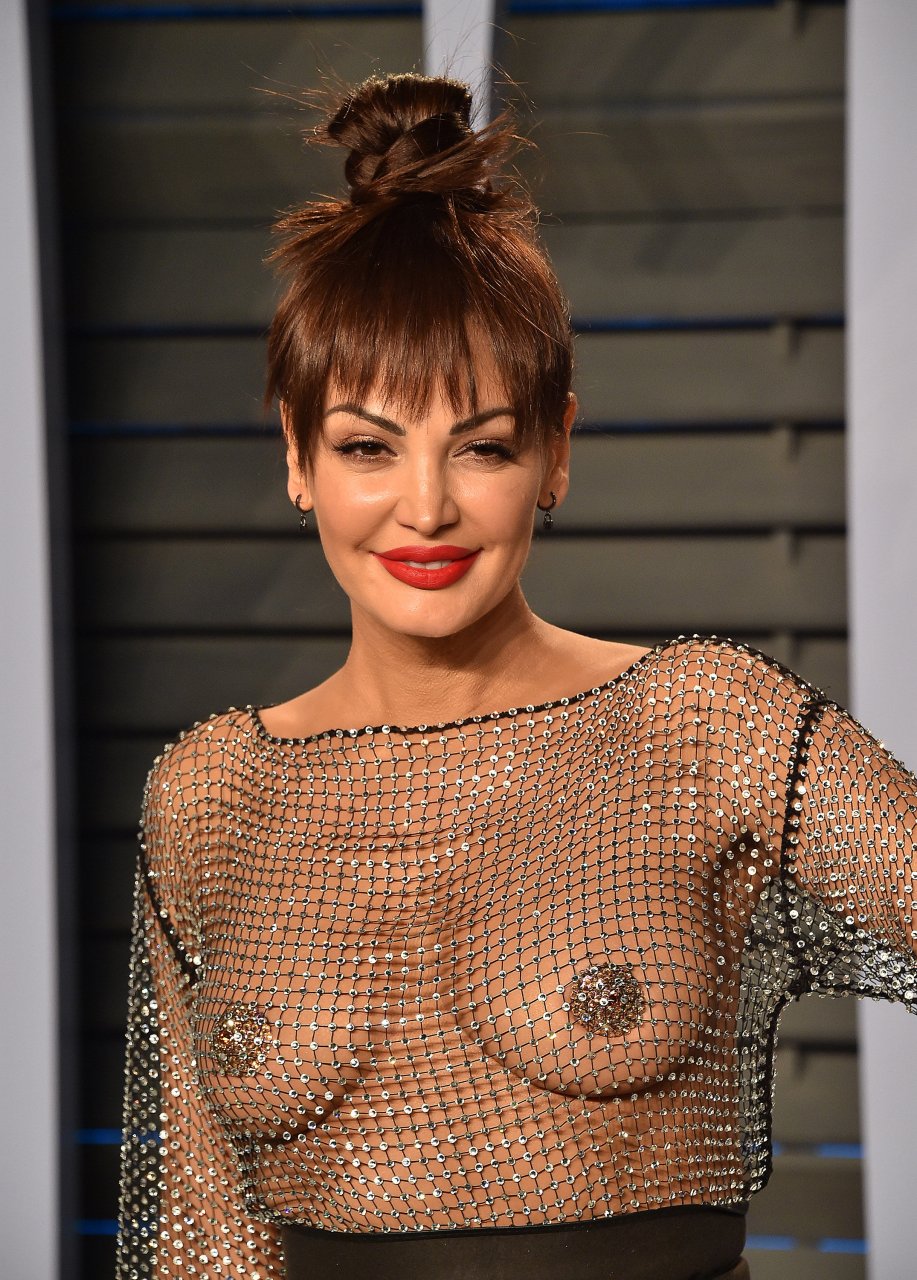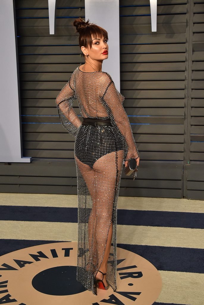 Bleona Qereti usa um vestido transparente na Vanity Fair Oscar Party 2018 em Beverly Hills, 04/03/2018. Bleona Qereti é uma cantora e atriz albanesa. Idade – 38.