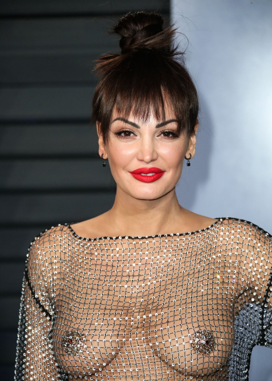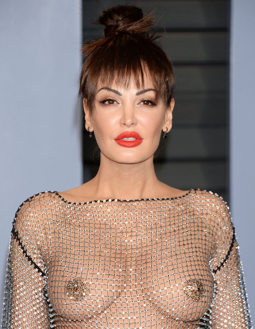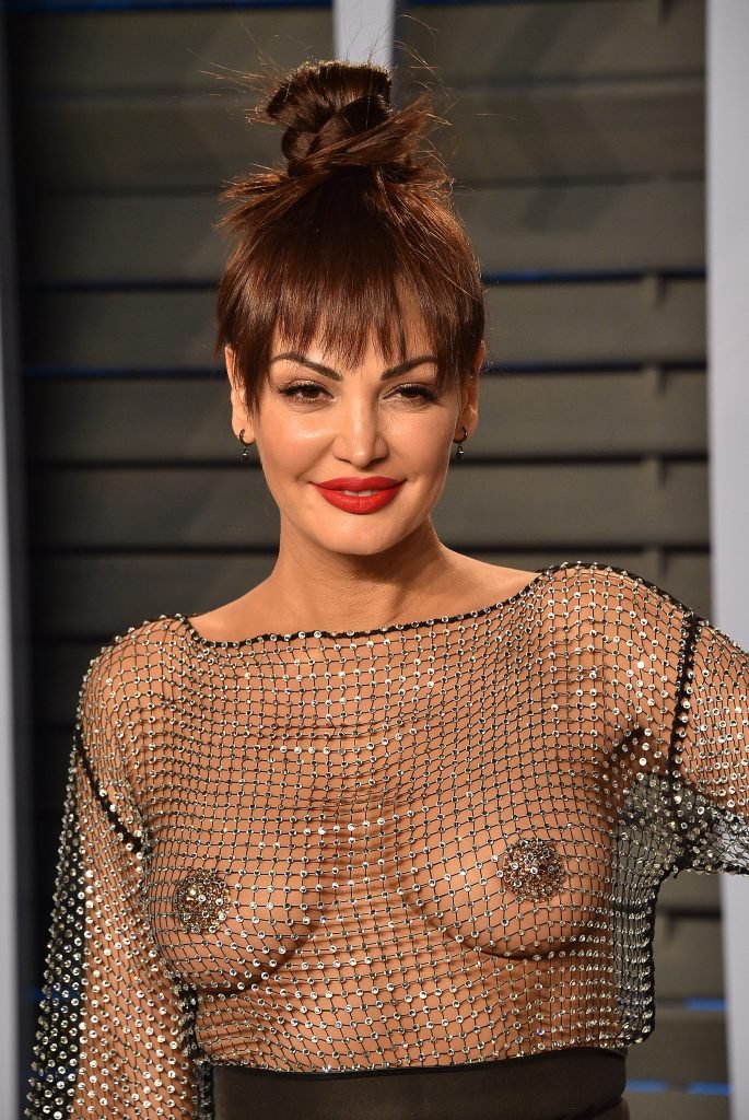 Bleona Qereti usa um vestido transparente na Vanity Fair Oscar Party 2018 em Beverly Hills, 04/03/2018. Bleona Qereti é uma cantora e atriz albanesa. Idade – 38.