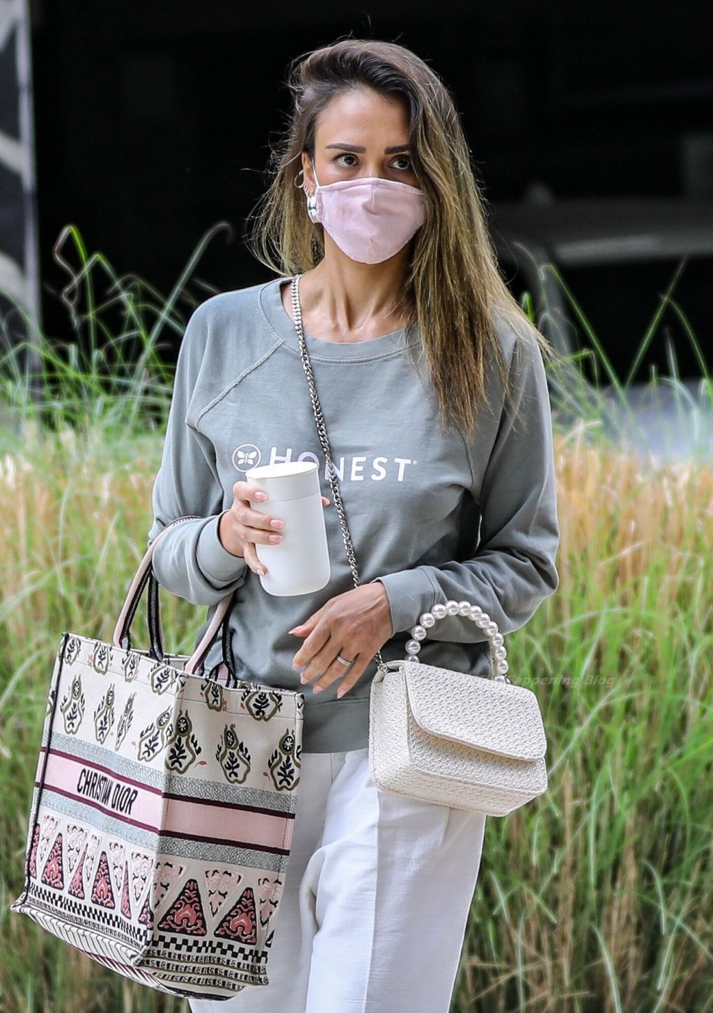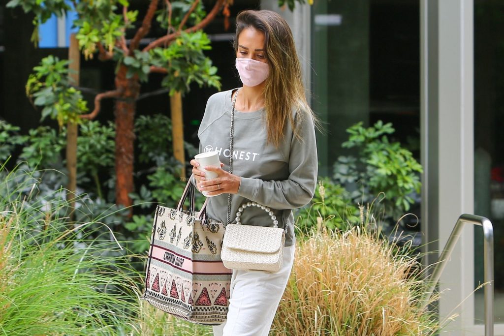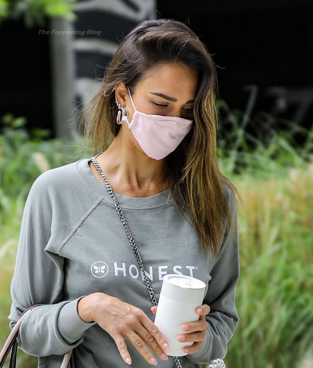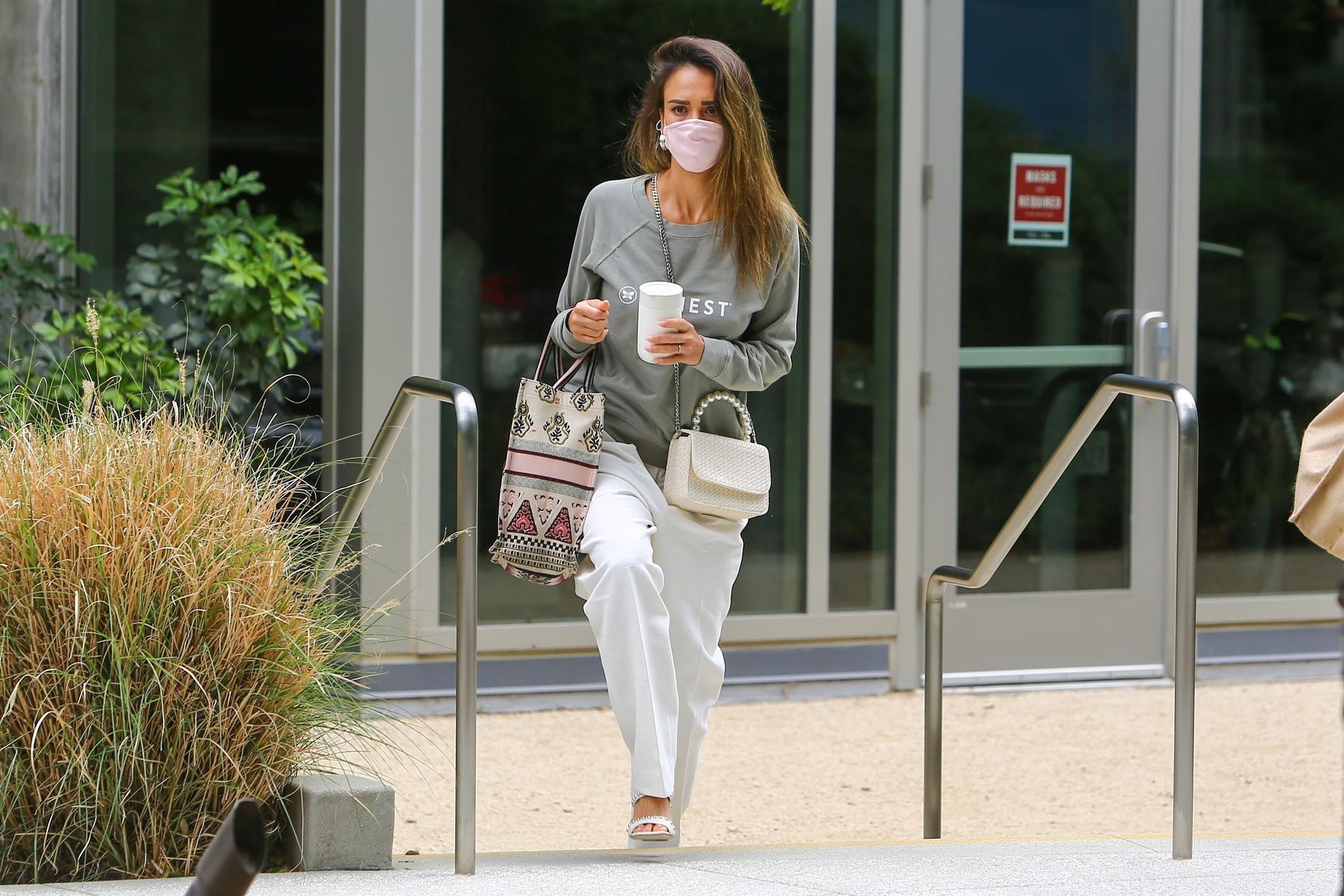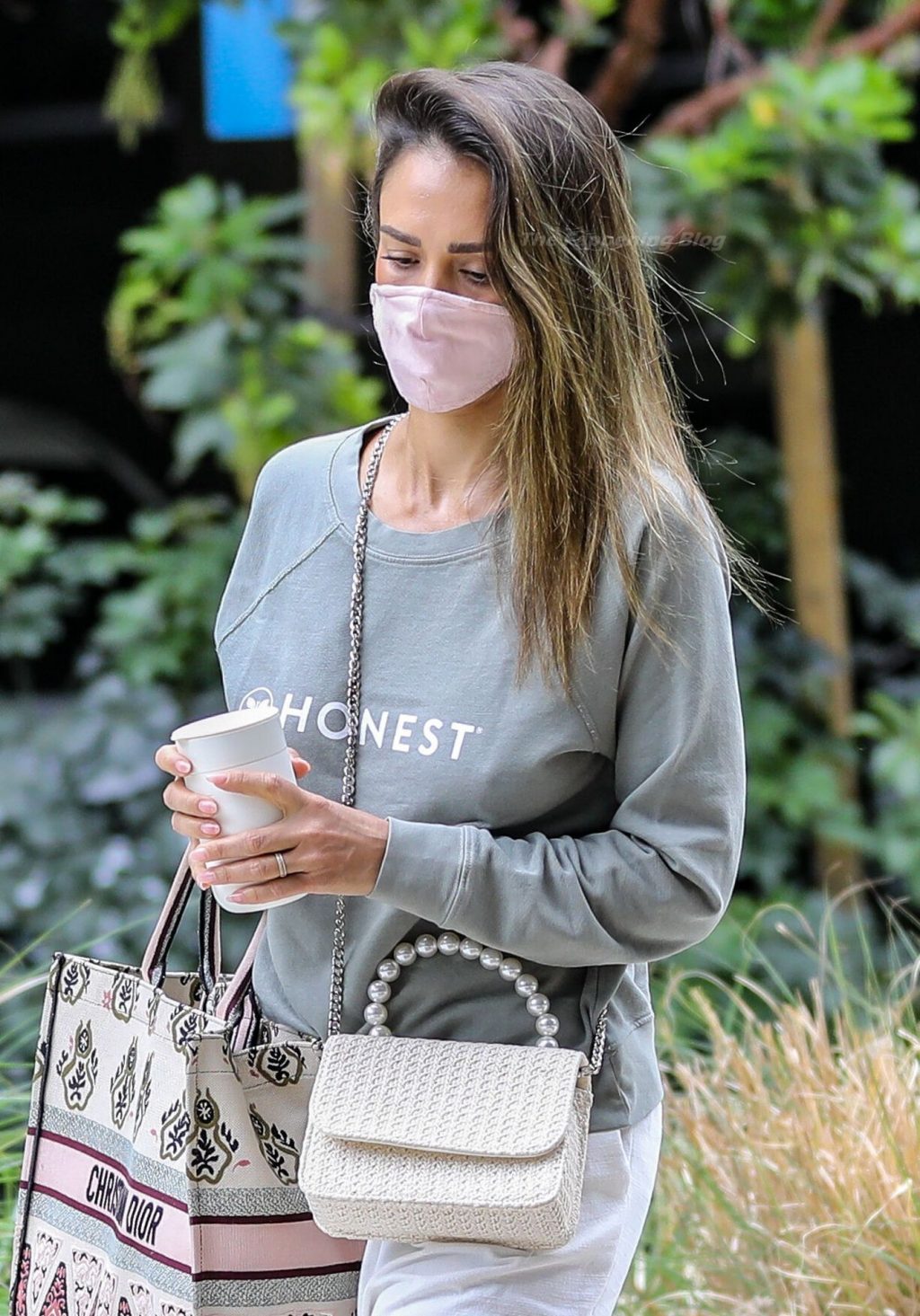 A atriz Jessica Alba chega ao seu escritório vestindo um moletom Honest um dia depois que as ações da empresa caíram abaixo do preço de IPO de US$ 16 – Playa Vista, 12/05/2021.