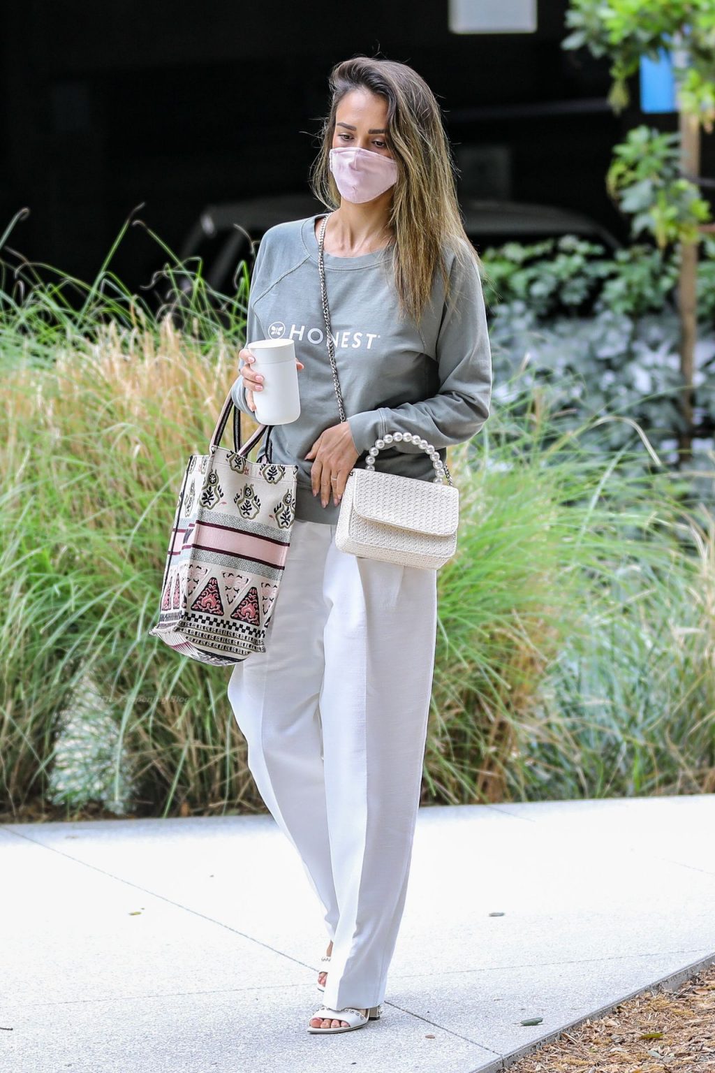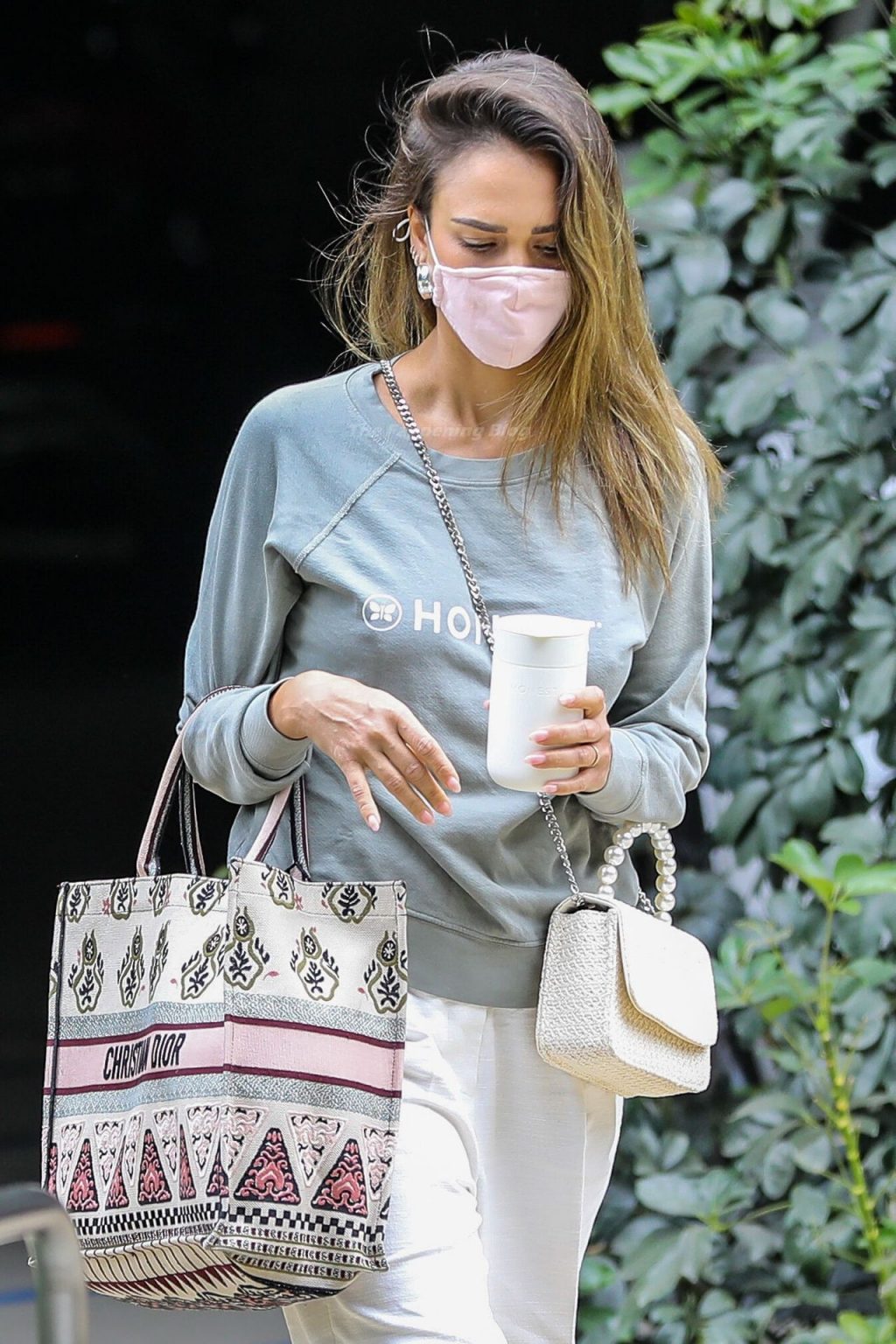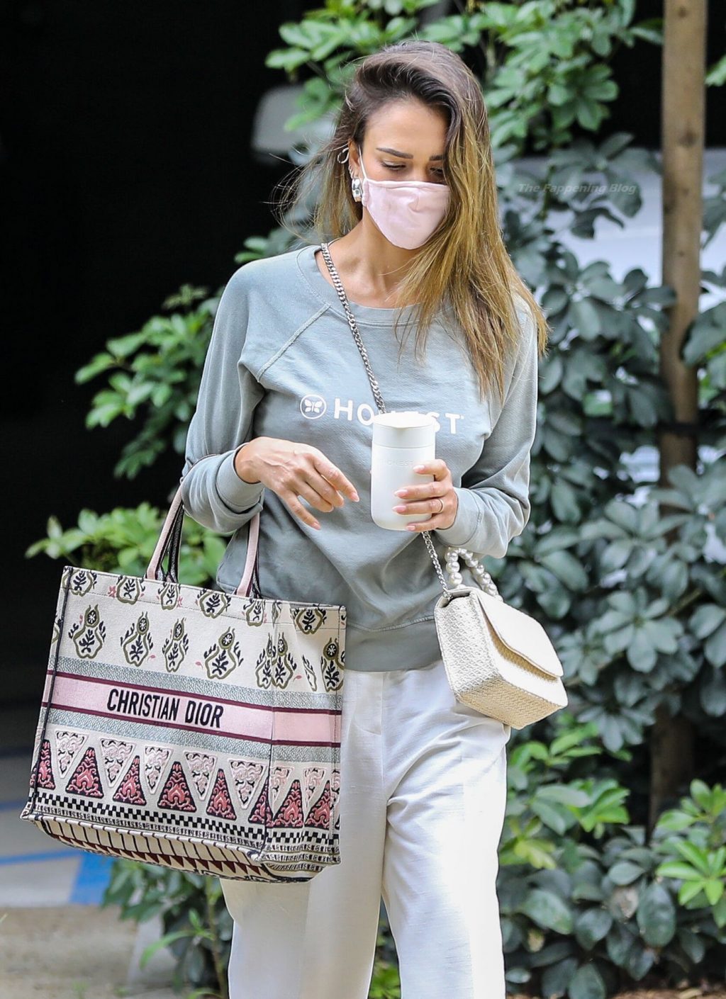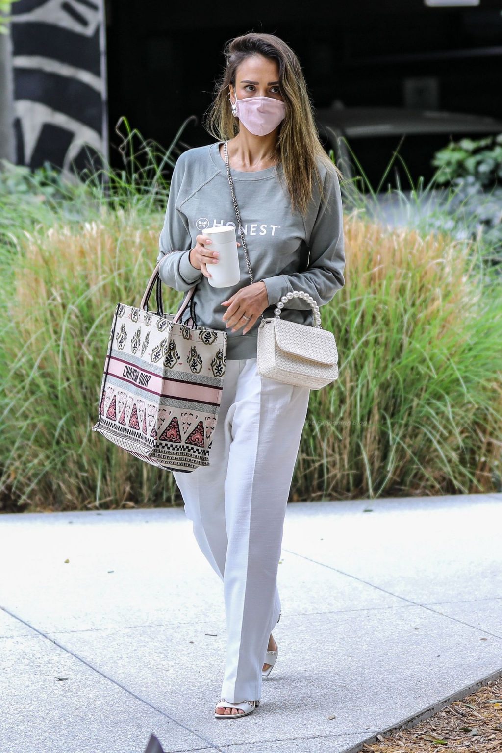 A atriz Jessica Alba chega ao seu escritório vestindo um moletom Honest um dia depois que as ações da empresa caíram abaixo do preço de IPO de US$ 16 – Playa Vista, 12/05/2021.