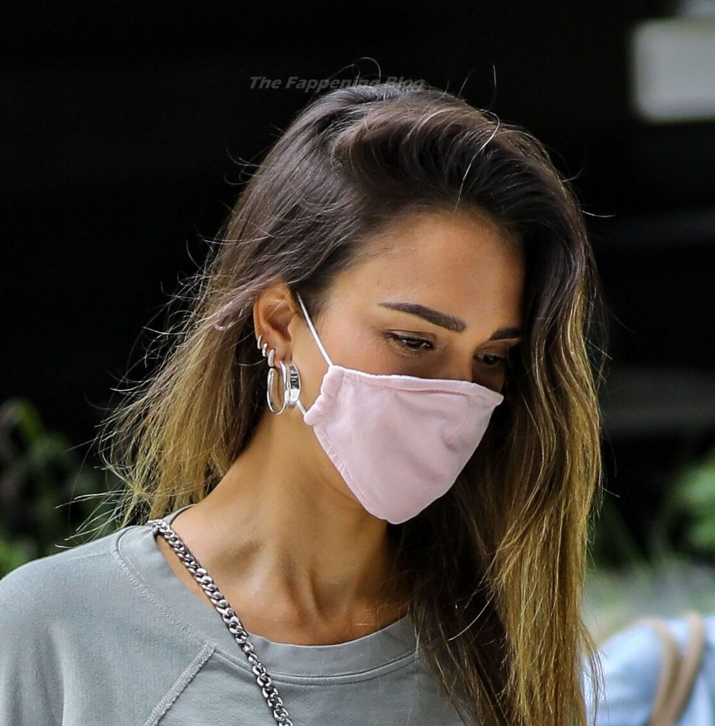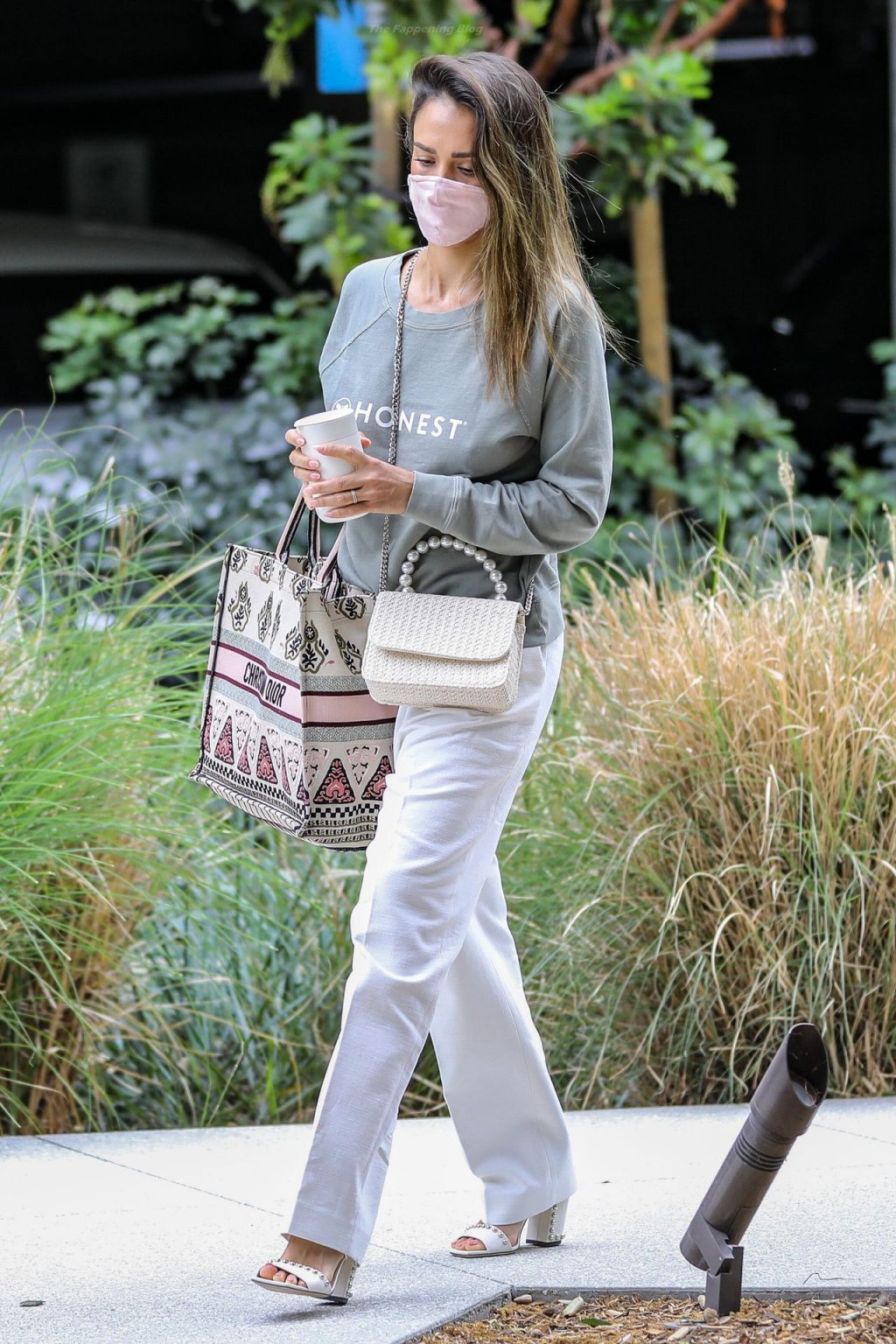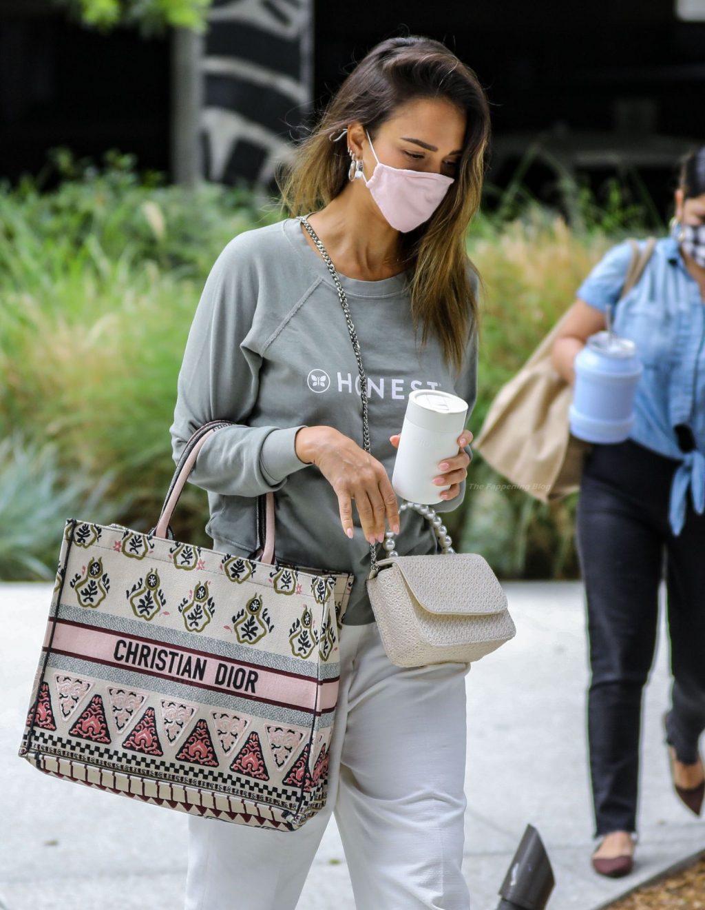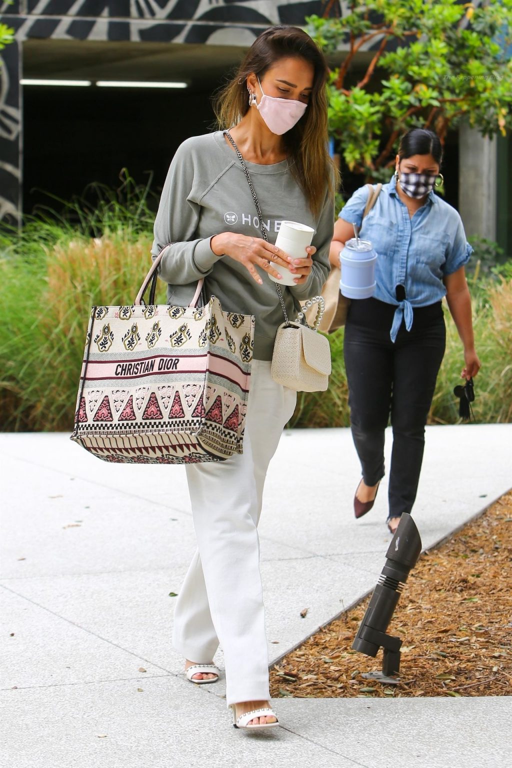 A atriz Jessica Alba chega ao seu escritório vestindo um moletom Honest um dia depois que as ações da empresa caíram abaixo do preço de IPO de US$ 16 – Playa Vista, 12/05/2021.
