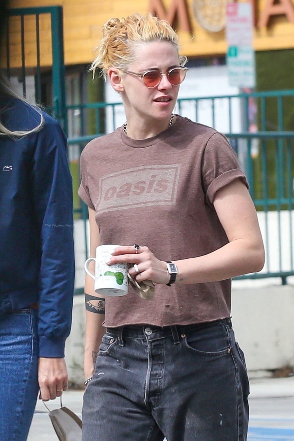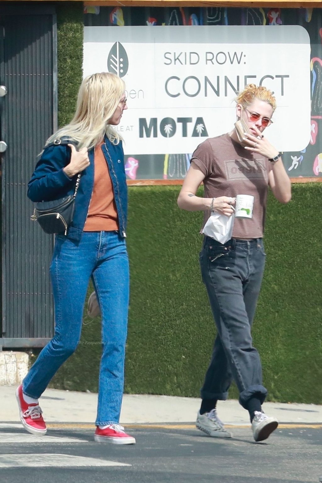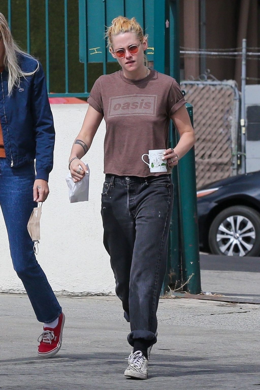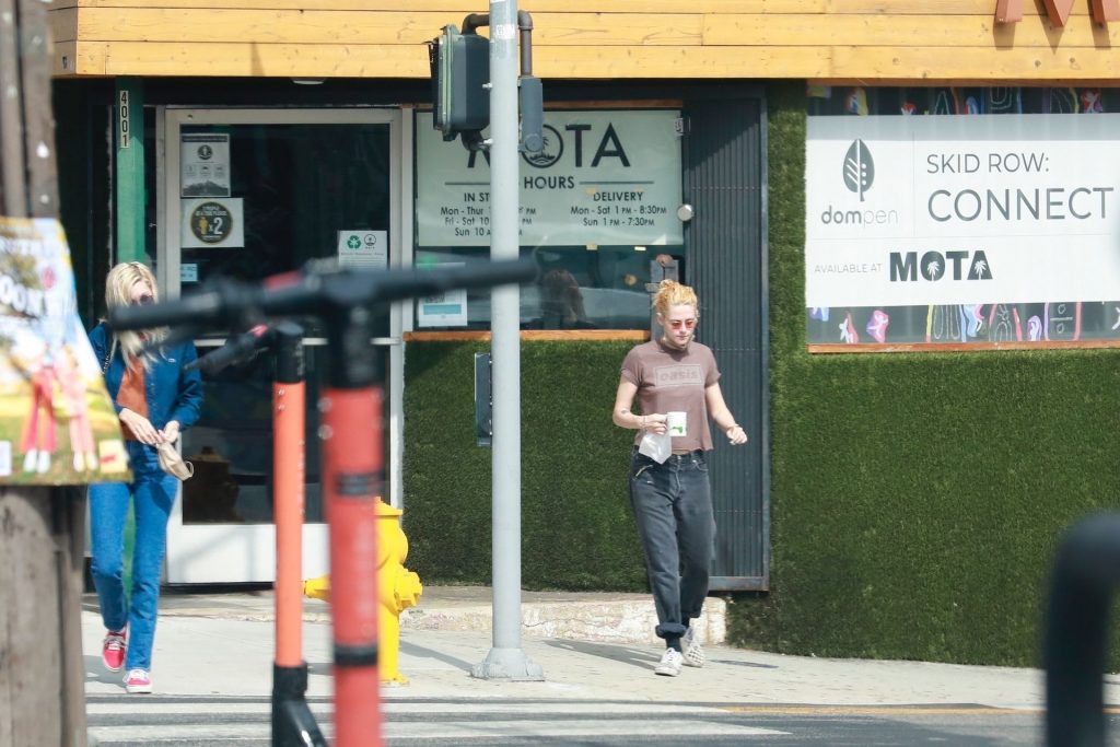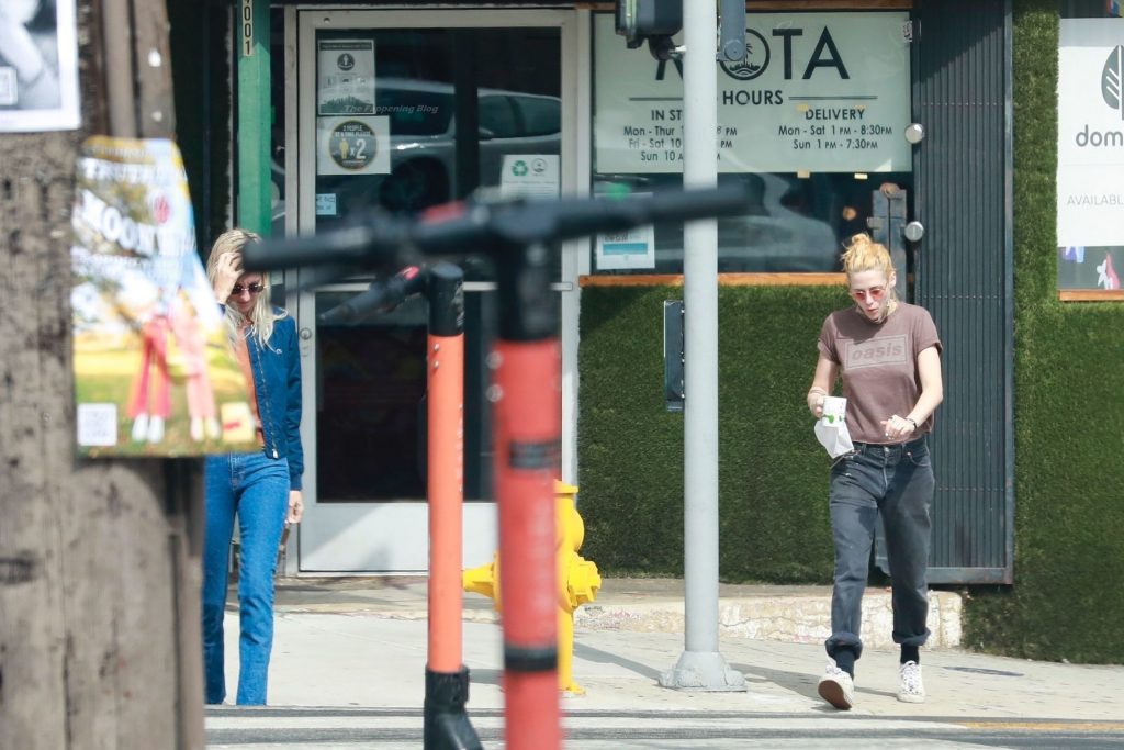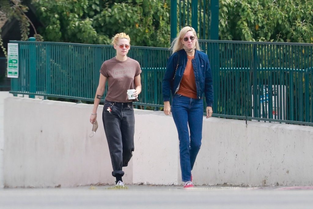 A estrela de The Fappening Kristen Stewart e Dylan Meyer passam pela MOTA – Medicine Of The Angels, 18/09/2021. K-Stew usava uma camiseta legal da banda Oasis com jeans escuro e tênis branco.
