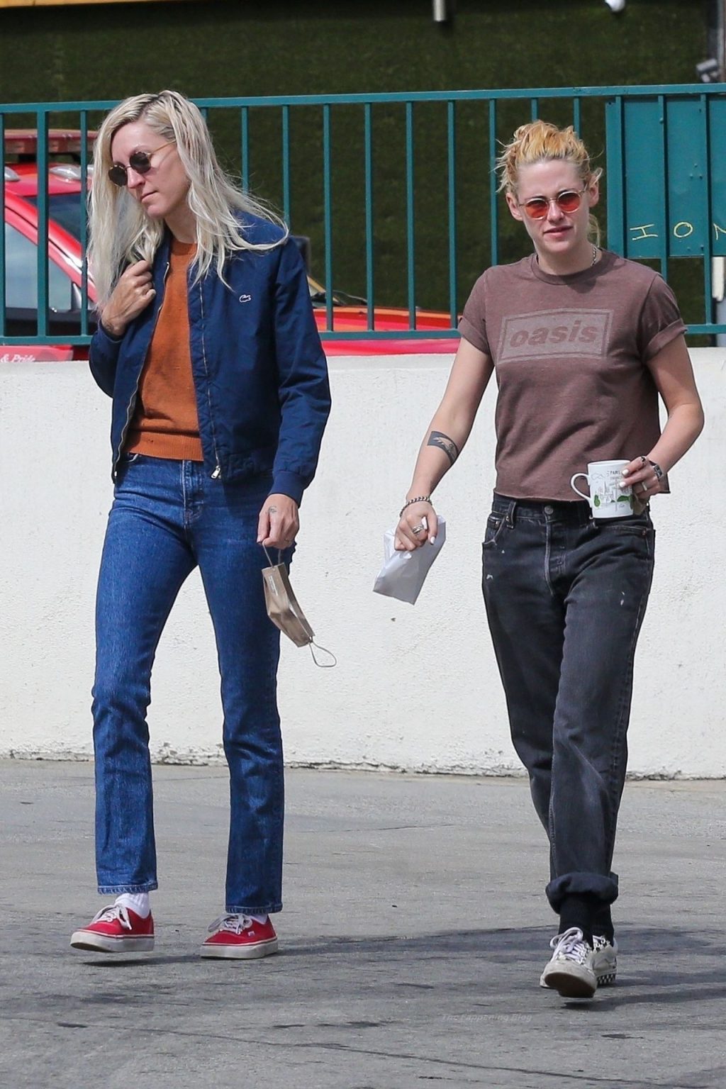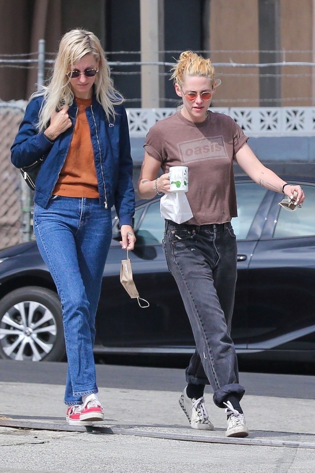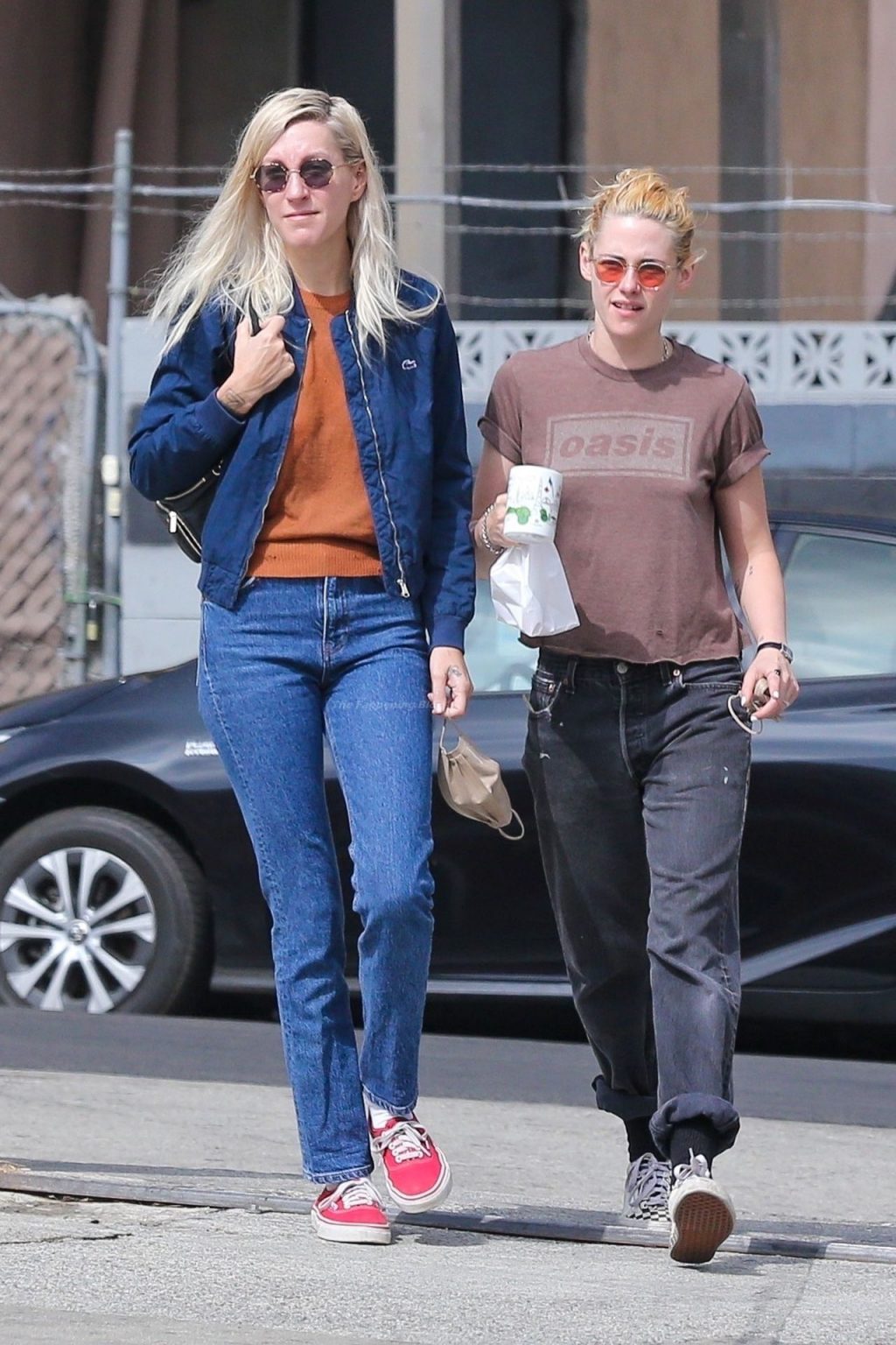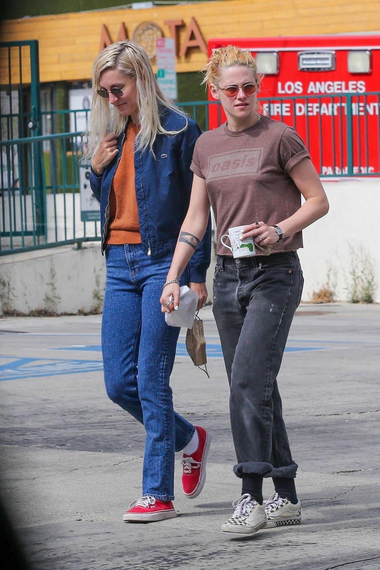 A estrela de The Fappening Kristen Stewart e Dylan Meyer passam pela MOTA – Medicine Of The Angels, 18/09/2021. K-Stew usava uma camiseta legal da banda Oasis com jeans escuro e tênis branco.