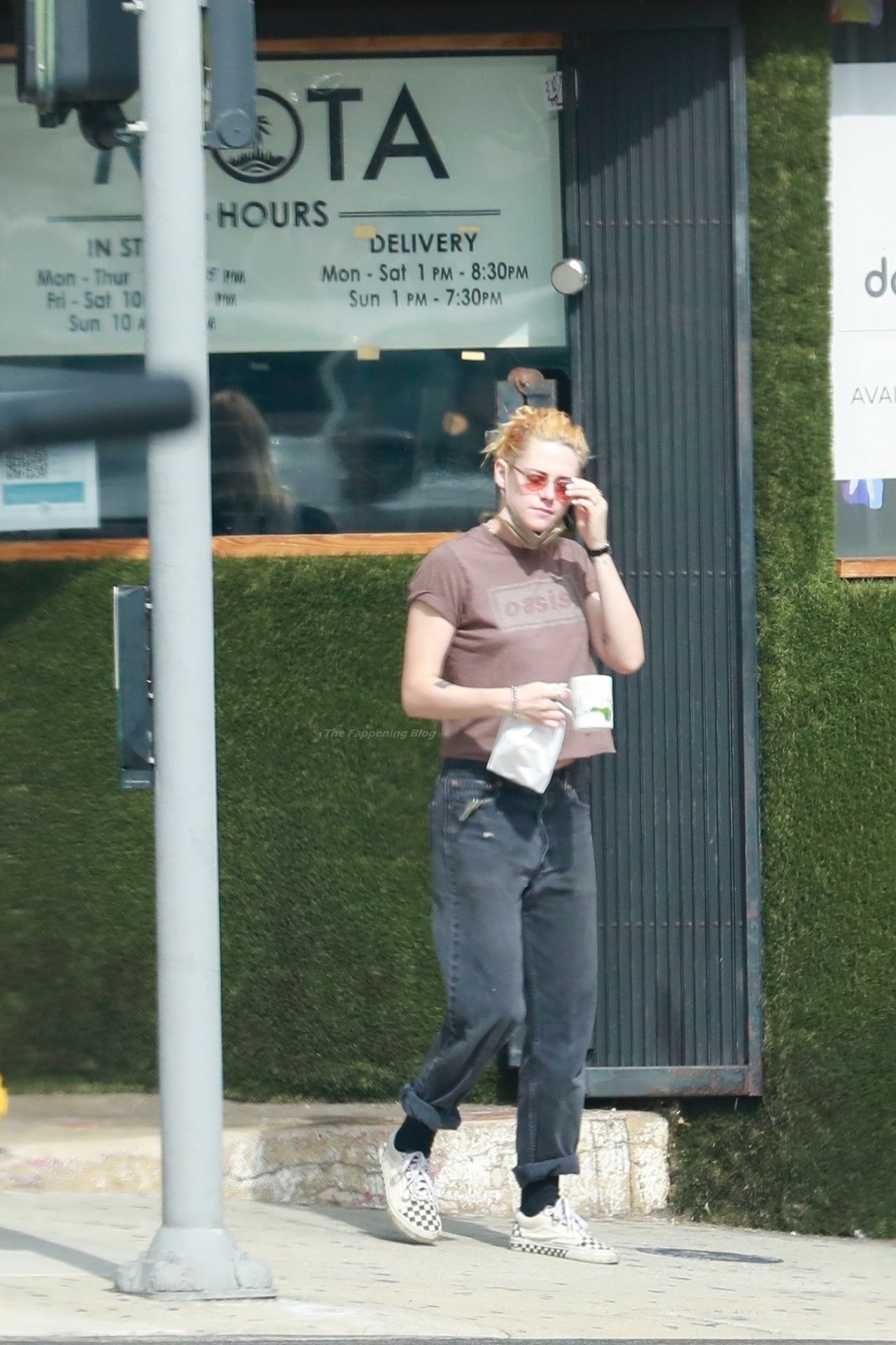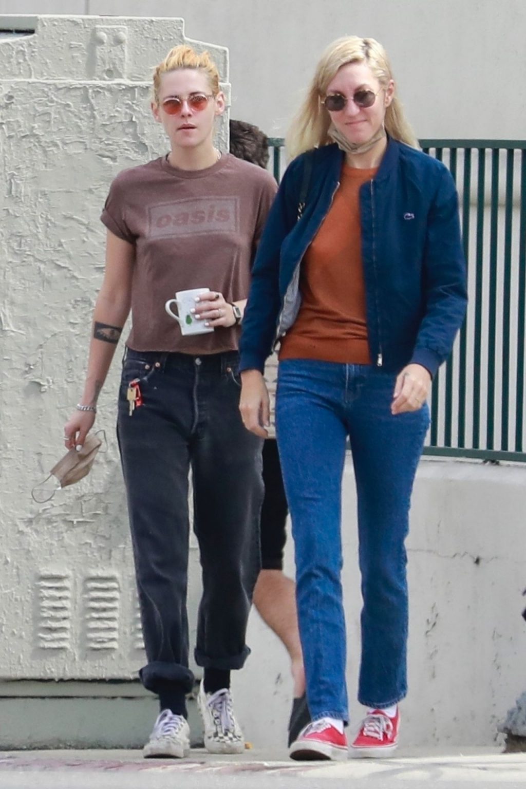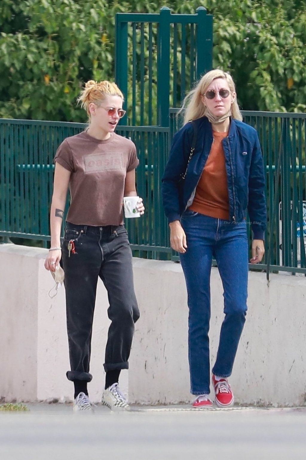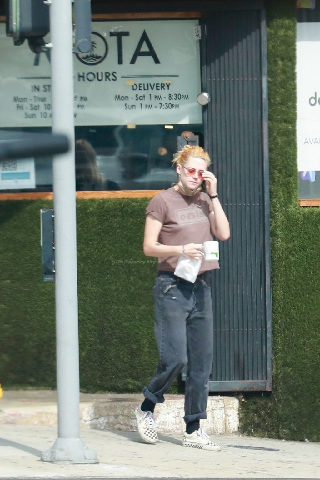 A estrela de The Fappening Kristen Stewart e Dylan Meyer passam pela MOTA – Medicine Of The Angels, 18/09/2021. K-Stew usava uma camiseta legal da banda Oasis com jeans escuro e tênis branco.
