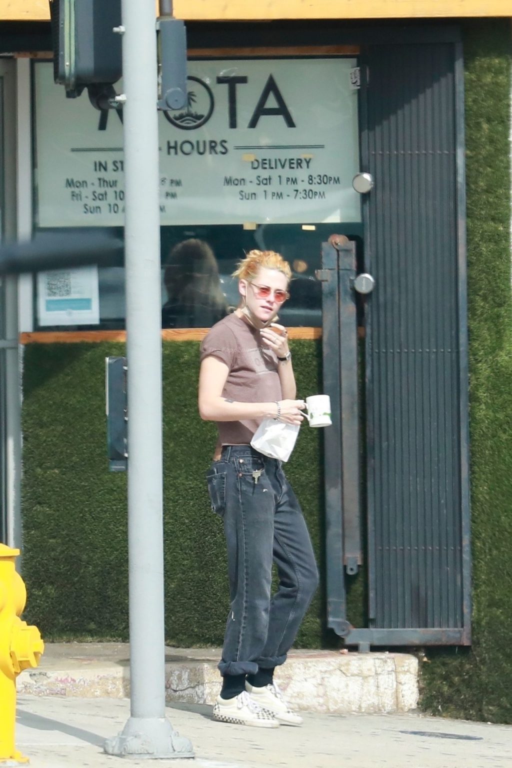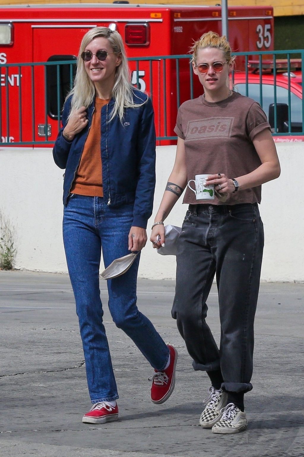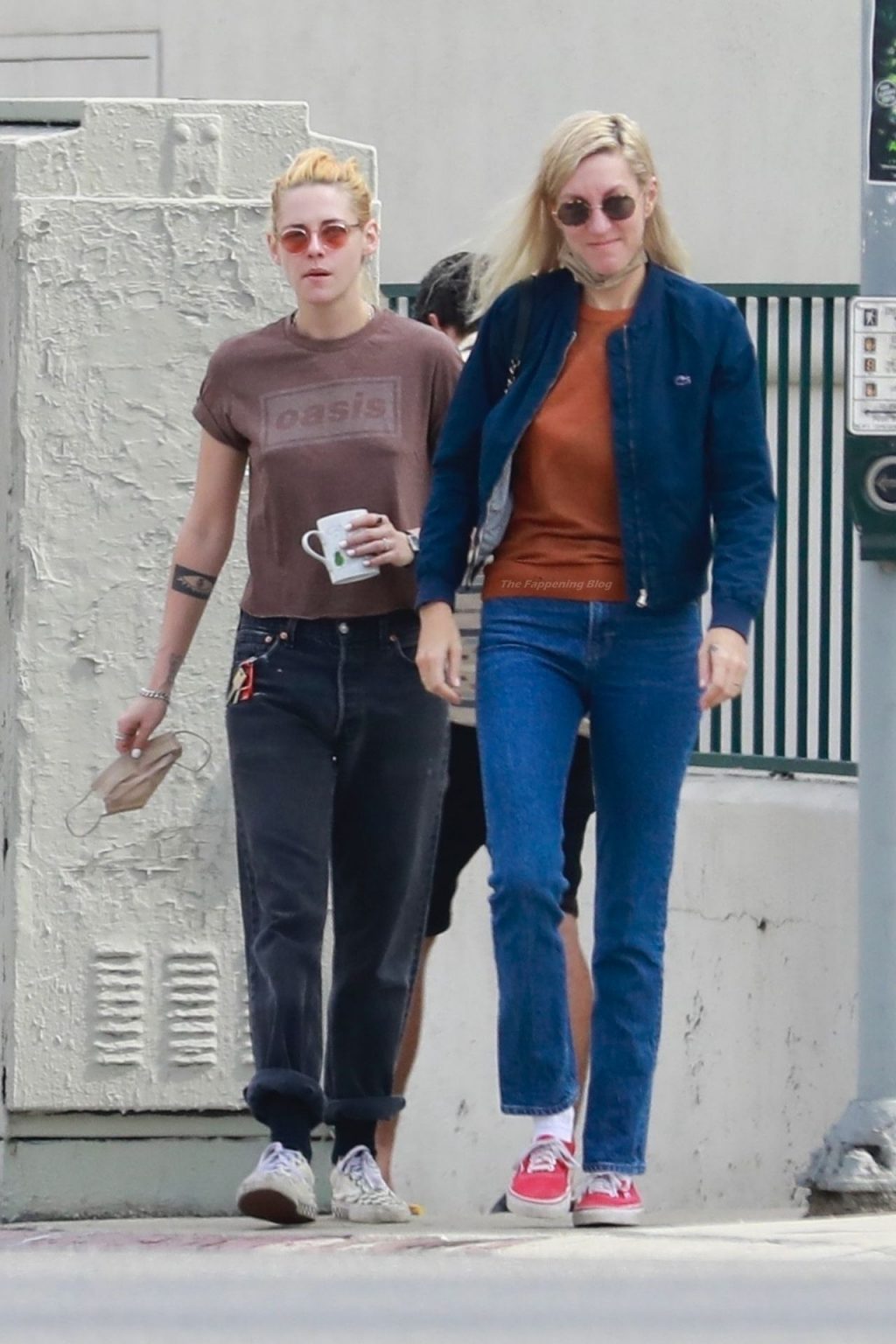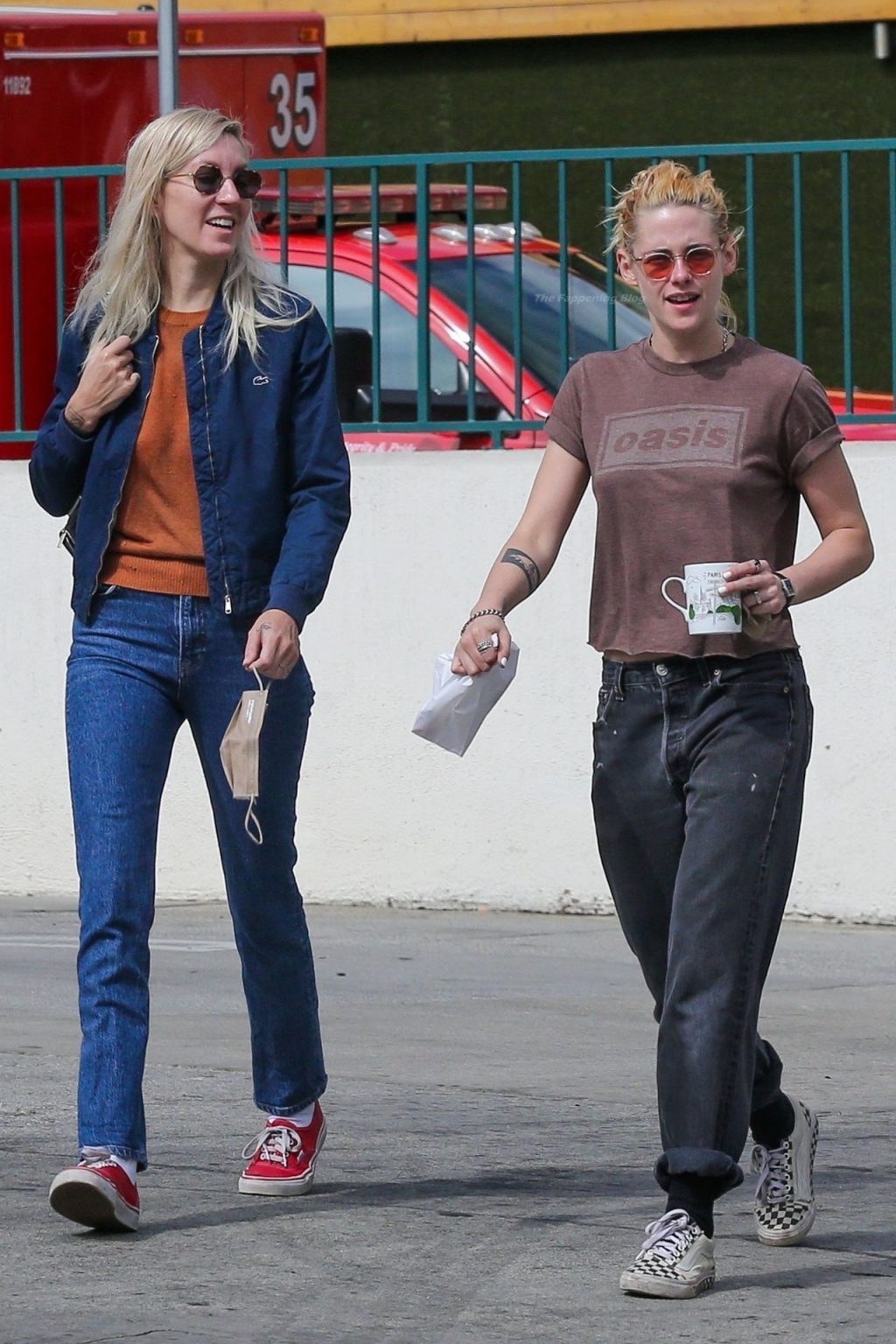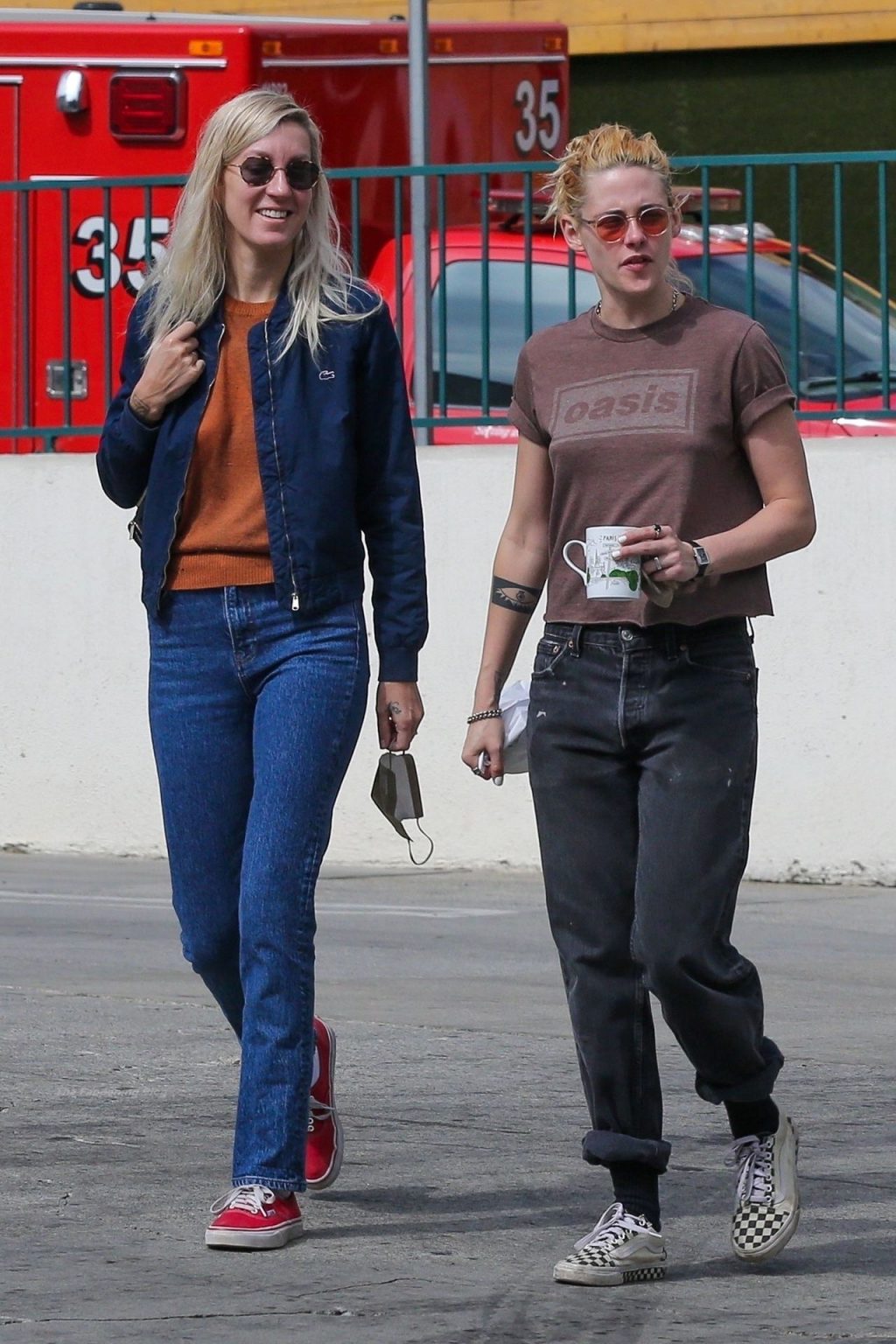 A estrela de The Fappening Kristen Stewart e Dylan Meyer passam pela MOTA – Medicine Of The Angels, 18/09/2021. K-Stew usava uma camiseta legal da banda Oasis com jeans escuro e tênis branco.