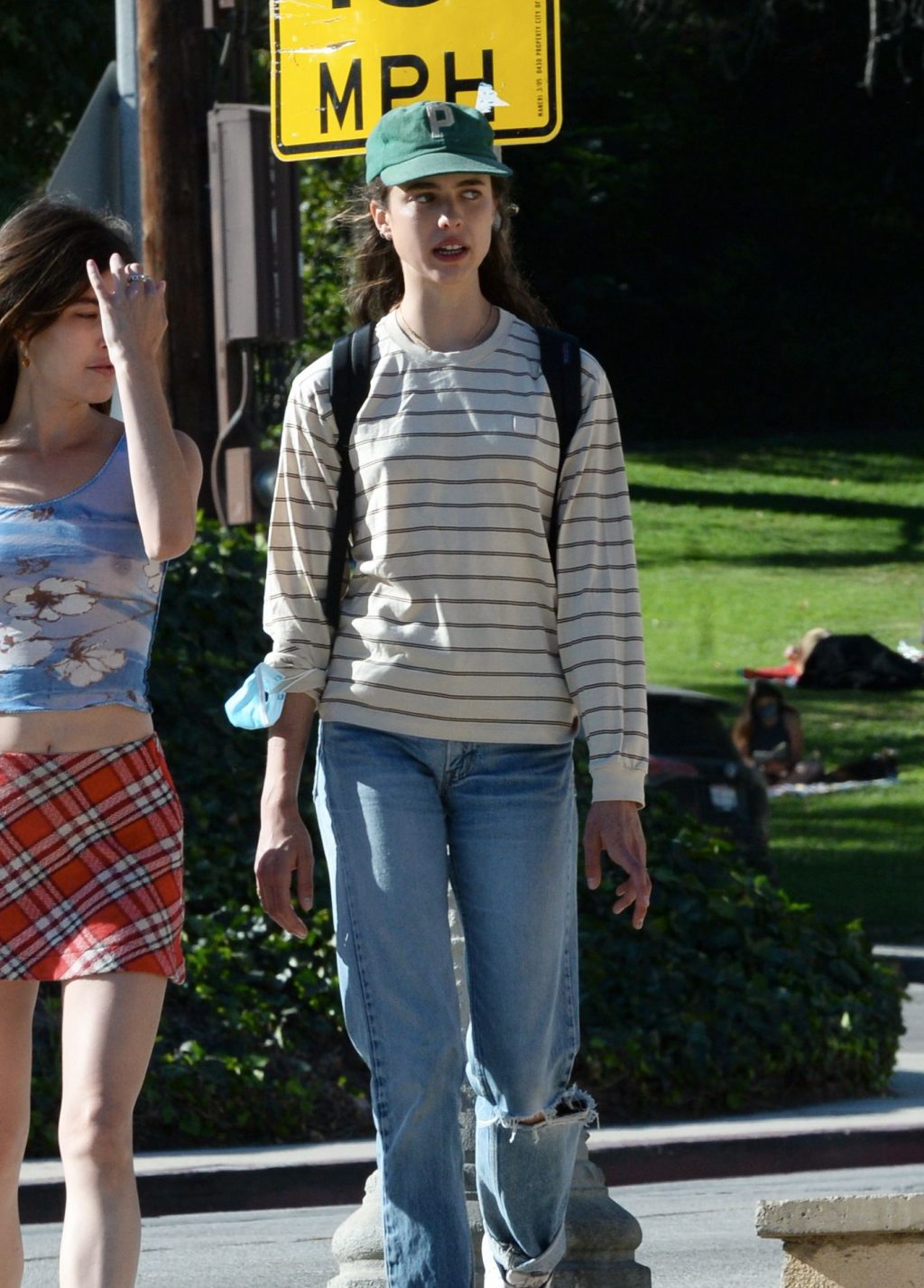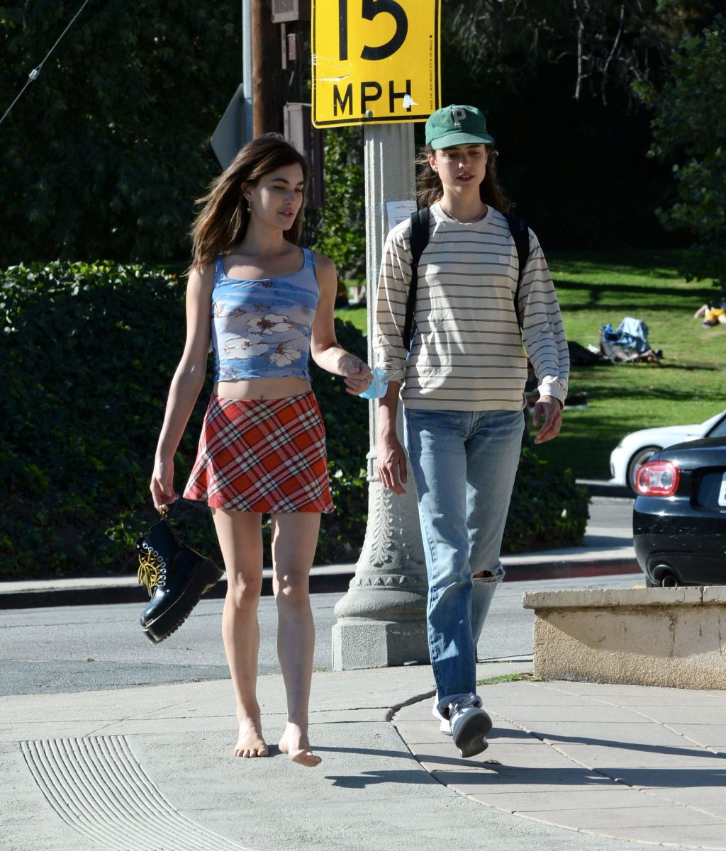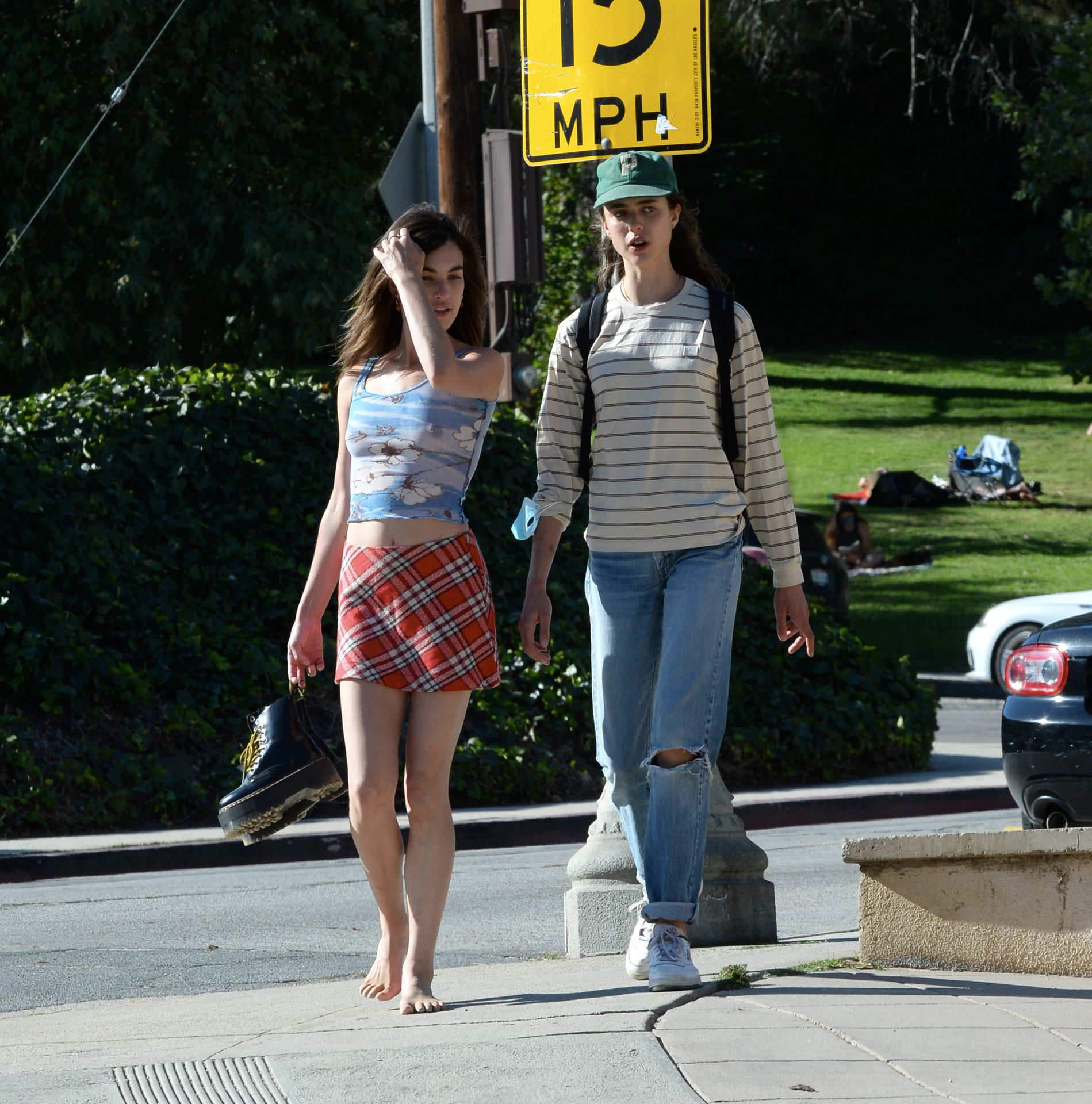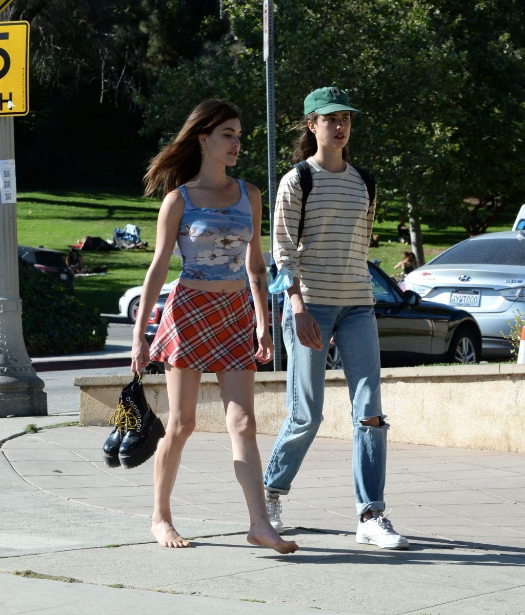 Margaret Qualley foi vista passeando com sua irmã Rainey, que mostrou seus seios sem sutiã em Silverlake, Los Angeles, 13/06/2020.