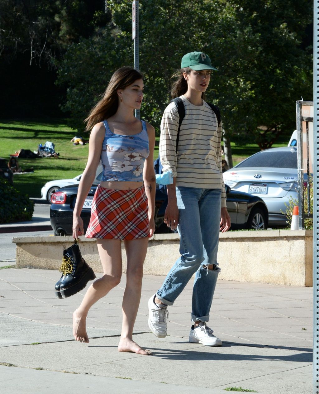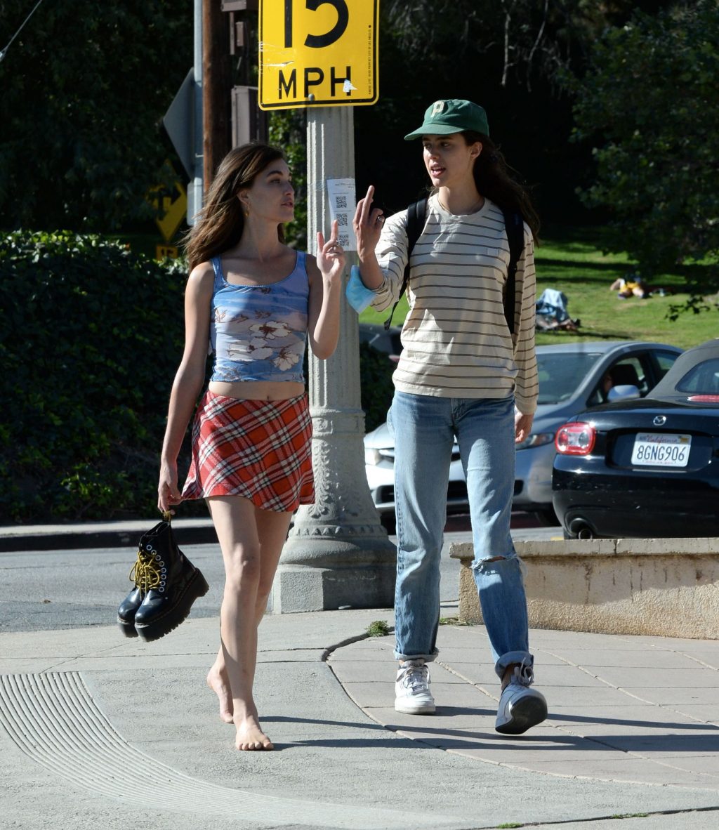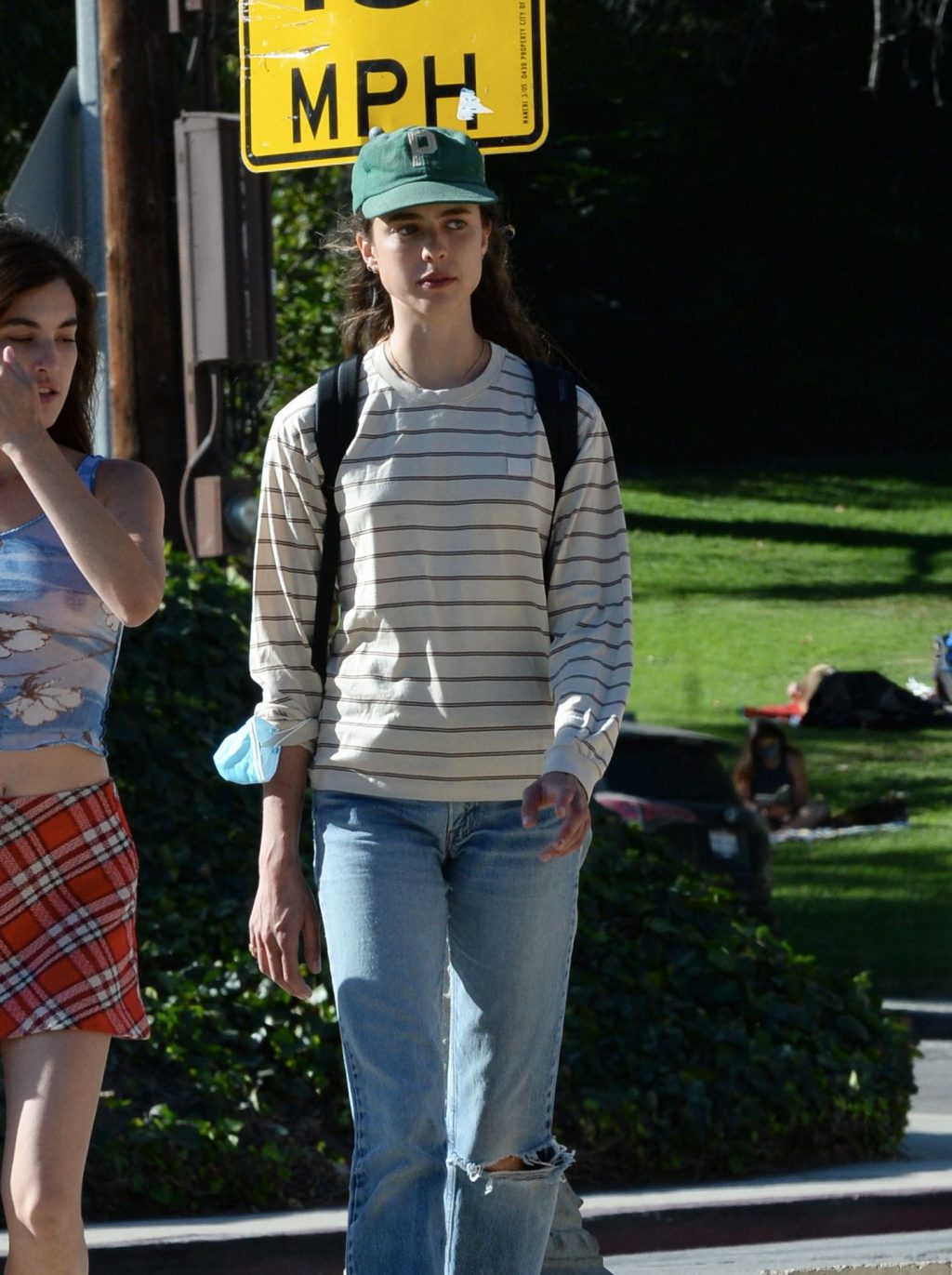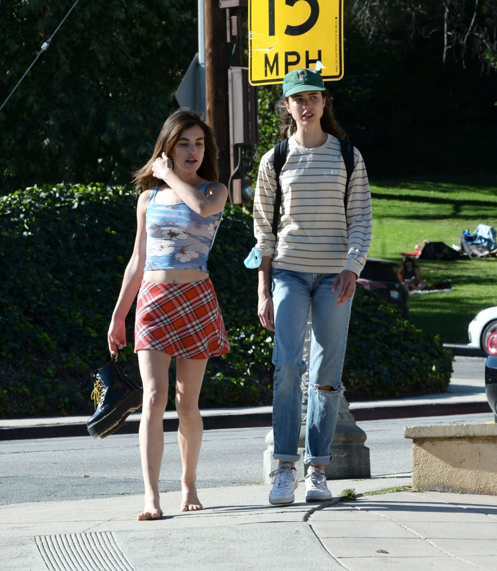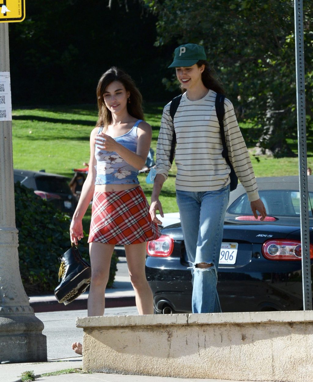 Margaret Qualley foi vista passeando com sua irmã Rainey, que mostrou seus seios sem sutiã em Silverlake, Los Angeles, 13/06/2020.