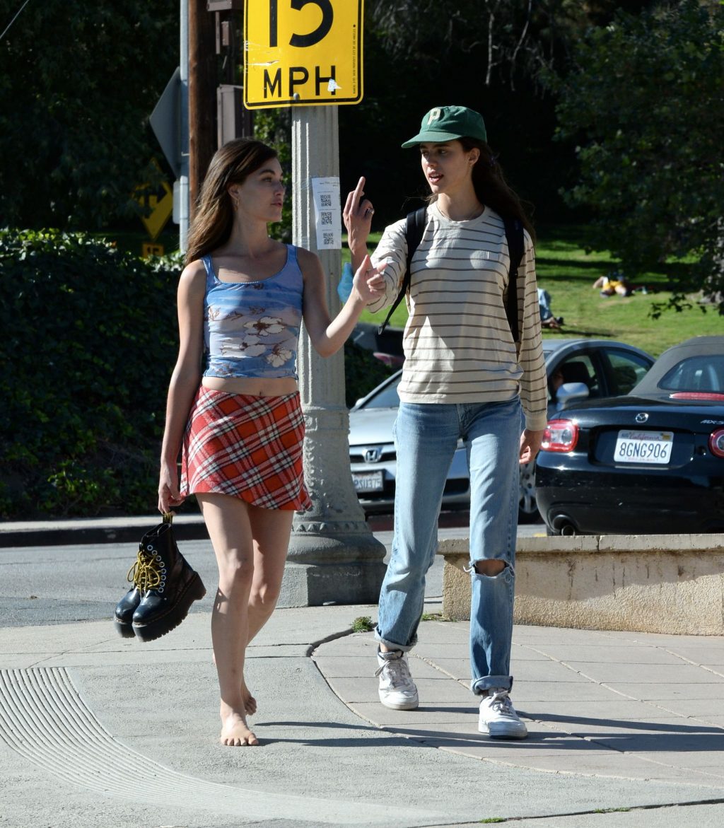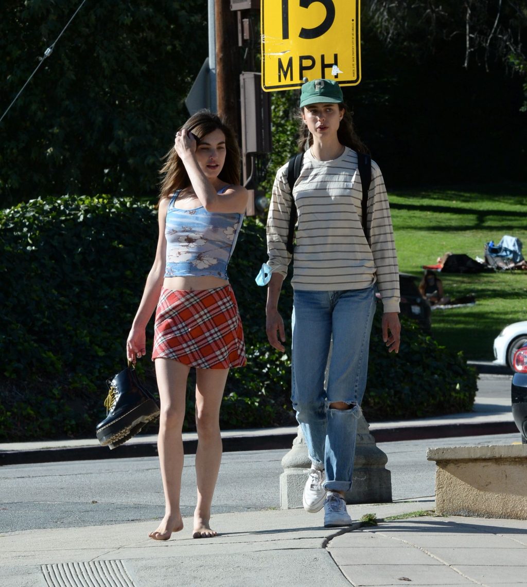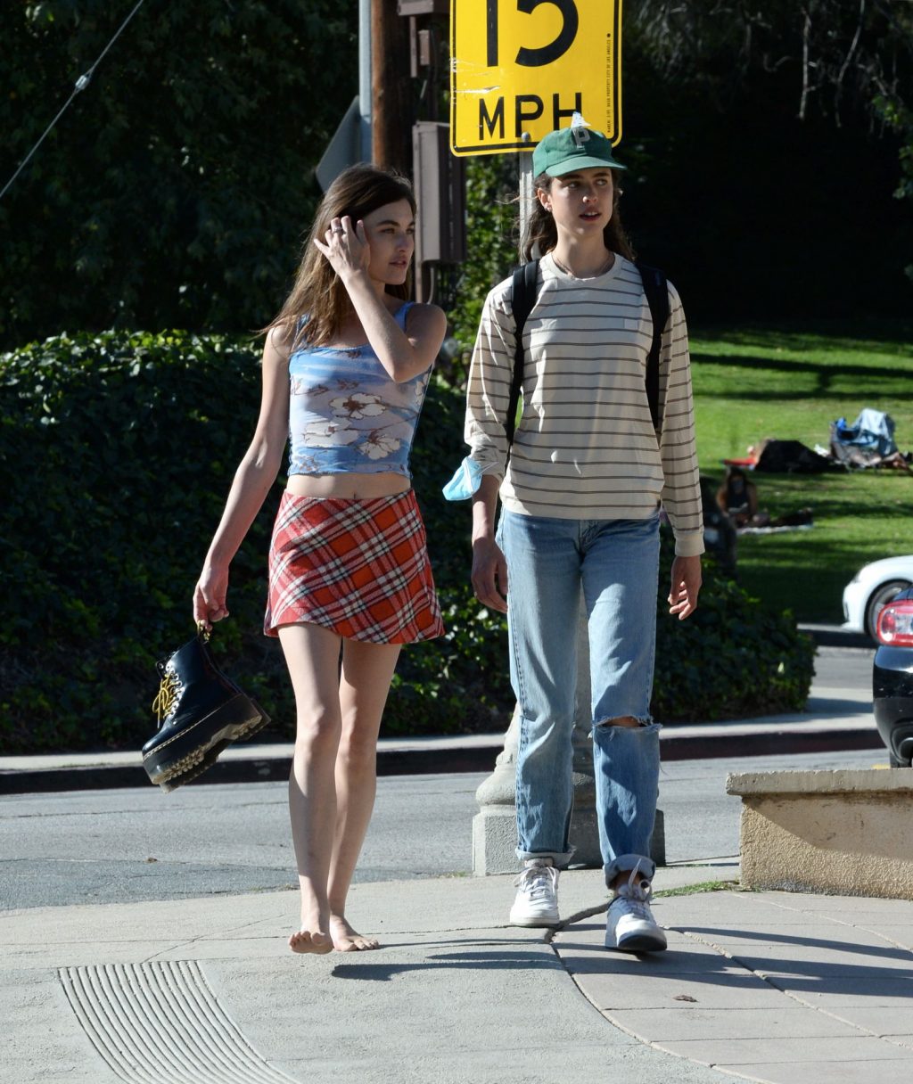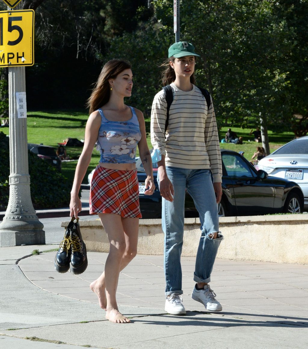 Margaret Qualley foi vista passeando com sua irmã Rainey, que mostrou seus seios sem sutiã em Silverlake, Los Angeles, 13/06/2020.