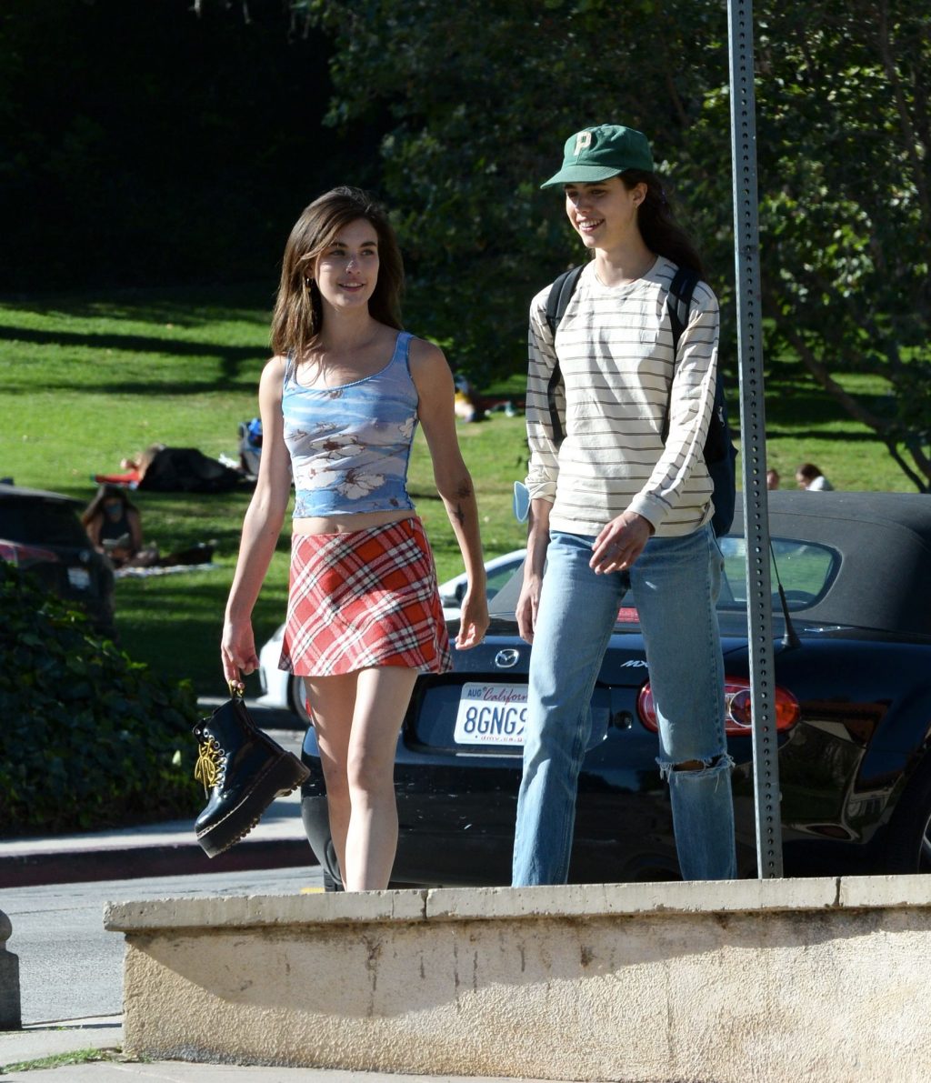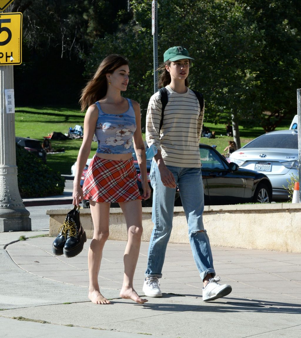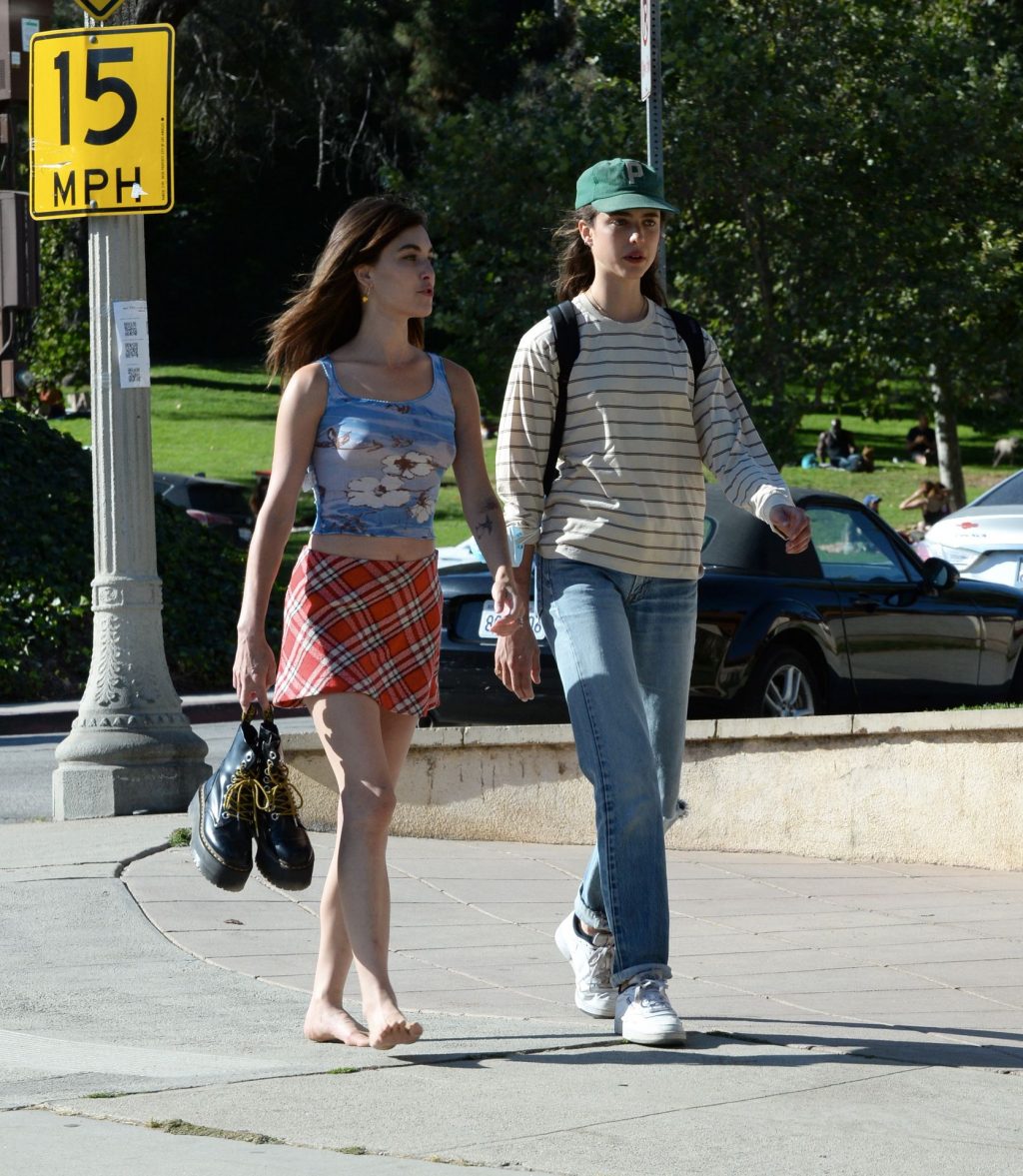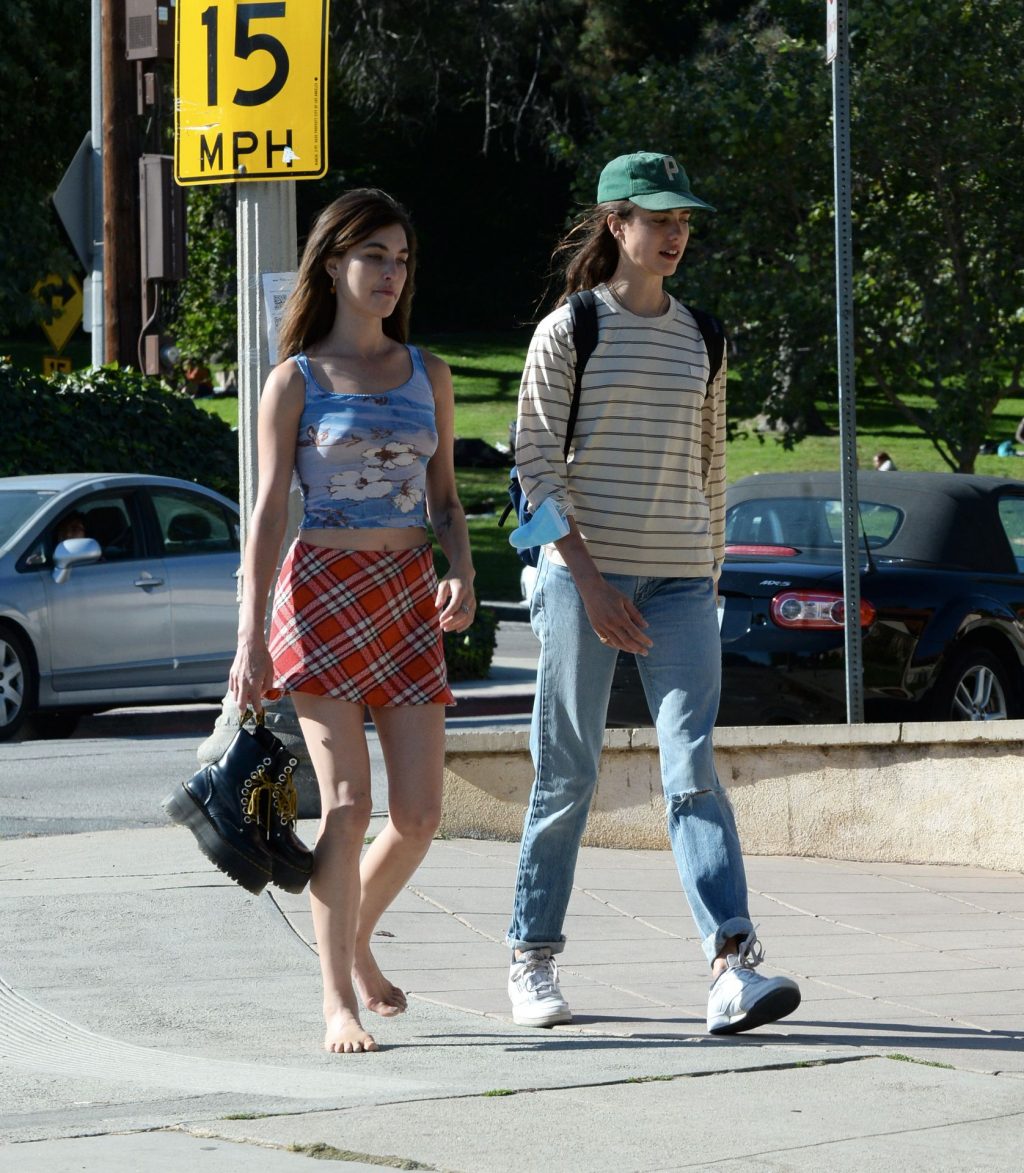 Margaret Qualley foi vista passeando com sua irmã Rainey, que mostrou seus seios sem sutiã em Silverlake, Los Angeles, 13/06/2020.