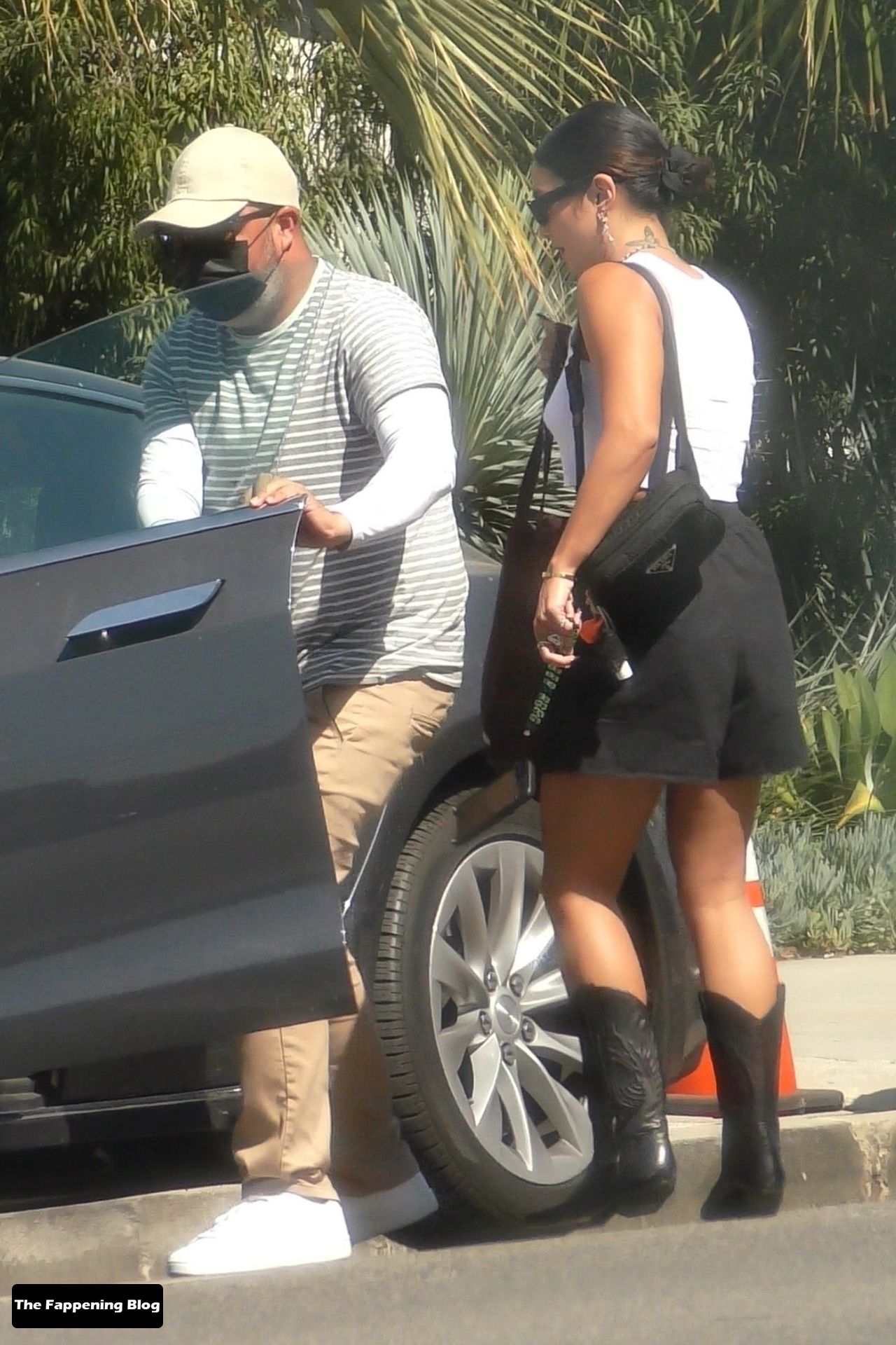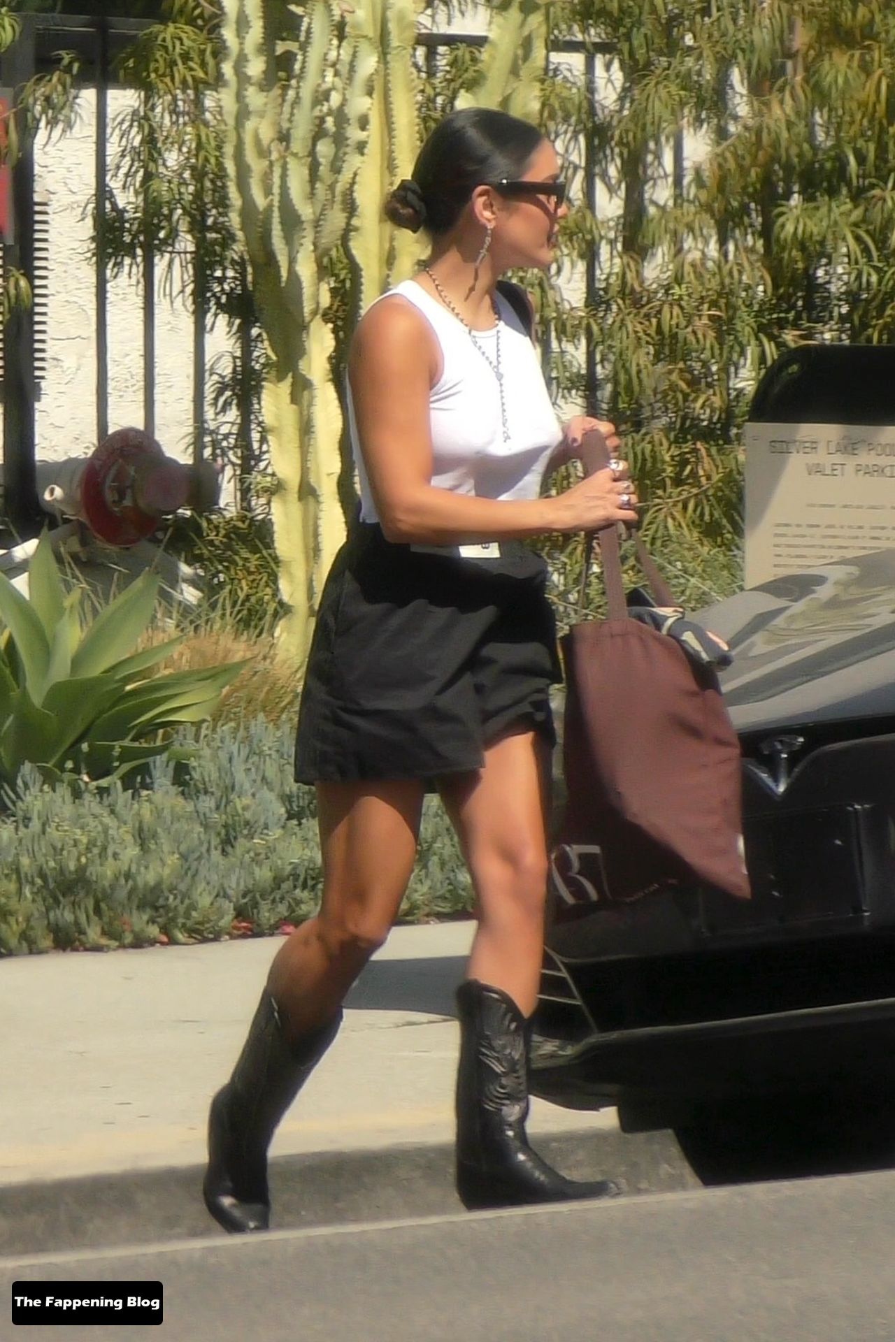 A estrela morena do Fappening usava o cabelo preso em um coque, uma regata branca e shorts pretos da Miu Miu combinando com suas botas de couro estilo cowgirl.