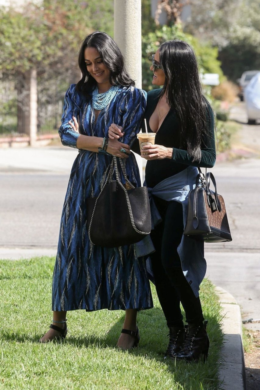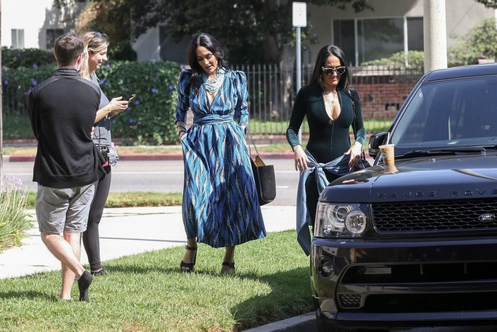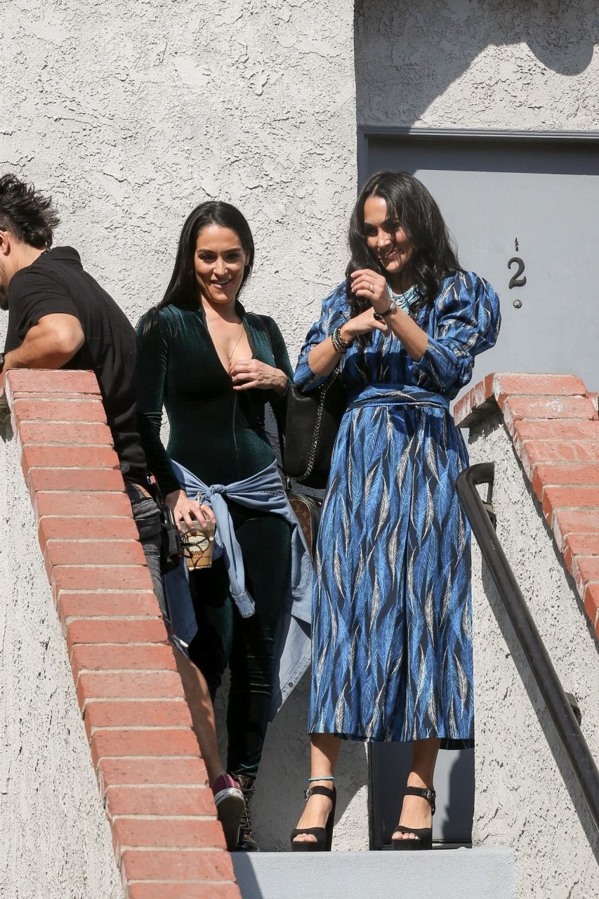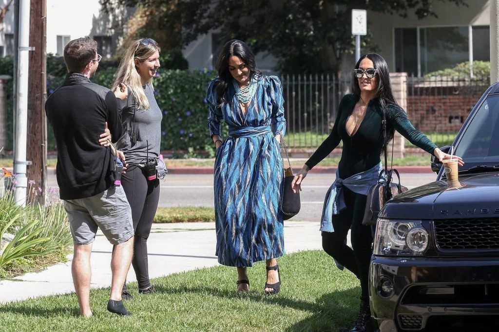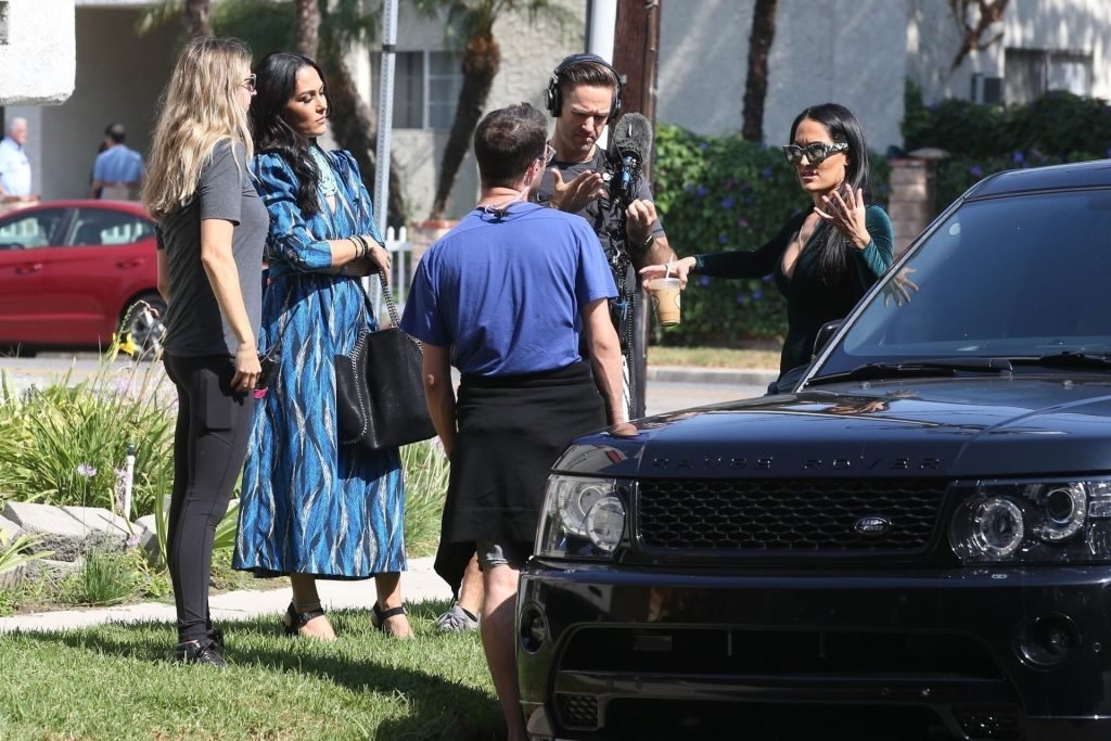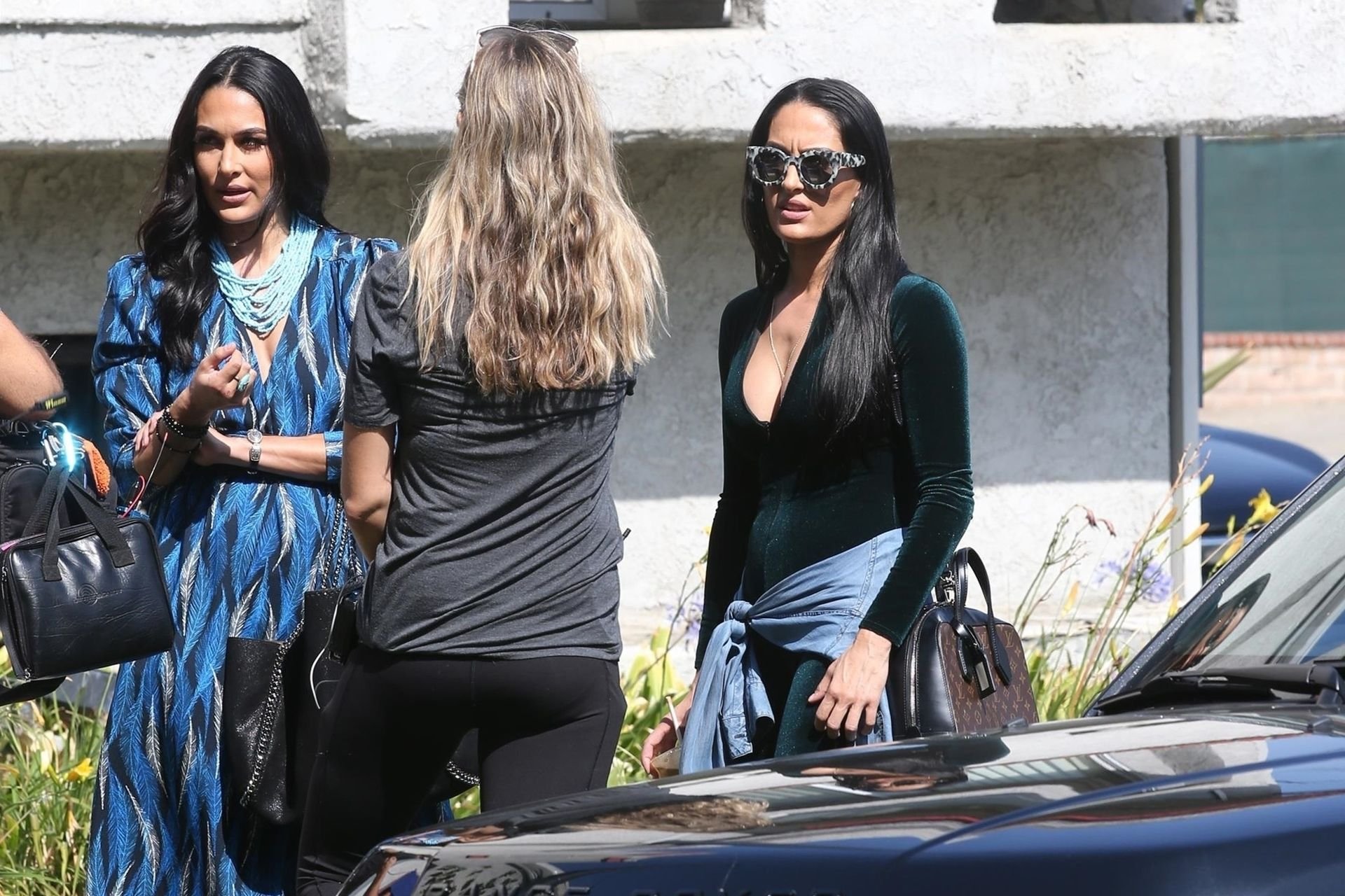 As irmãs lutadoras profissionais Nikki e Brie Bella chamam a atenção enquanto gravam cenas para seu reality show ‘Total Bellas’ em Los Angeles, 14/10/2019.