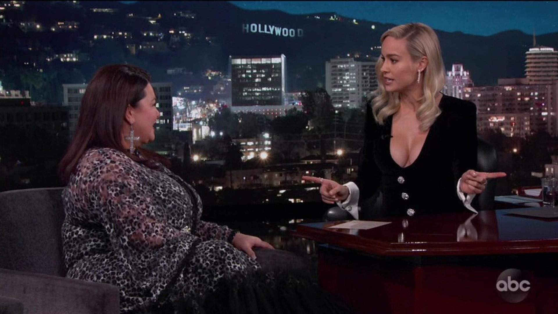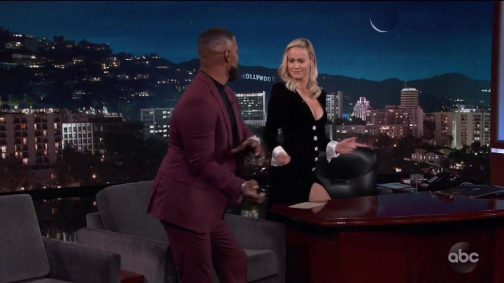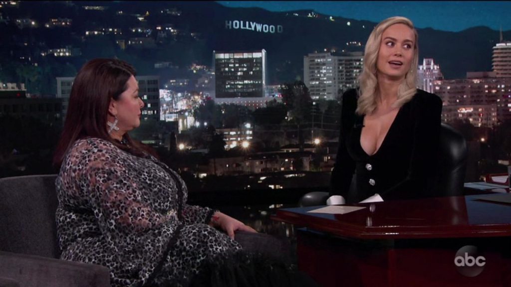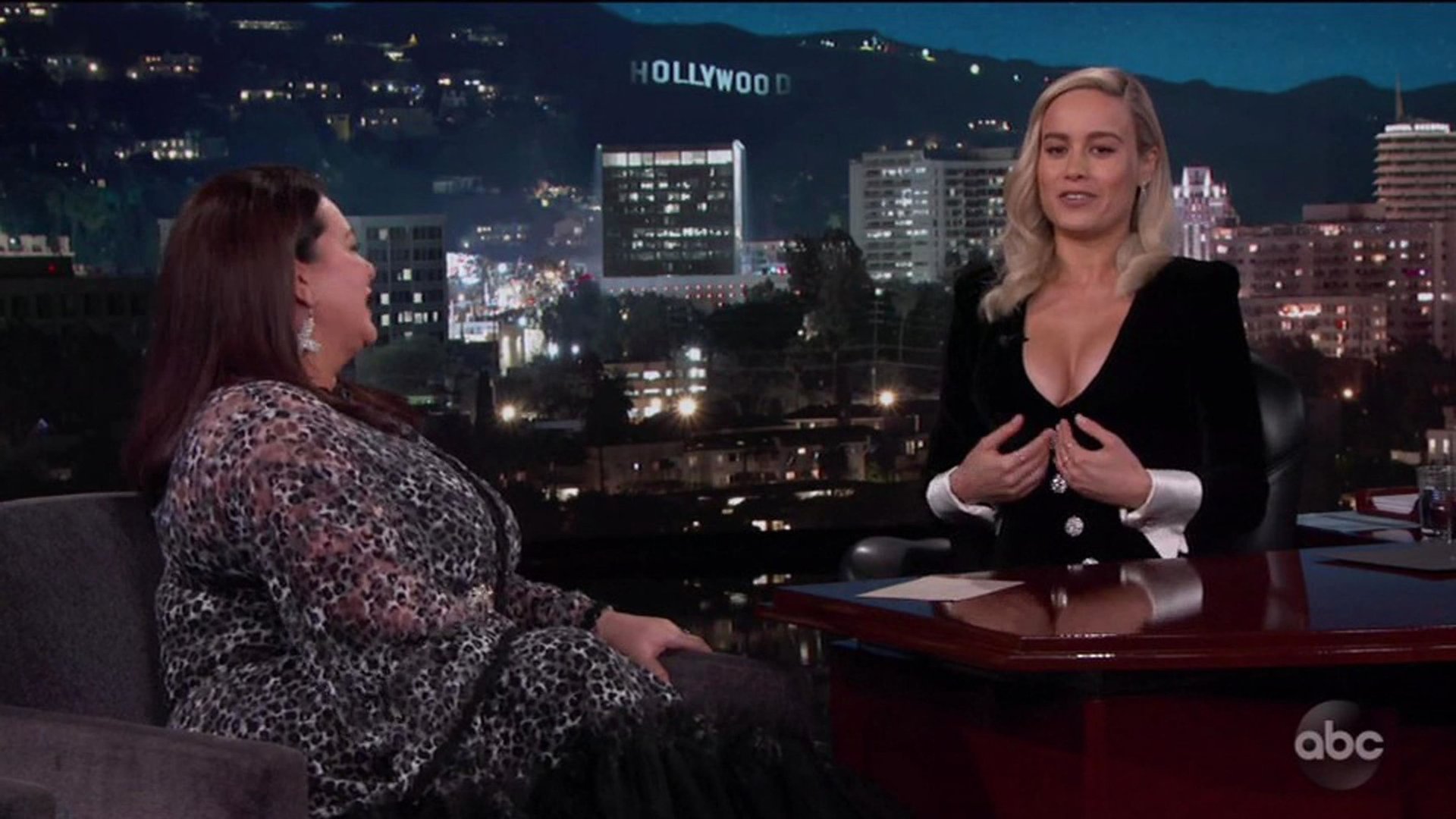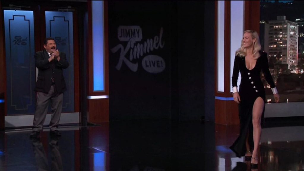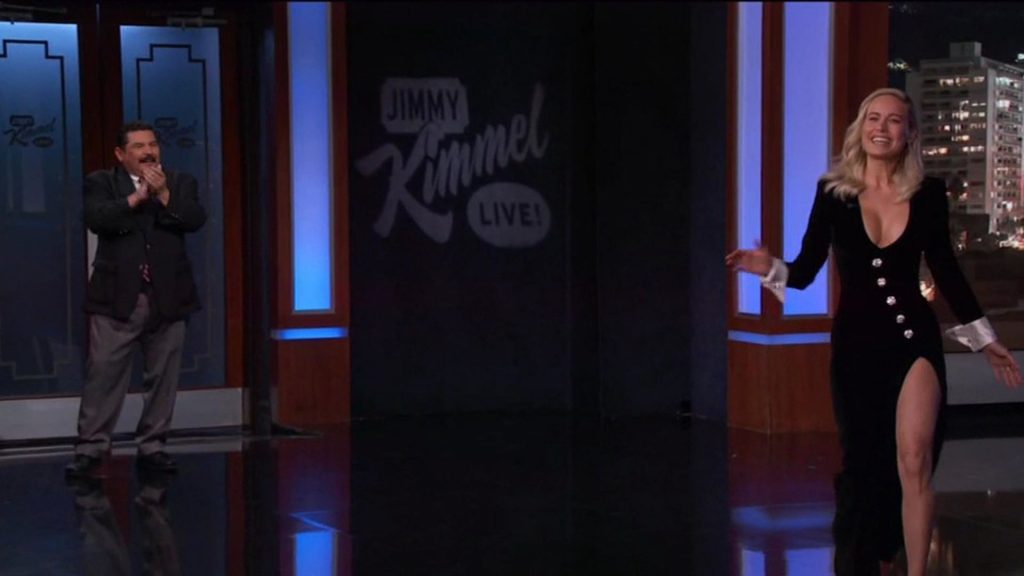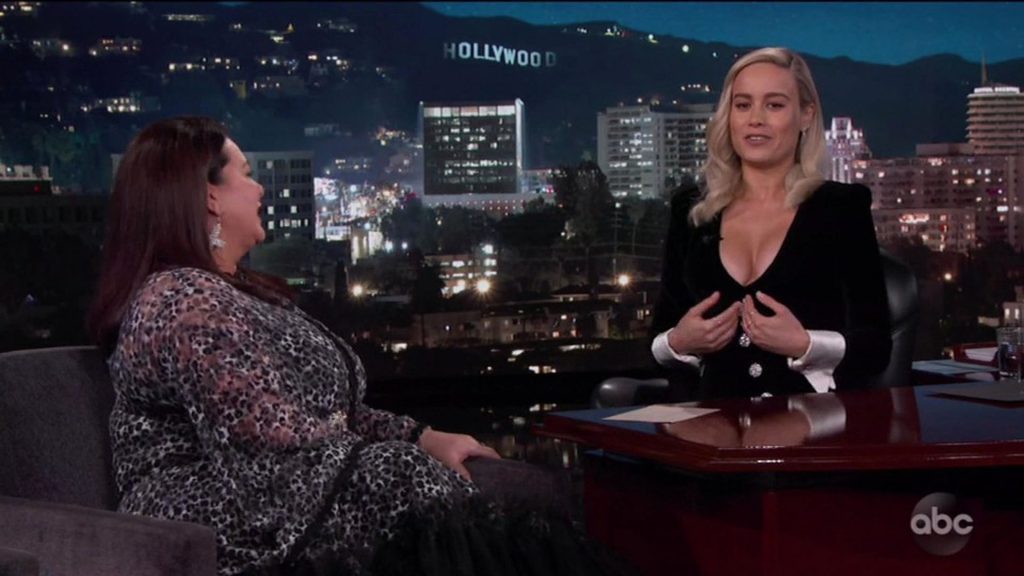 Brie Larson exibe seu deslumbrante peito 34D em um vestido incrivelmente decotado enquanto assume como apresentadora no Jimmy Kimmel Live, 19/11/2019. A estrela de Capitã Marvel e Fappening quase sofreu um problema de figurino enquanto apresentava o talk show noturno com um vestido preto deslumbrante que não só mostrava seus seios, mas também tinha uma fenda sexy até a coxa.