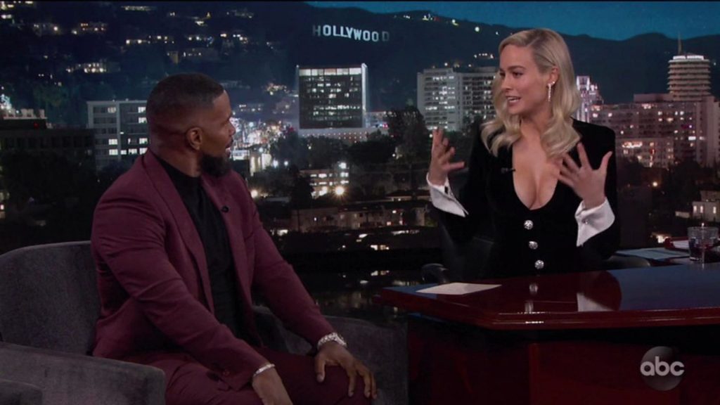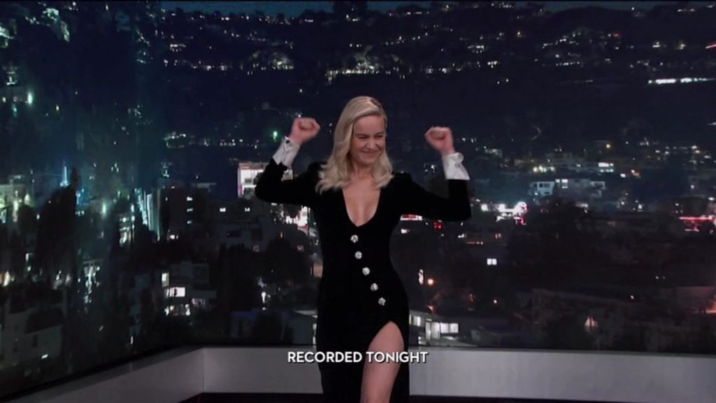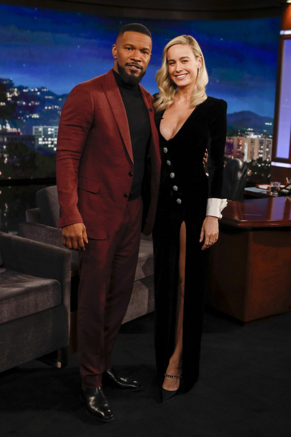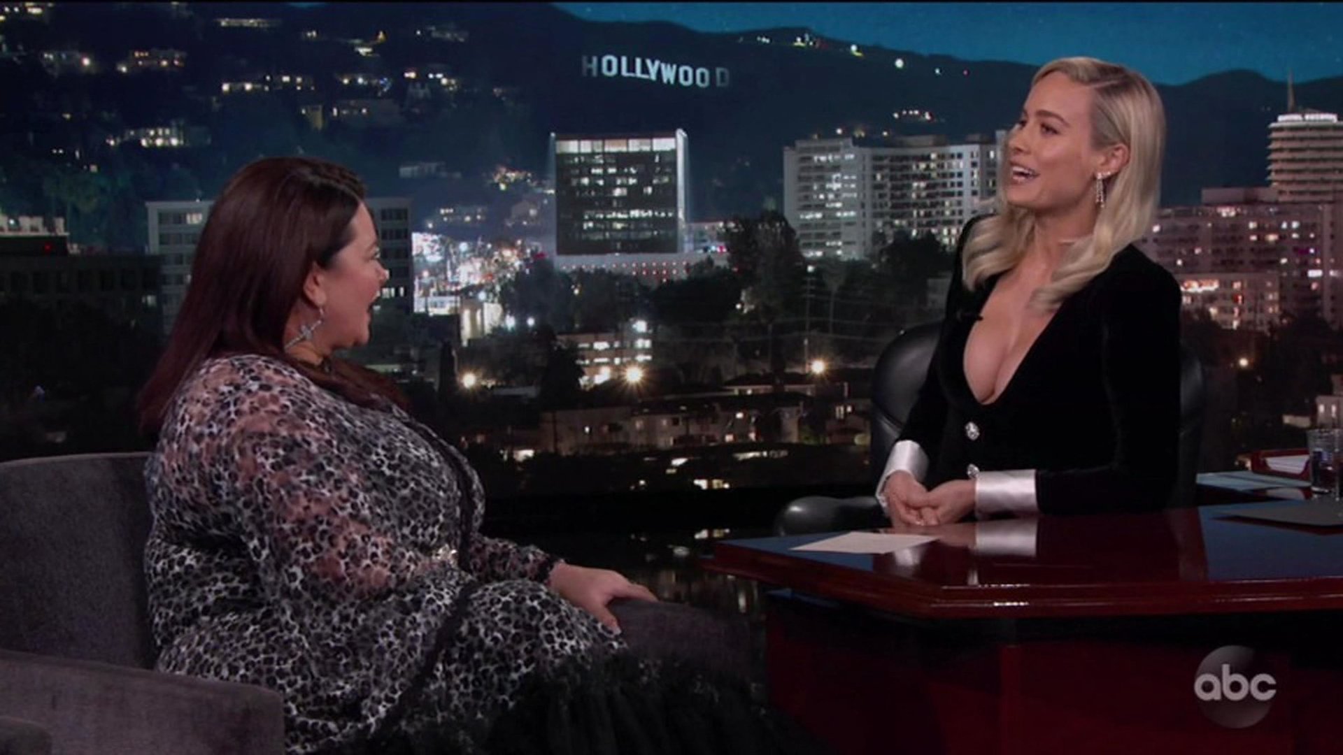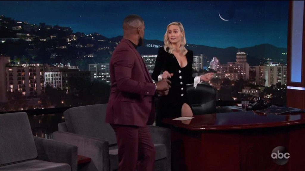 Brie Larson exibe seu deslumbrante peito 34D em um vestido incrivelmente decotado enquanto assume como apresentadora no Jimmy Kimmel Live, 19/11/2019. A estrela de Capitã Marvel e Fappening quase sofreu um problema de figurino enquanto apresentava o talk show noturno com um vestido preto deslumbrante que não só mostrava seus seios, mas também tinha uma fenda sexy até a coxa.