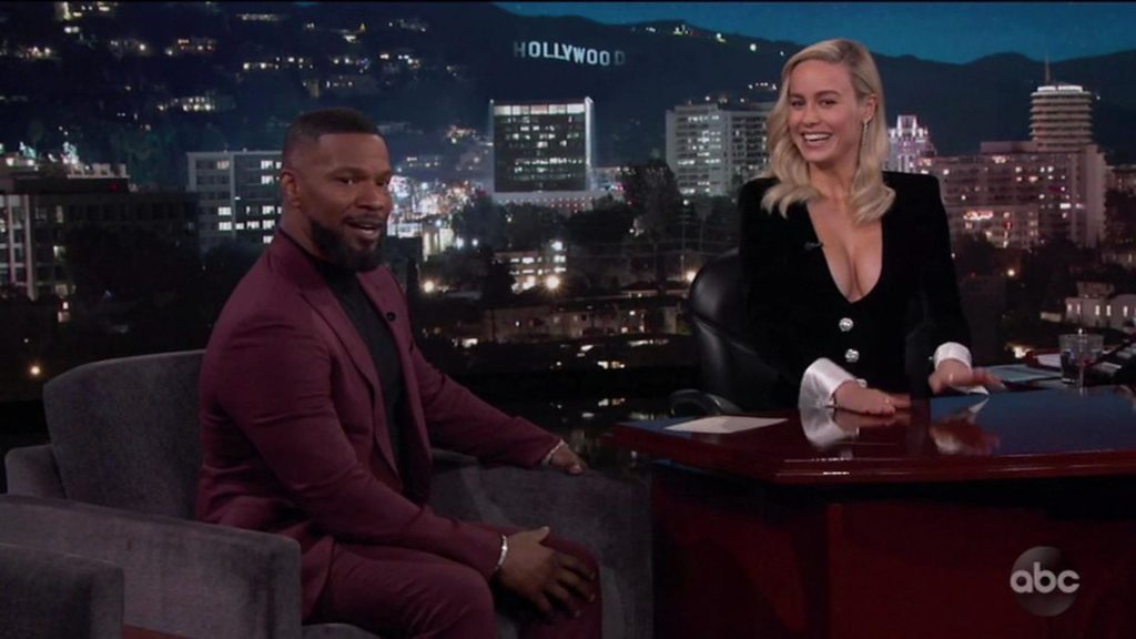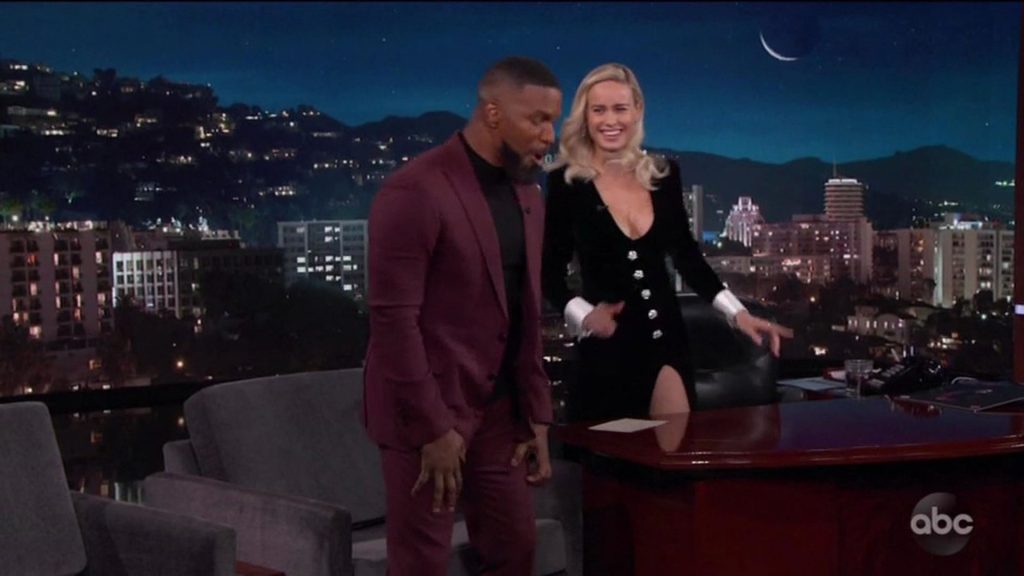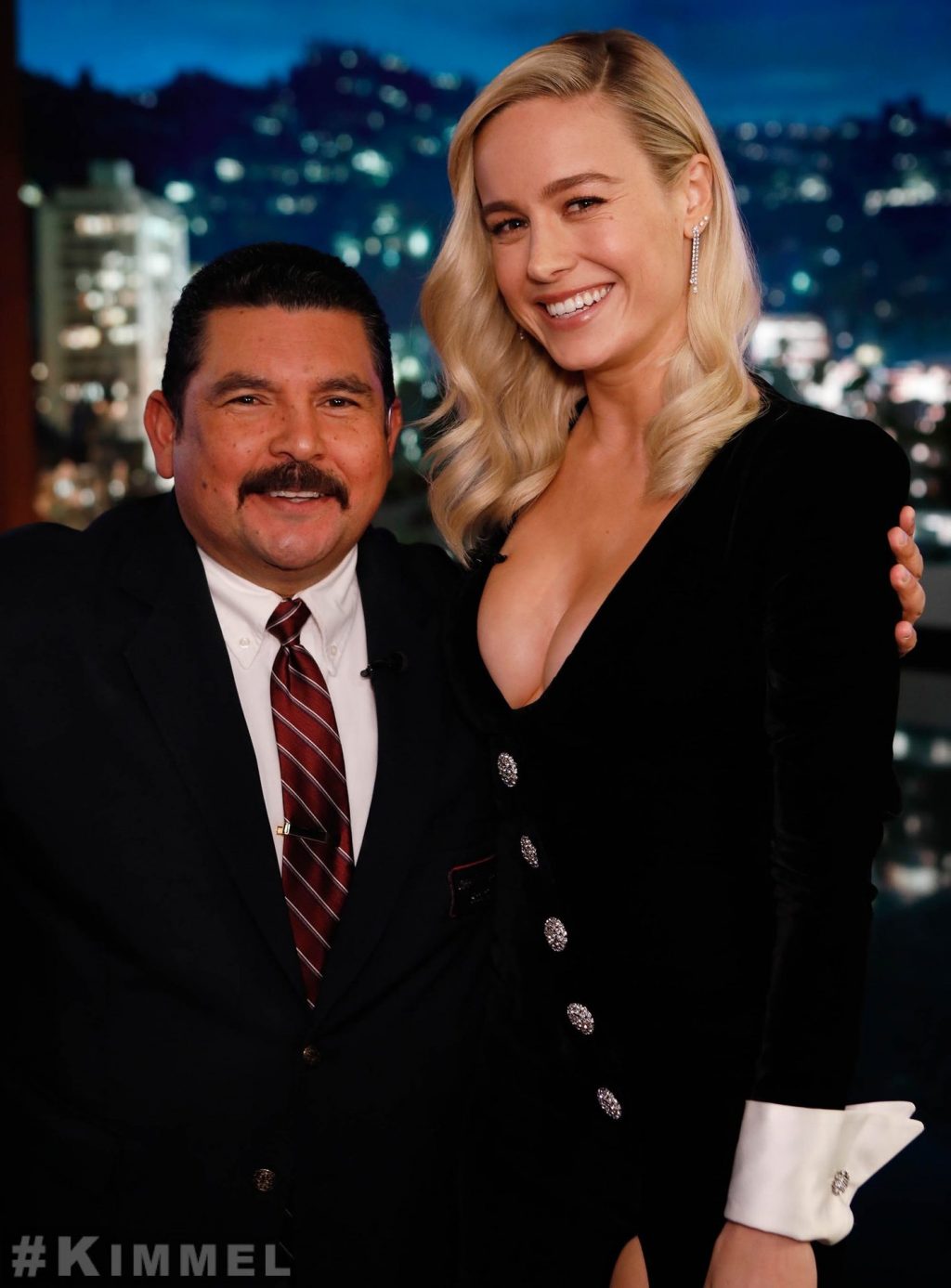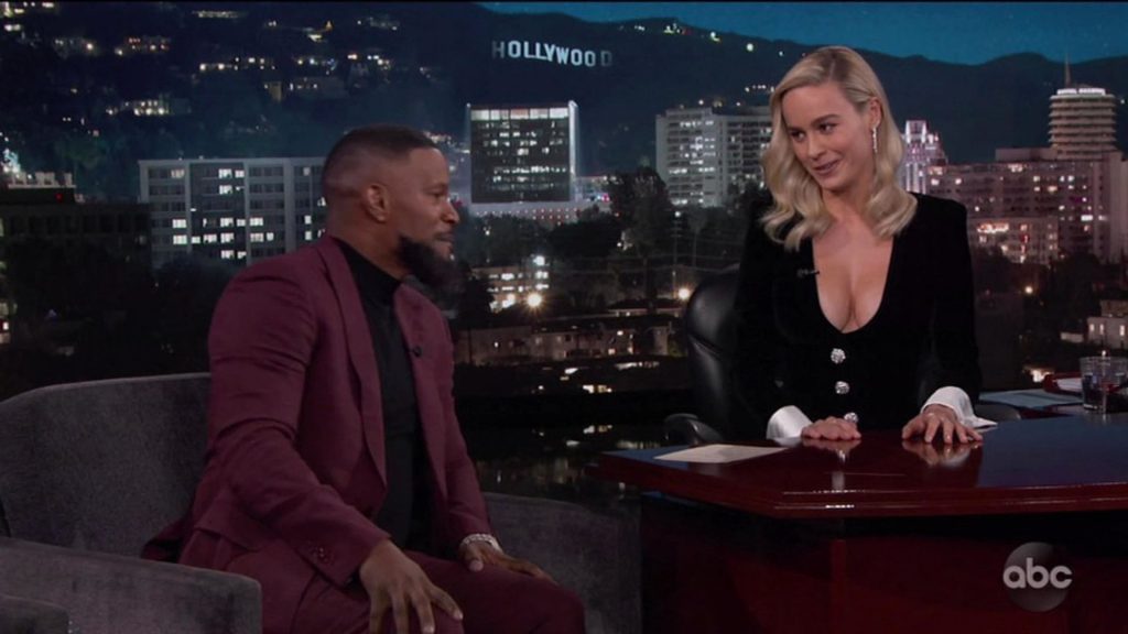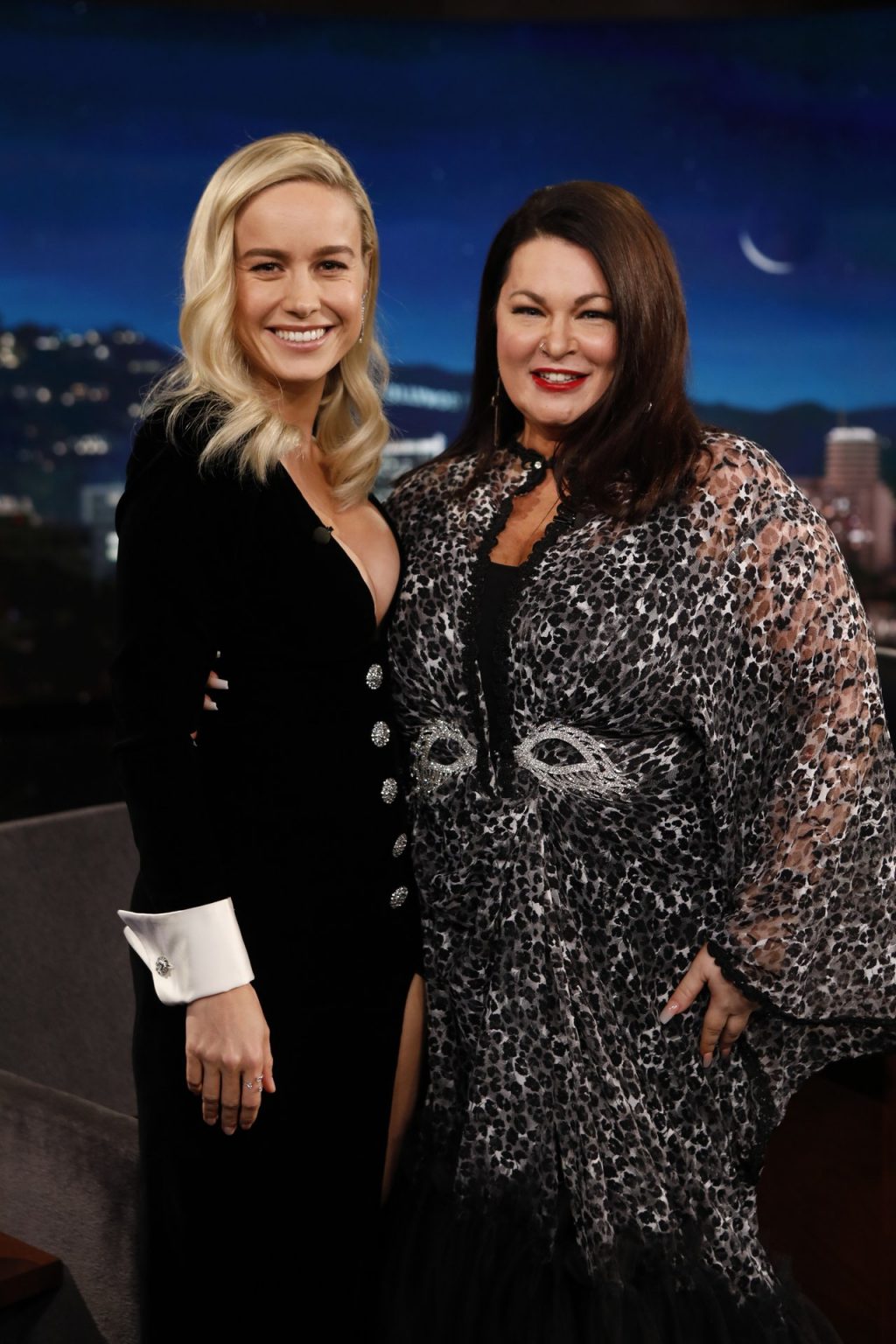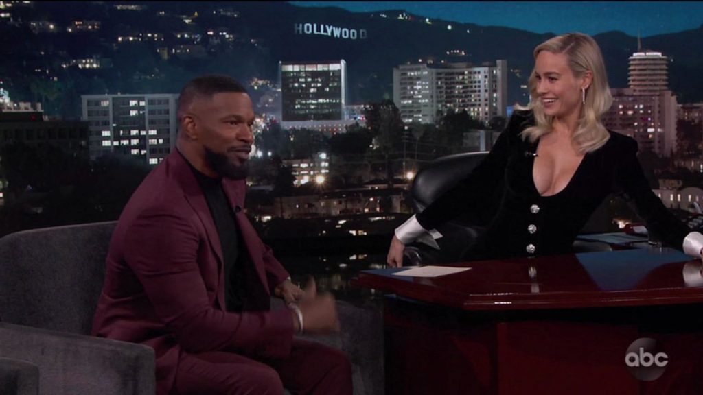 Brie Larson exibe seu deslumbrante peito 34D em um vestido incrivelmente decotado enquanto assume como apresentadora no Jimmy Kimmel Live, 19/11/2019. A estrela de Capitã Marvel e Fappening quase sofreu um problema de figurino enquanto apresentava o talk show noturno com um vestido preto deslumbrante que não só mostrava seus seios, mas também tinha uma fenda sexy até a coxa.