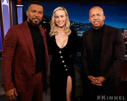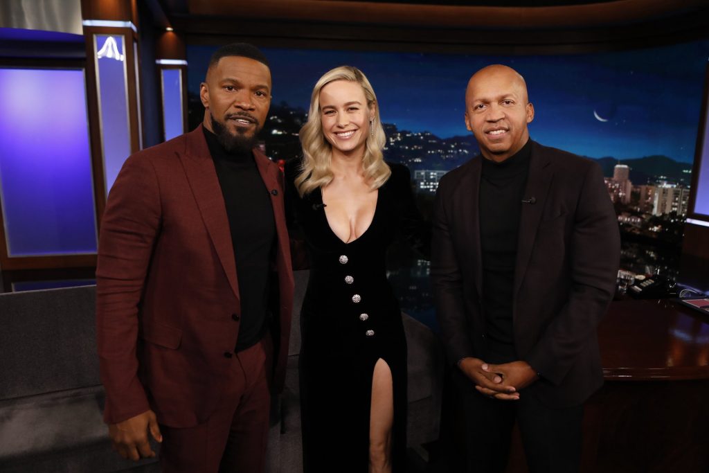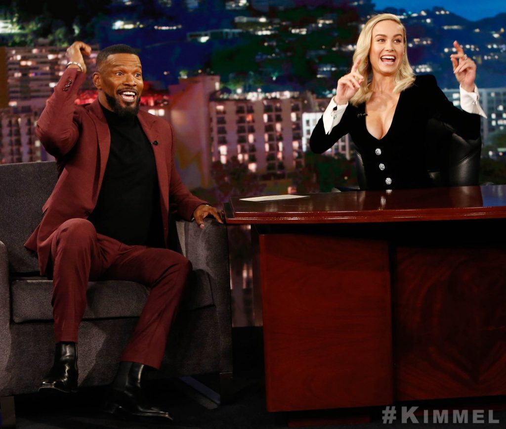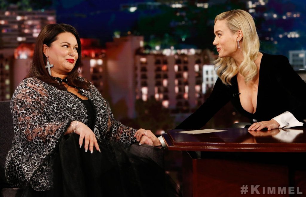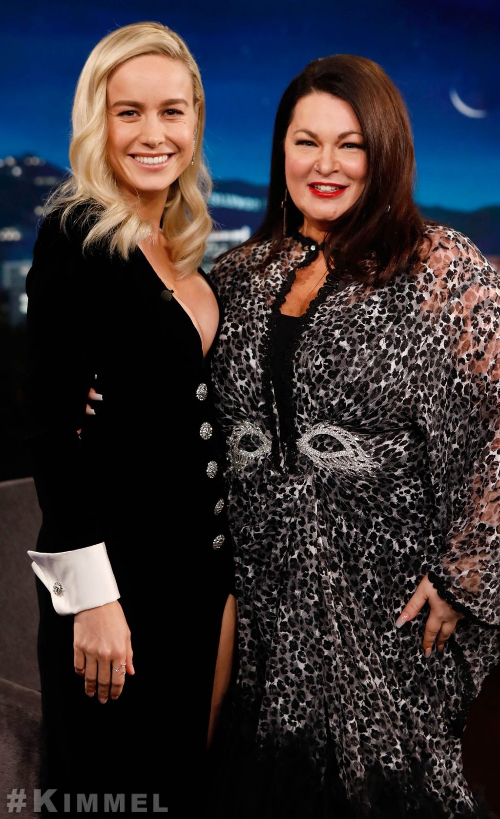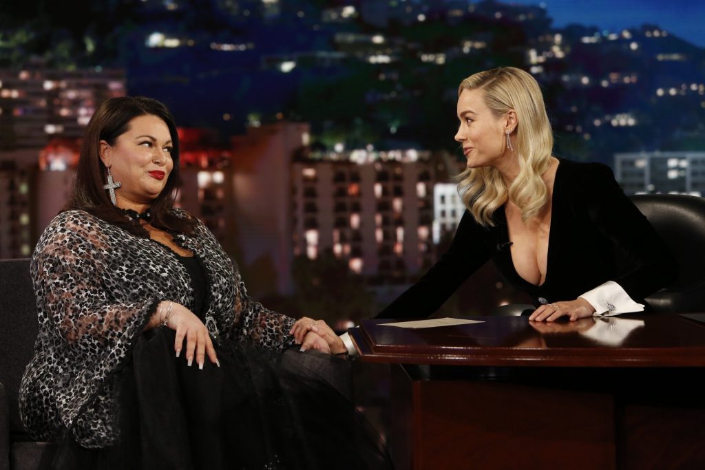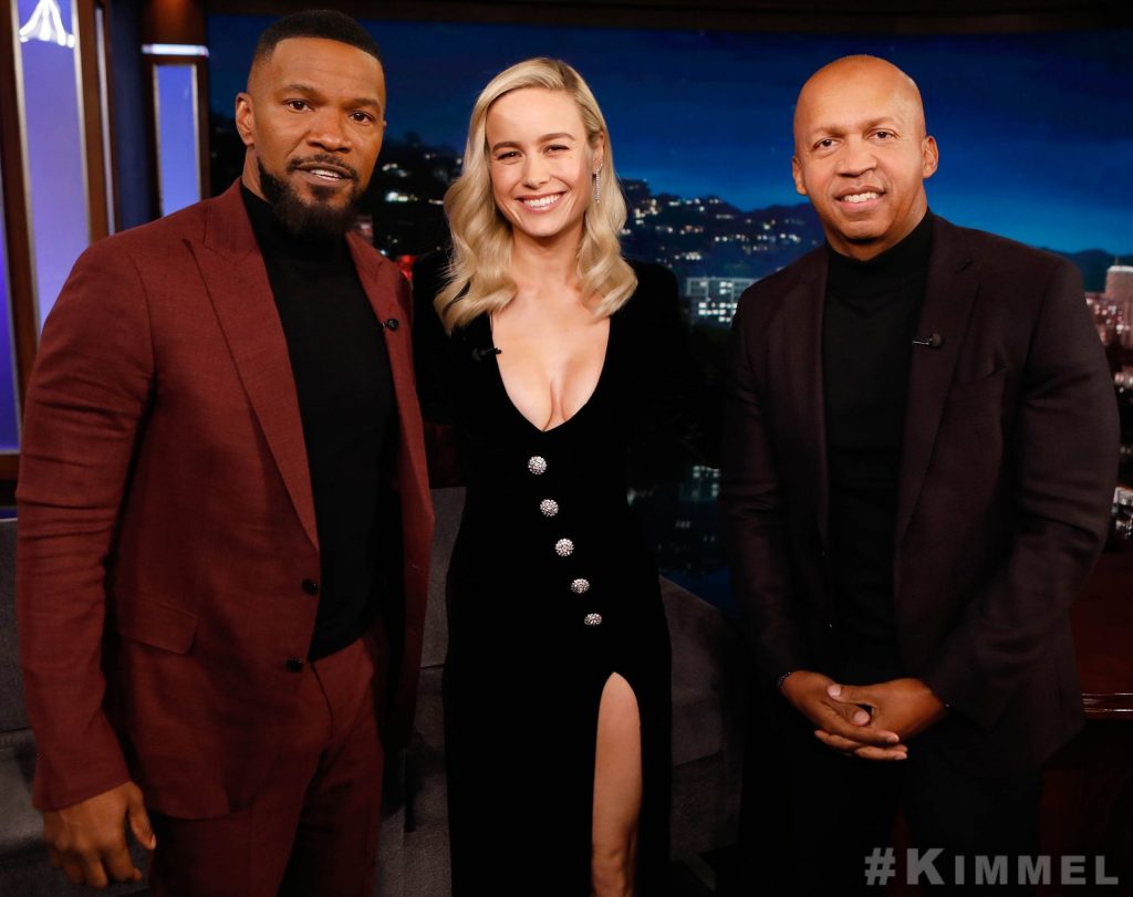 Brie Larson exibe seu deslumbrante peito 34D em um vestido incrivelmente decotado enquanto assume como apresentadora no Jimmy Kimmel Live, 19/11/2019. A estrela de Capitã Marvel e Fappening quase sofreu um problema de figurino enquanto apresentava o talk show noturno com um vestido preto deslumbrante que não só mostrava seus seios, mas também tinha uma fenda sexy até a coxa.