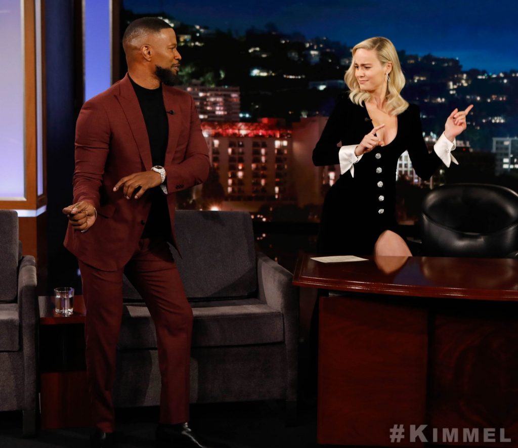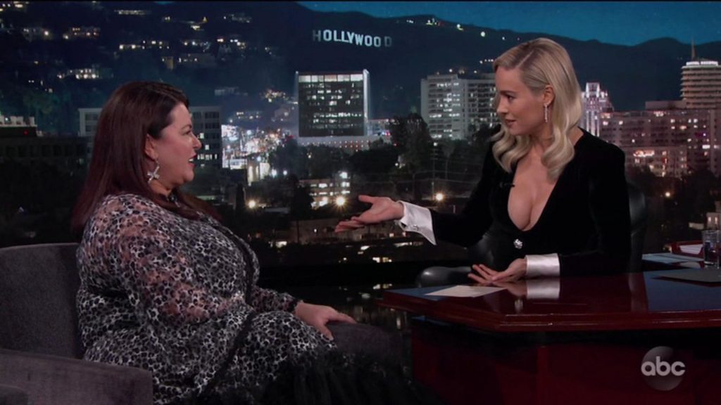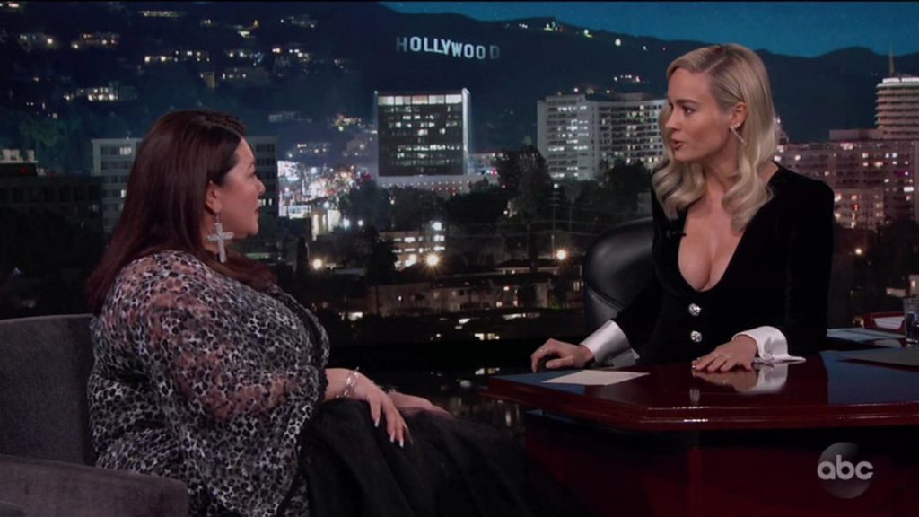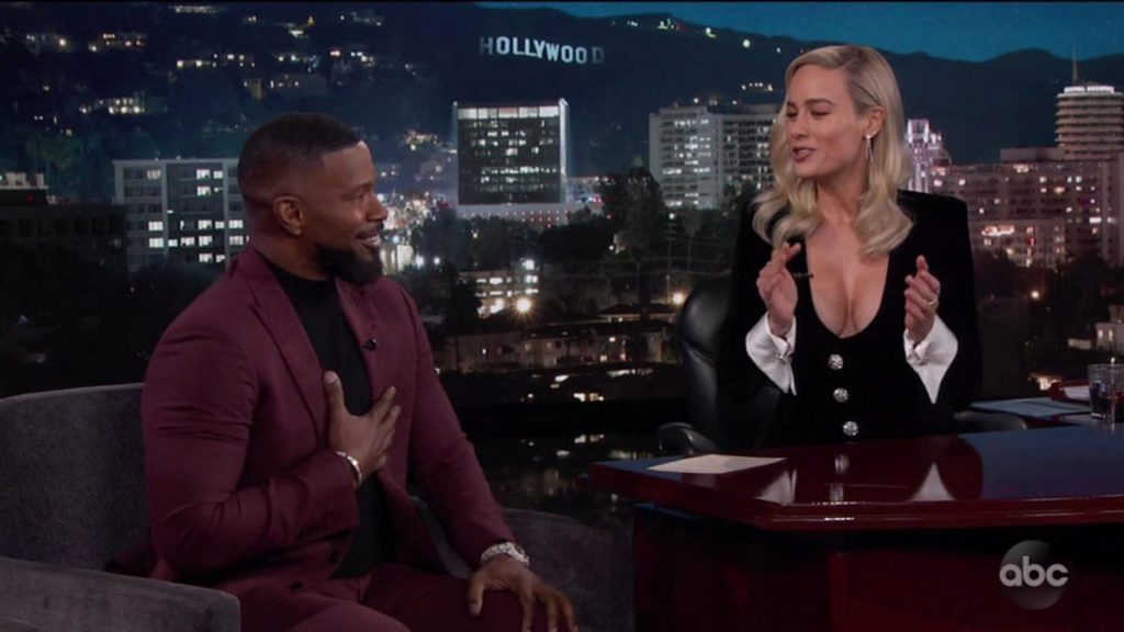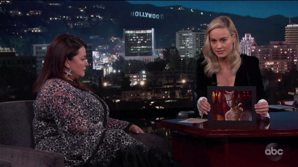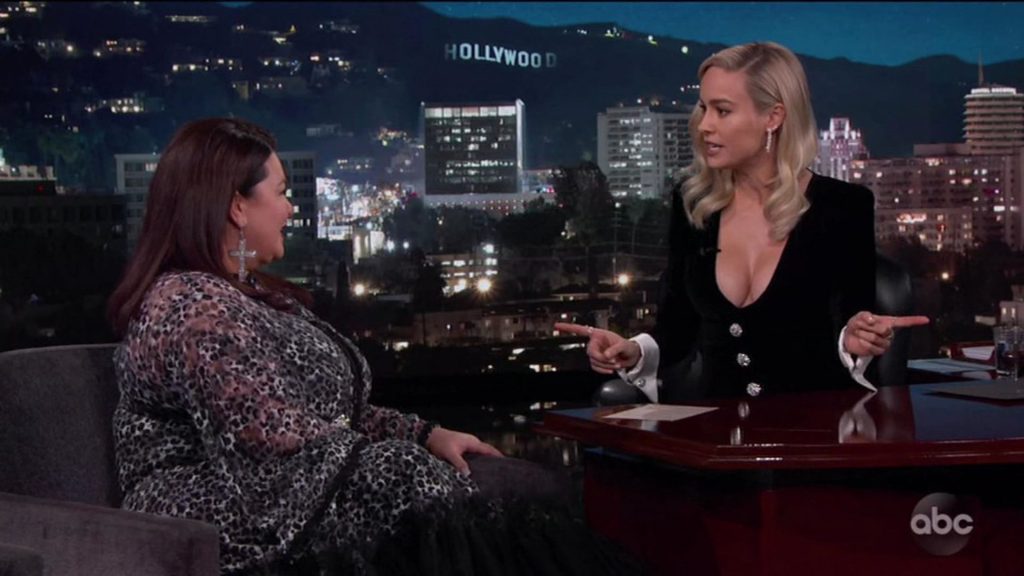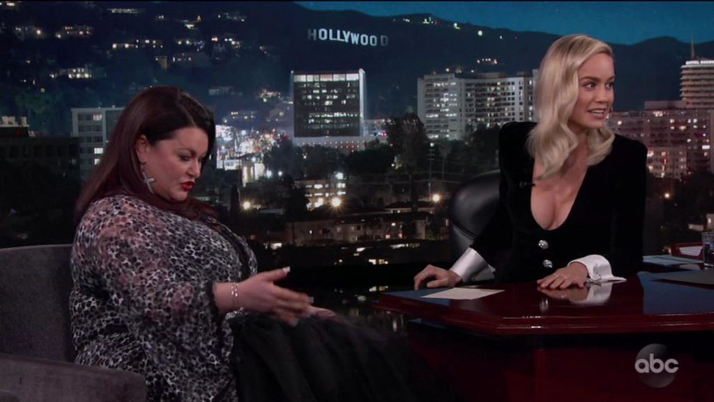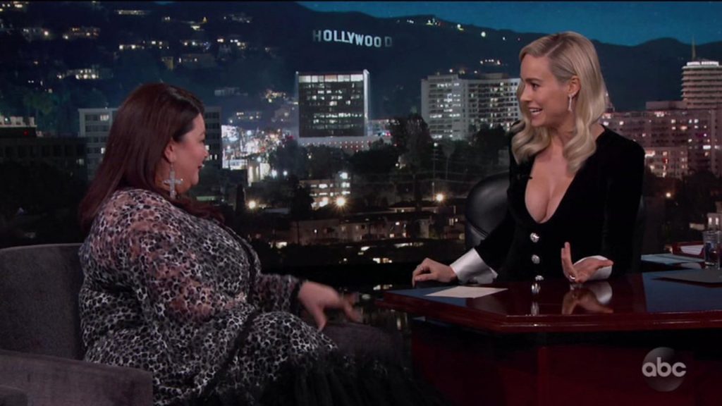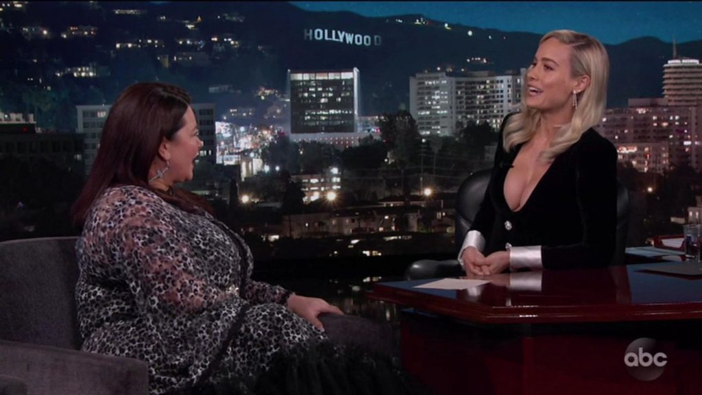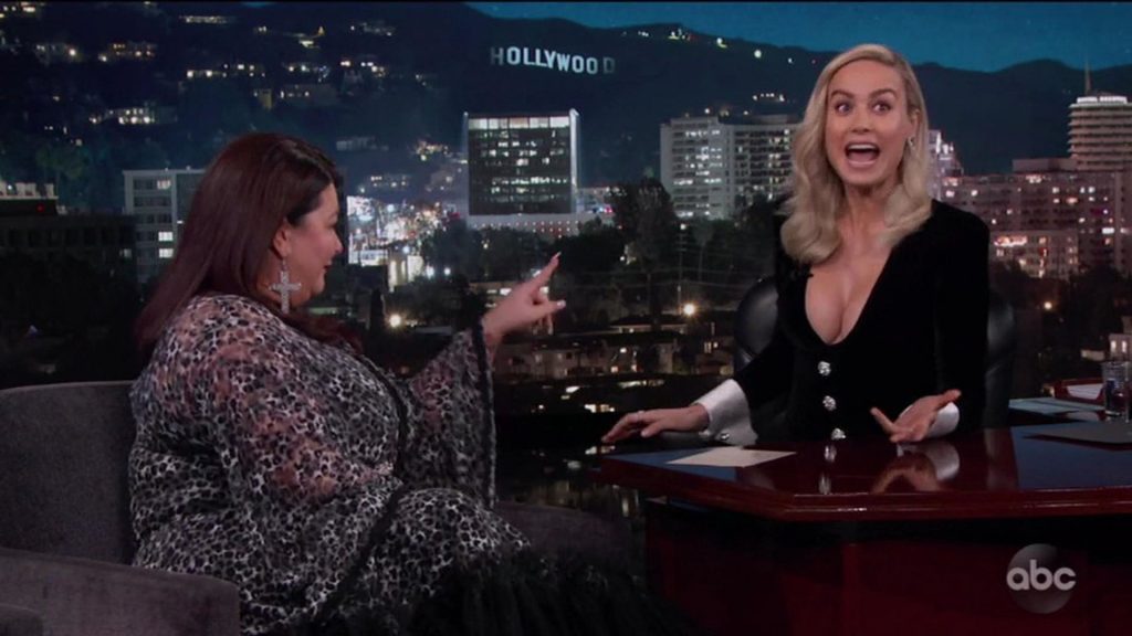 Molly confirmou que esse era seu superpoder, fazendo Brie apontar para seu vestido e brincar: “Eu facilitei muito para você! Aqui está!” Molly então disse a ela: “Você é um 30F, que é de triplo D a G, mas não é isso que você está comprando.” Uma Brie surpresa respondeu: “Eu não acredito nisso!” Molly então acrescentou: “Você está comprando algo como 34Ds,” ao que Brie respondeu: “Nossa!” Molly então perguntou: “É isso que você está comprando?” e a estrela confirmou: “Sim!” Depois que Molly reclamou que ‘ninguém na América sabe os tamanhos de sutiã’, Brie tirou uma foto de Taylor Swift no novo filme Cats e disse: “Tenho uma curva para você. Qual é o tamanho do sutiã dela?” Molly respondeu rindo: “Ela é um pouco menor, é um D.” Brie, que tinha feito piada sobre o novo filme Cats no monólogo de abertura do programa, perguntou: “Você está levando em conta a pelagem?” ao que Molly disse: “Oh sim.” Também no programa, Brie entrevistou seu co-estrela de Just Mercy, Jamie Foxx, que também comentou sobre sua aparência, dizendo: “Você está incrível, você é linda!”