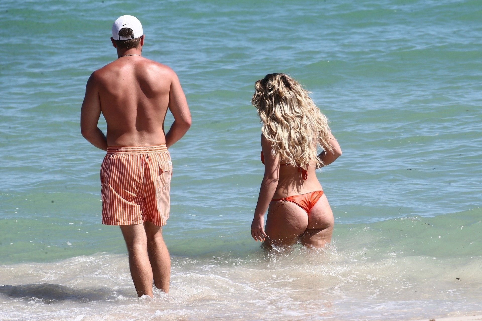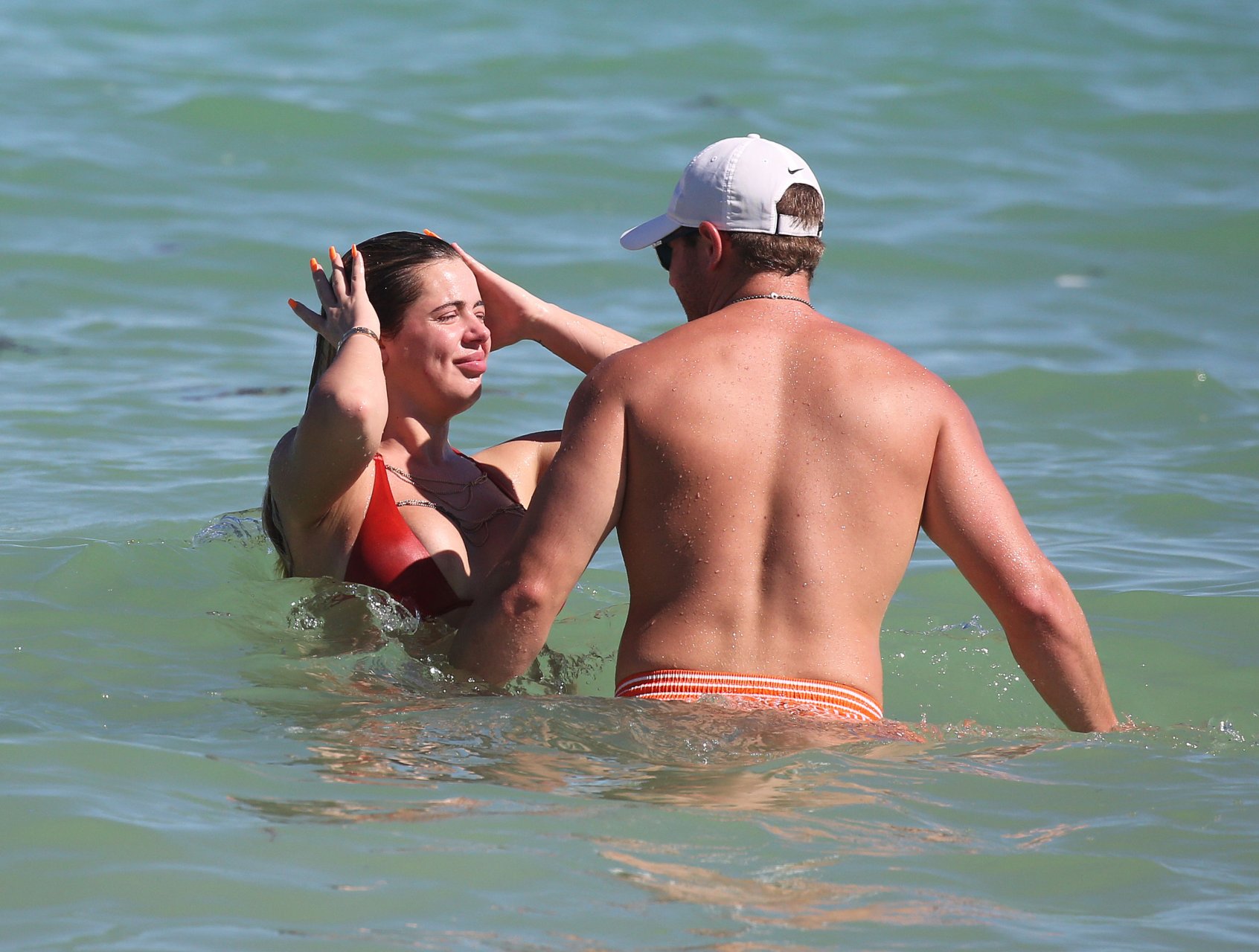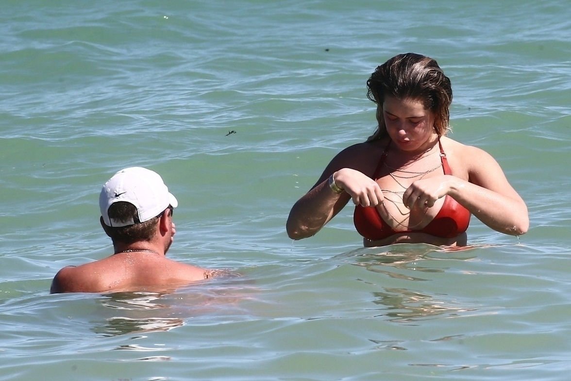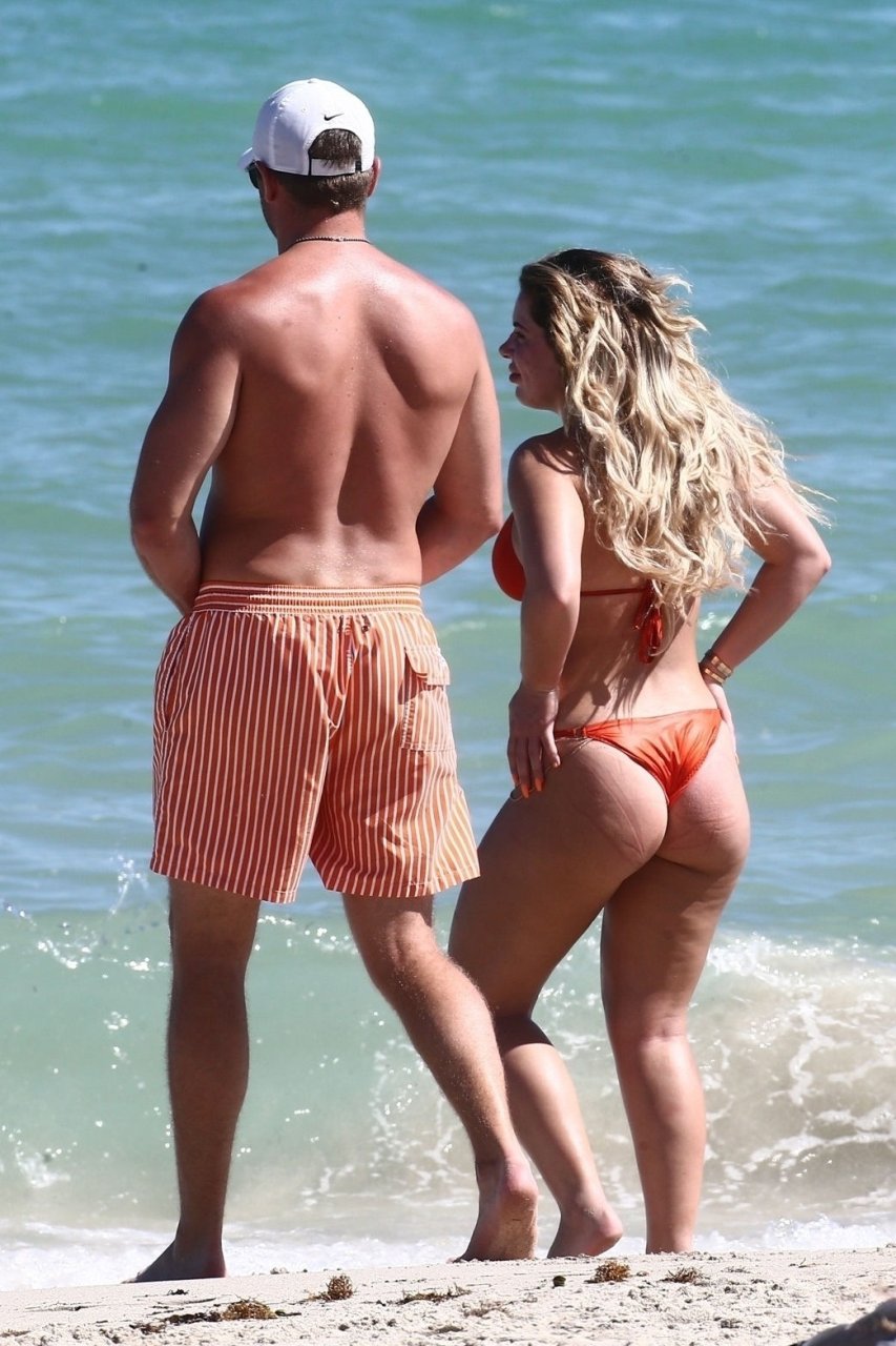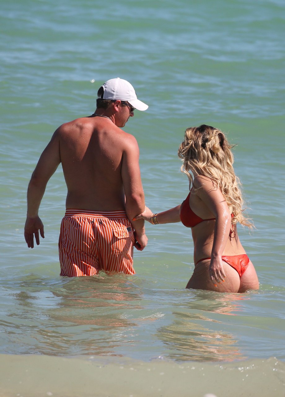 Reality Star Brielle Biermann (21) usa um biquíni laranja revelador enquanto demonstra muito PDA com o namorado Slade Osborne na praia em Miami Beach, Flórida, 20/10/2018.