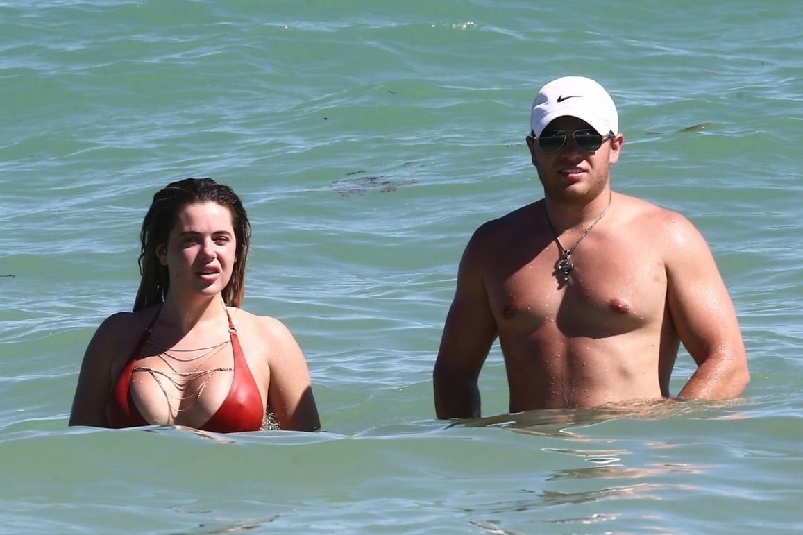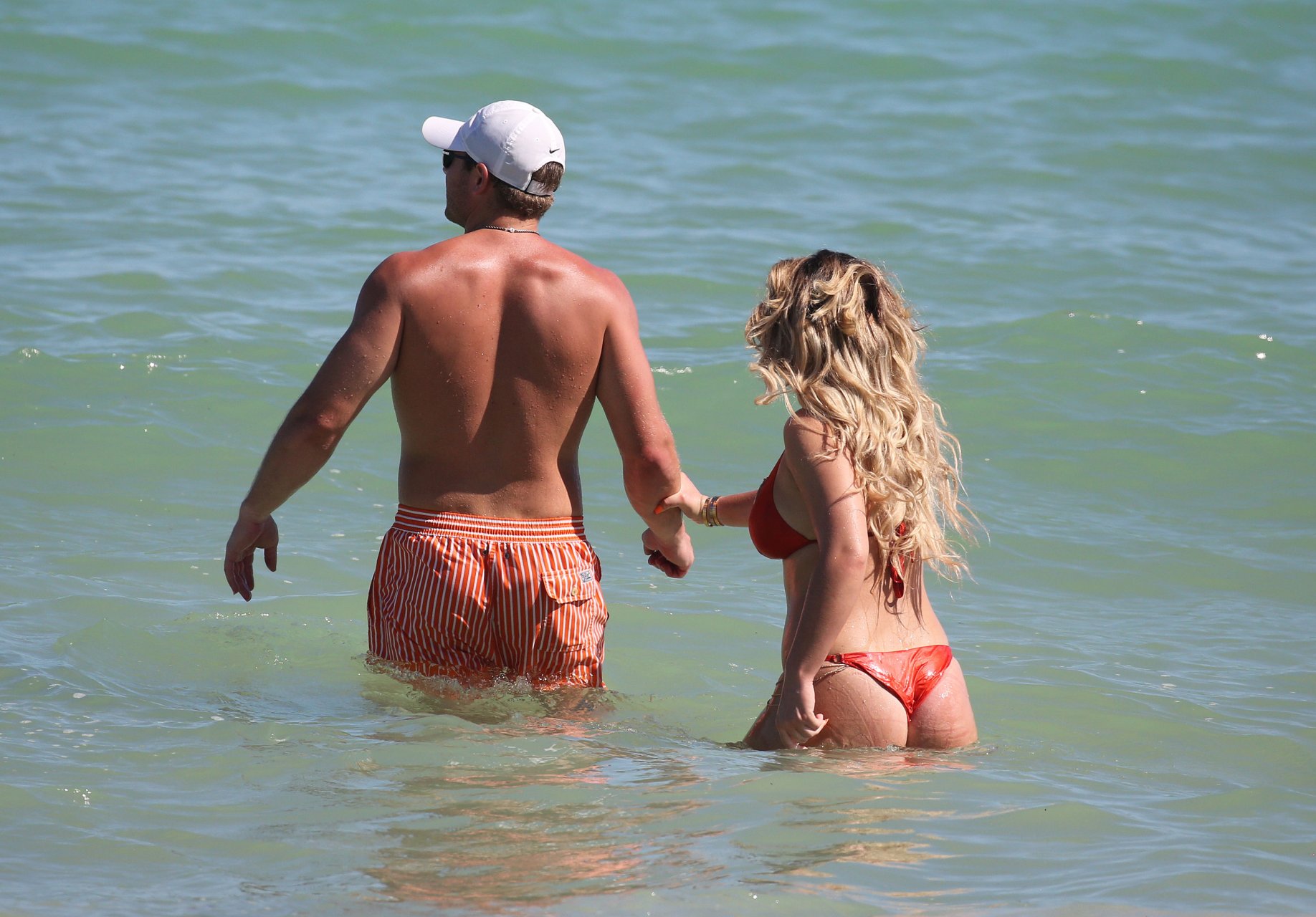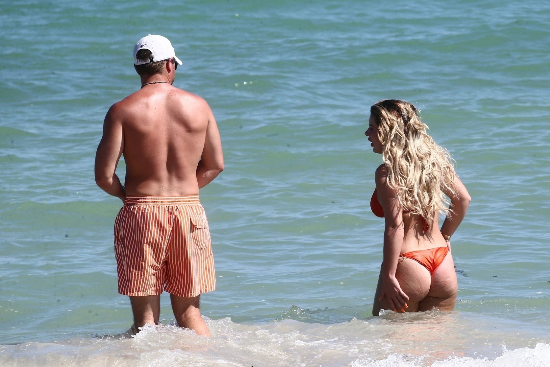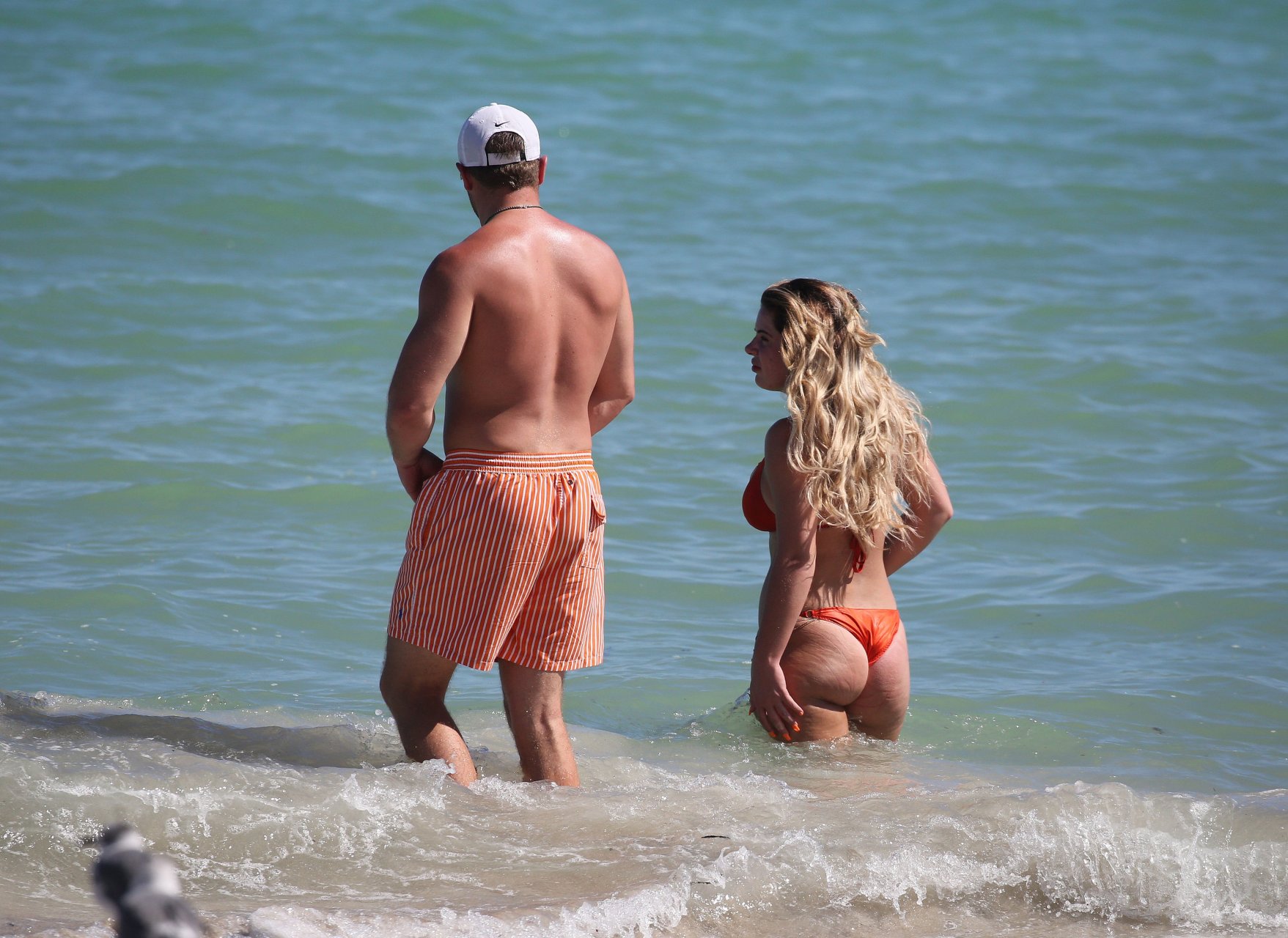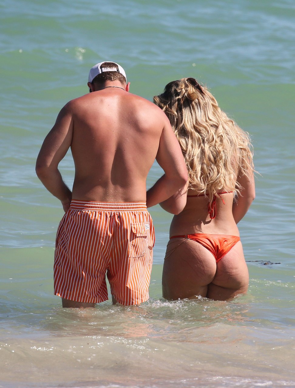 Reality Star Brielle Biermann (21) usa um biquíni laranja revelador enquanto demonstra muito PDA com o namorado Slade Osborne na praia em Miami Beach, Flórida, 20/10/2018.