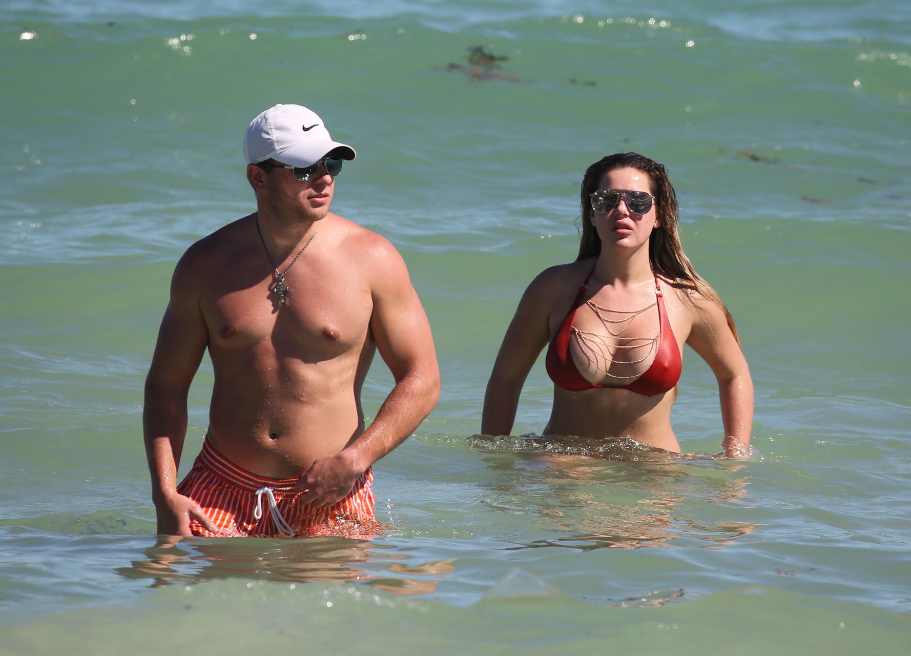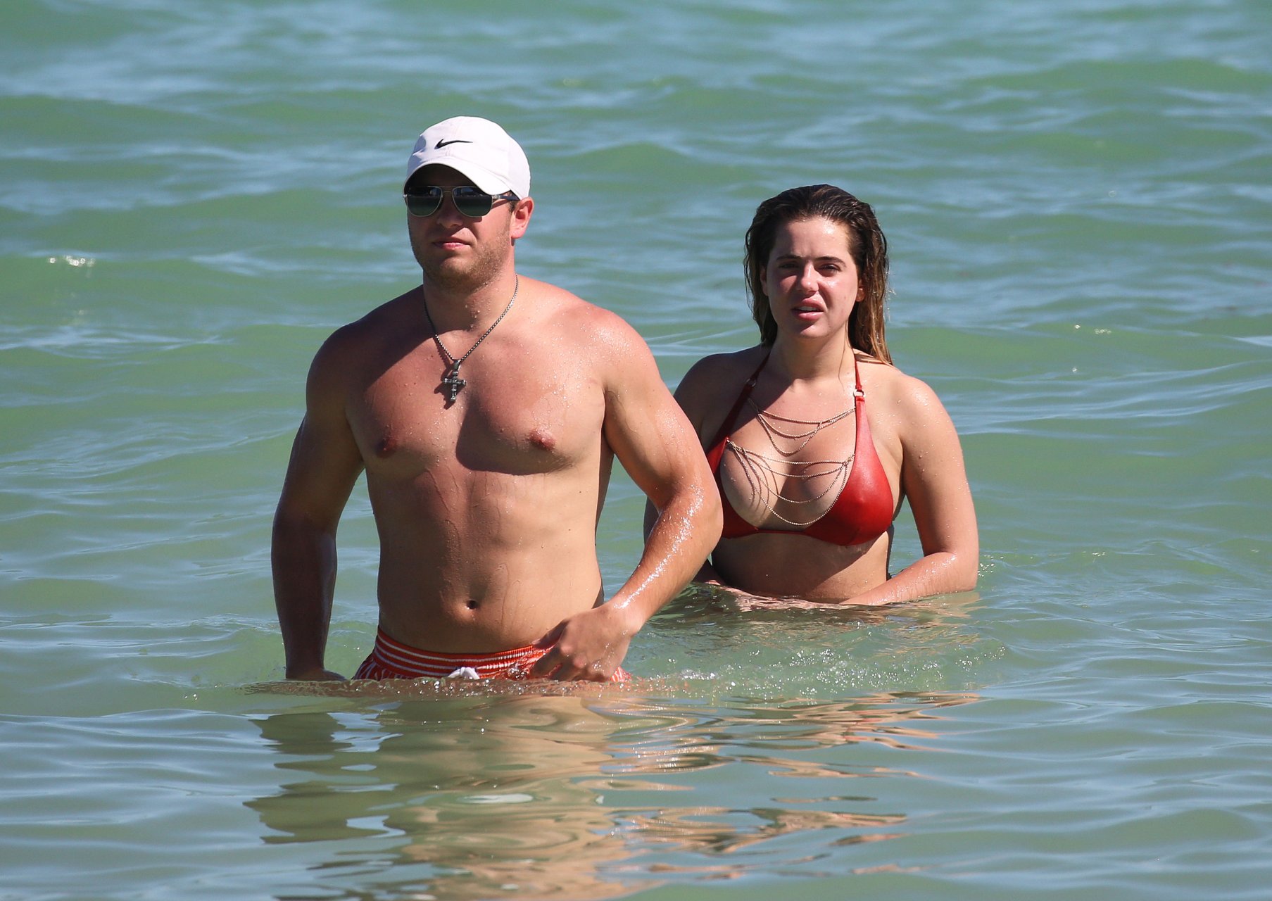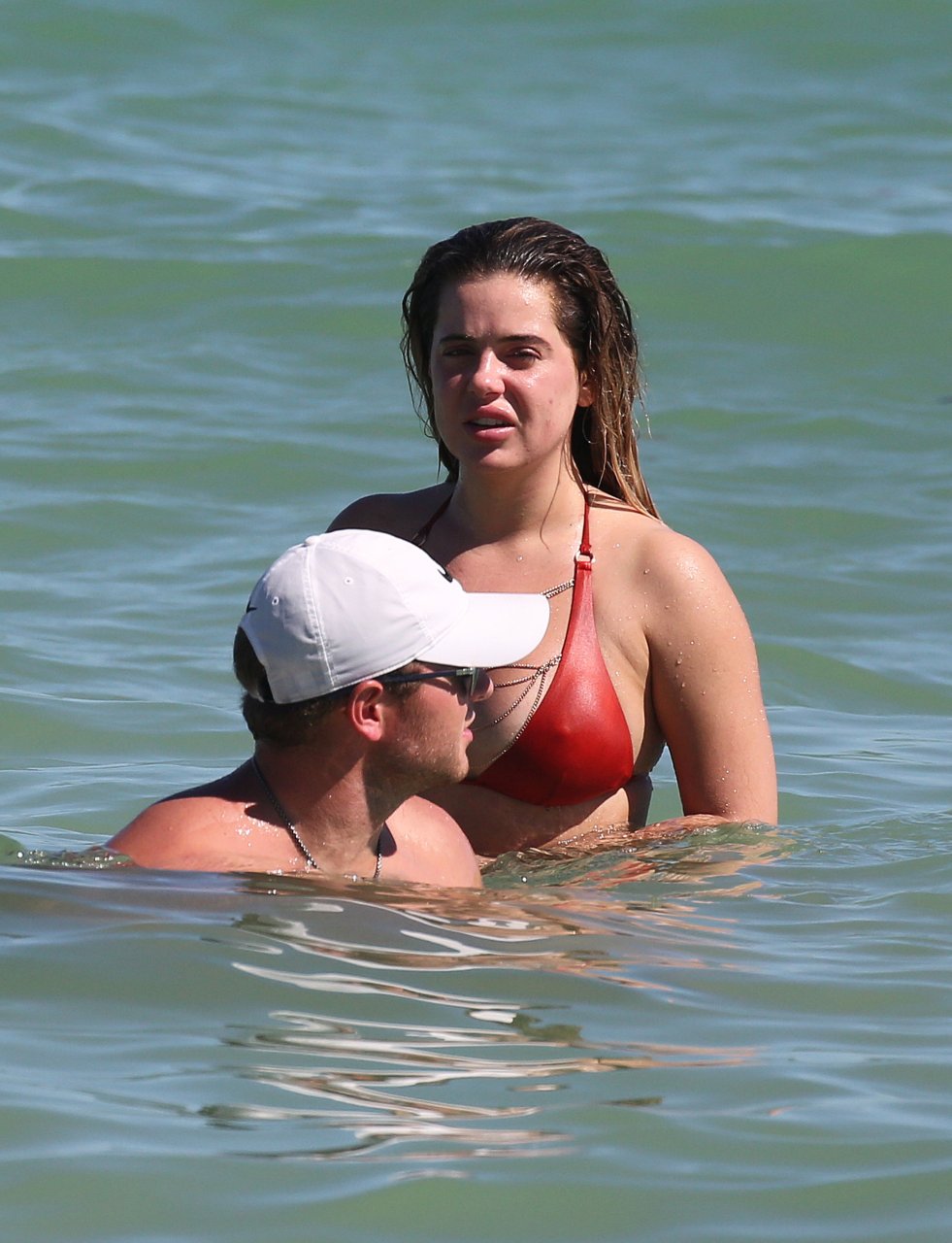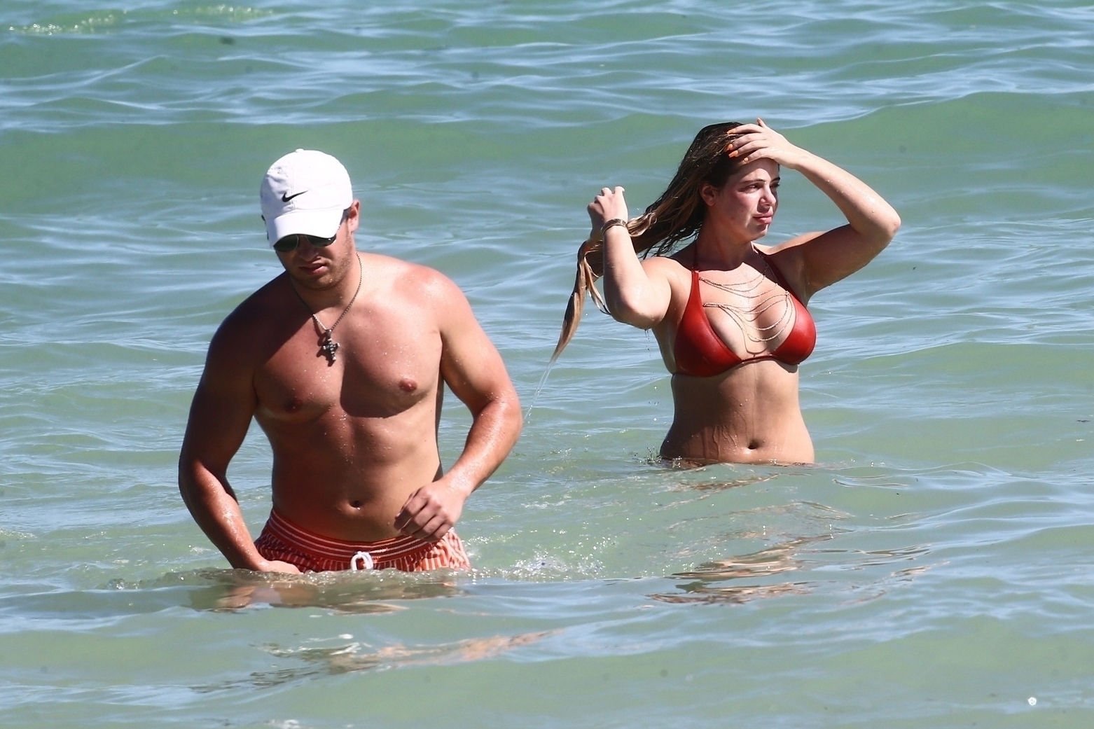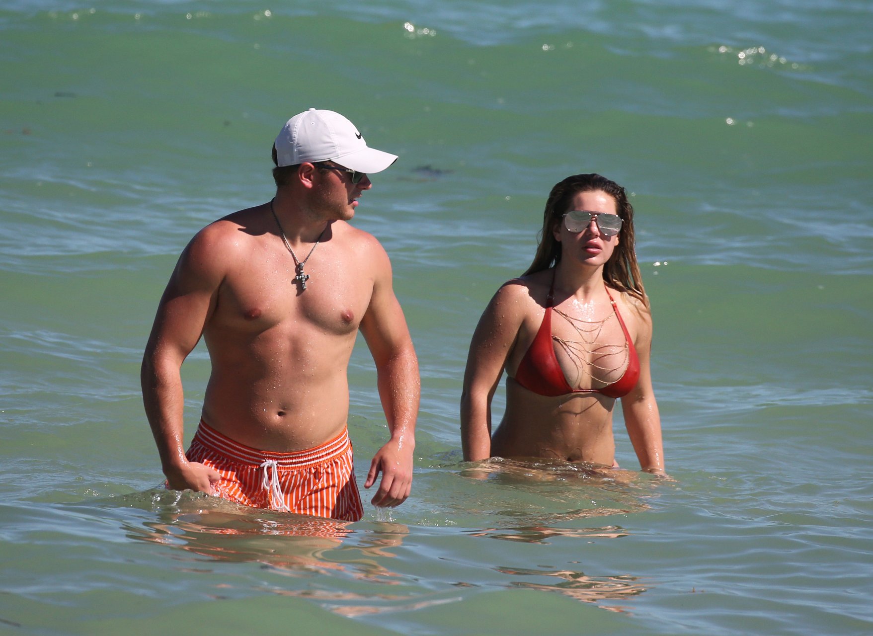 Reality Star Brielle Biermann (21) usa um biquíni laranja revelador enquanto demonstra muito PDA com o namorado Slade Osborne na praia em Miami Beach, Flórida, 20/10/2018.
