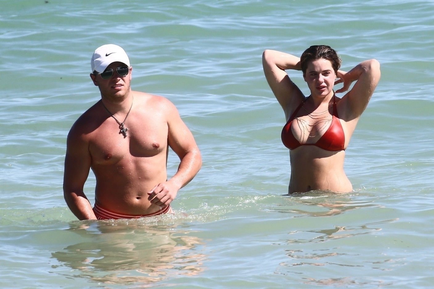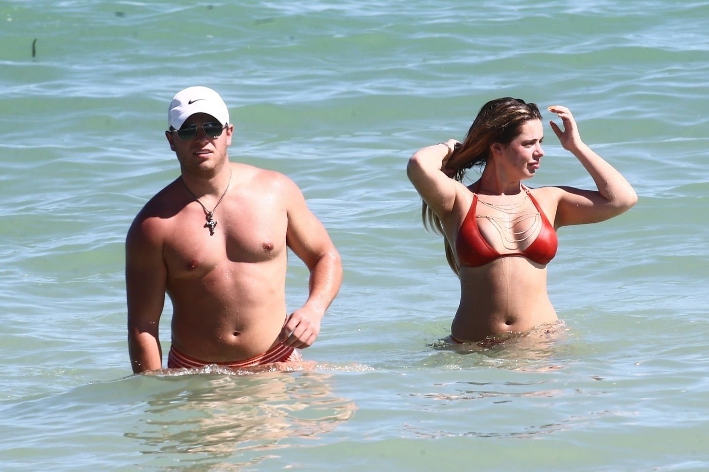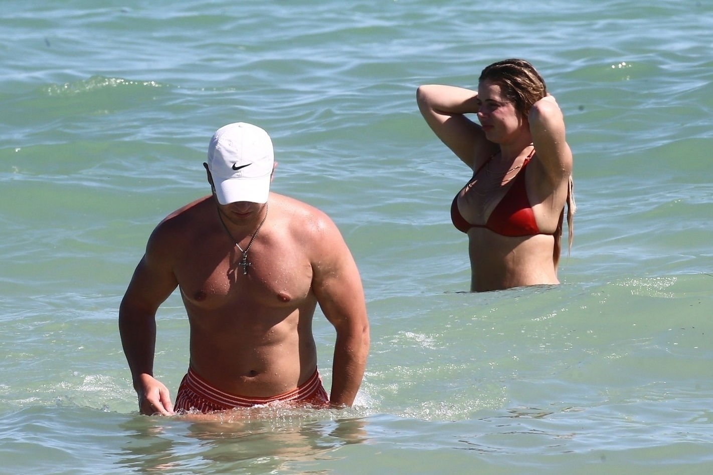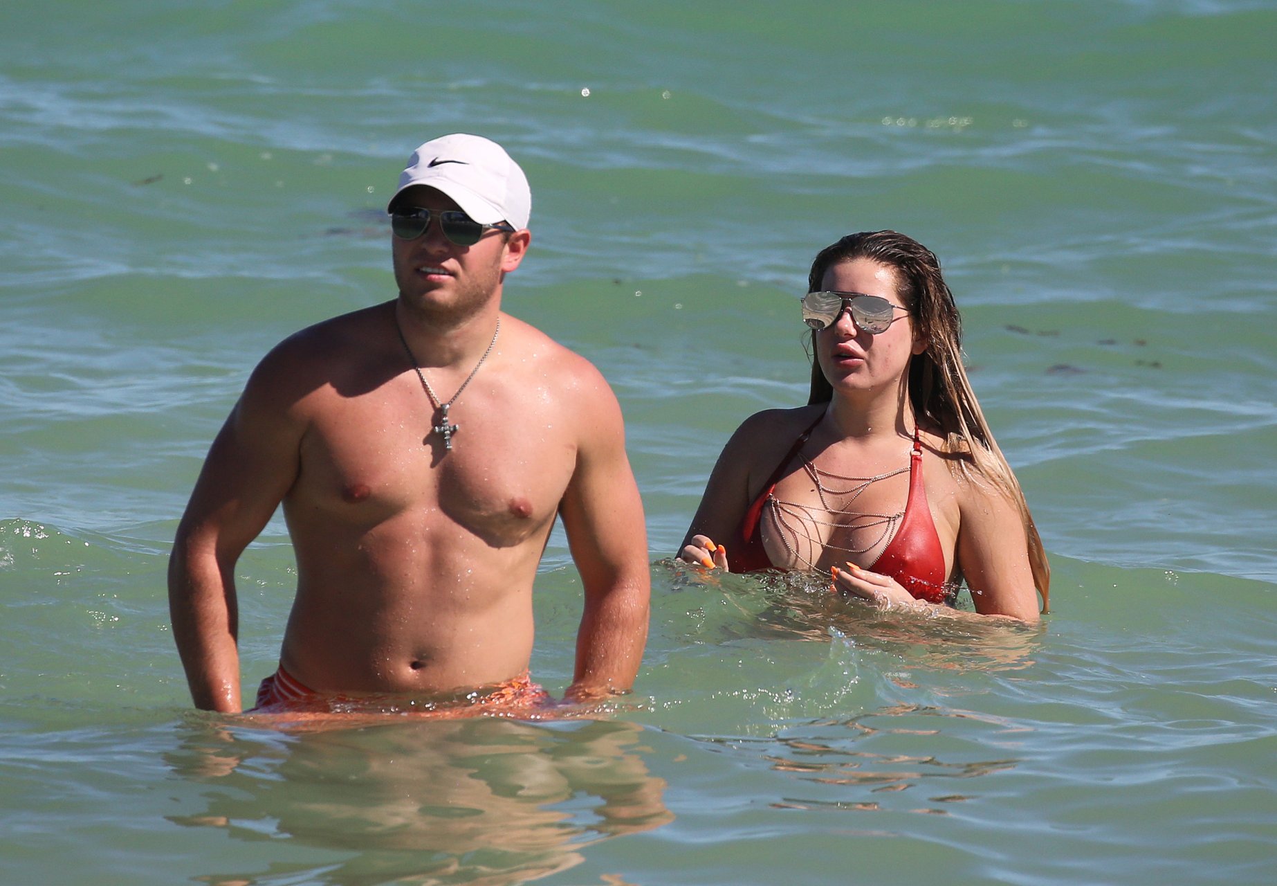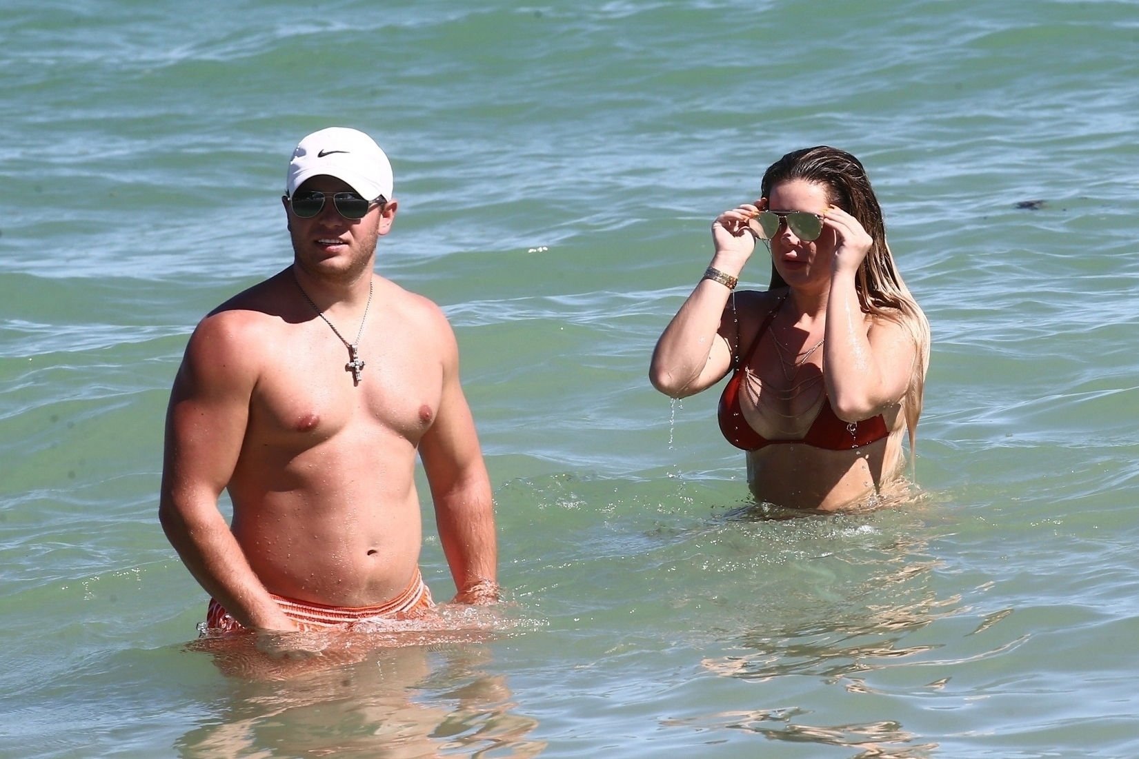 Reality Star Brielle Biermann (21) usa um biquíni laranja revelador enquanto demonstra muito PDA com o namorado Slade Osborne na praia em Miami Beach, Flórida, 20/10/2018.