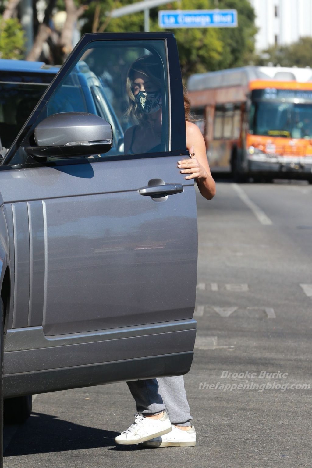 Brooke Burke (49) termina mais uma sessão de treino em West Hollywood, 11/11/2020. Ela usava um collant transparente com leggings cinza por cima.