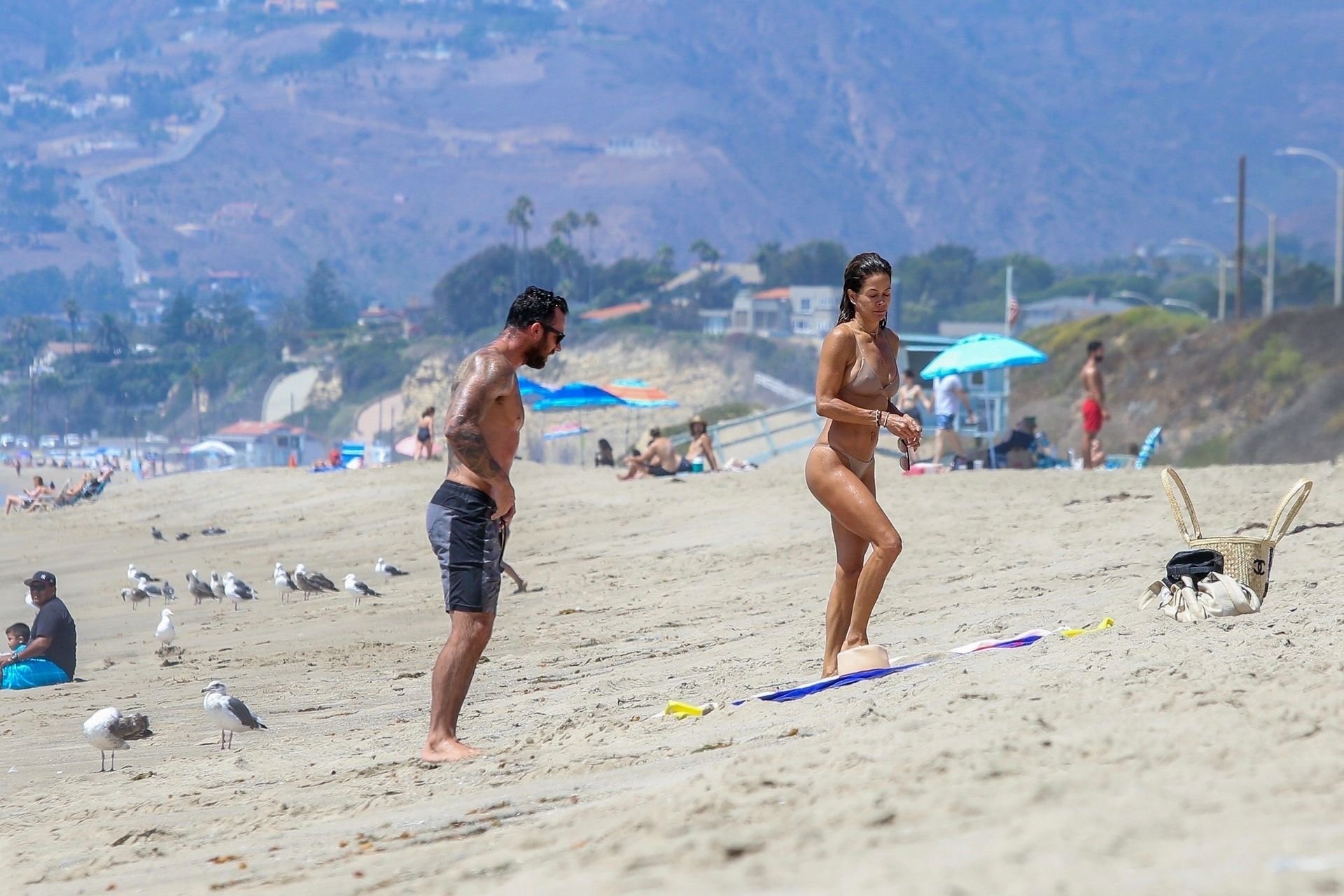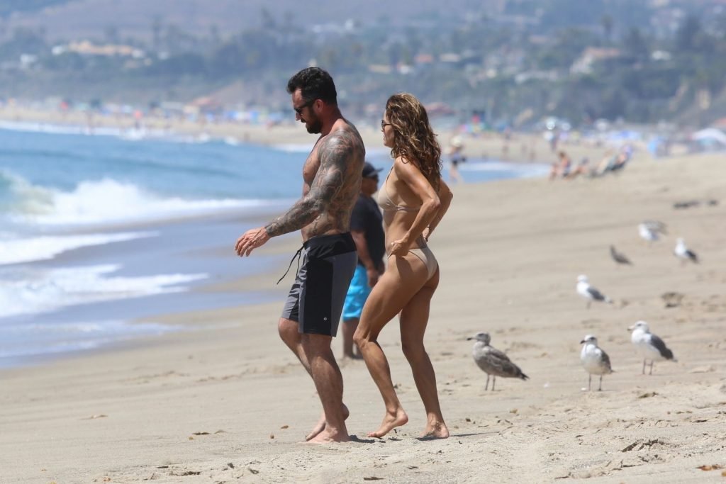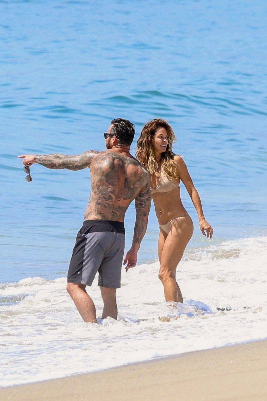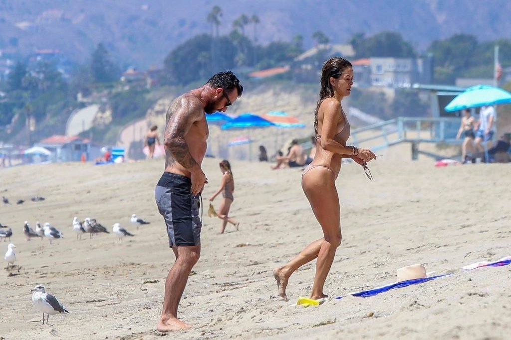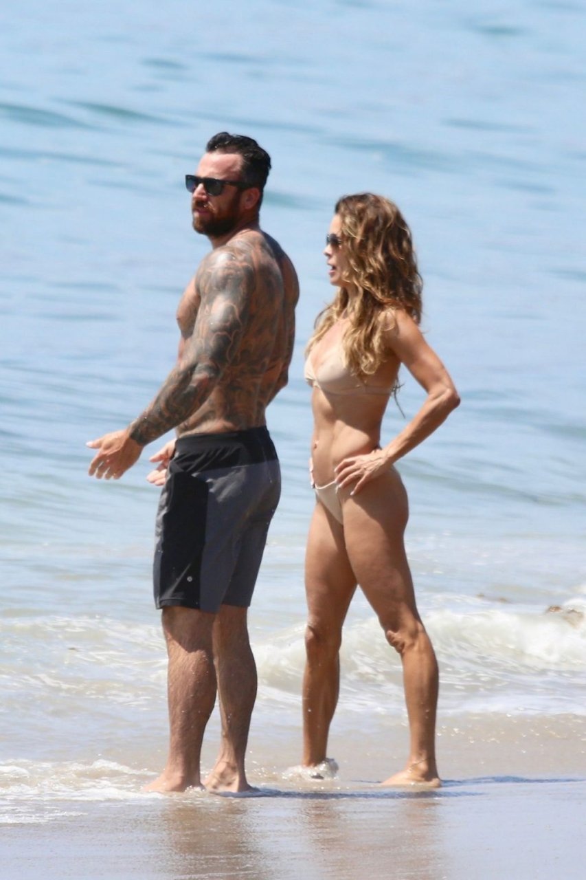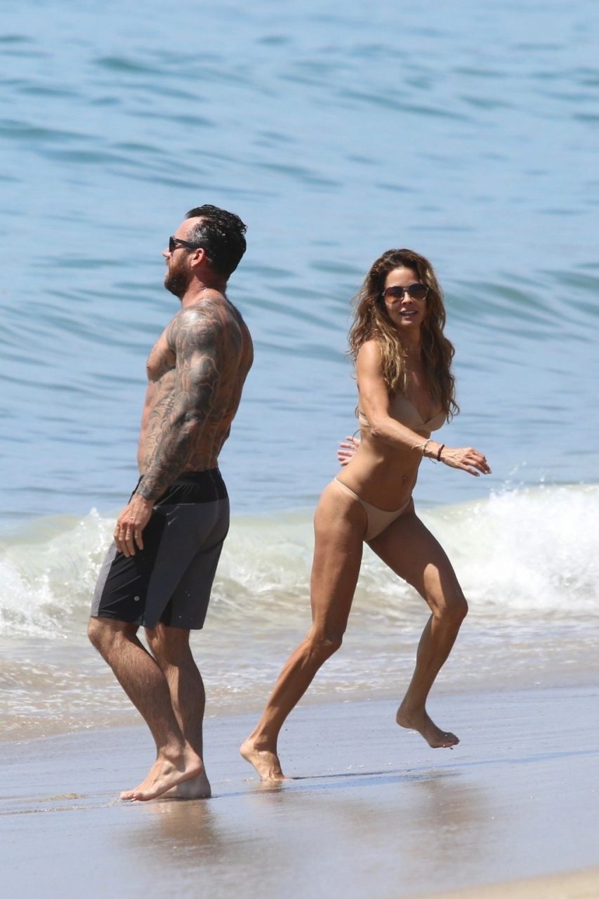Brooke Burke está deslumbrante em um biquíni nude enquanto troca beijos com um novo namorado tatuado na praia em Malibu após um mergulho no oceano em um dia quente em Los Angeles, 26/08/2019.