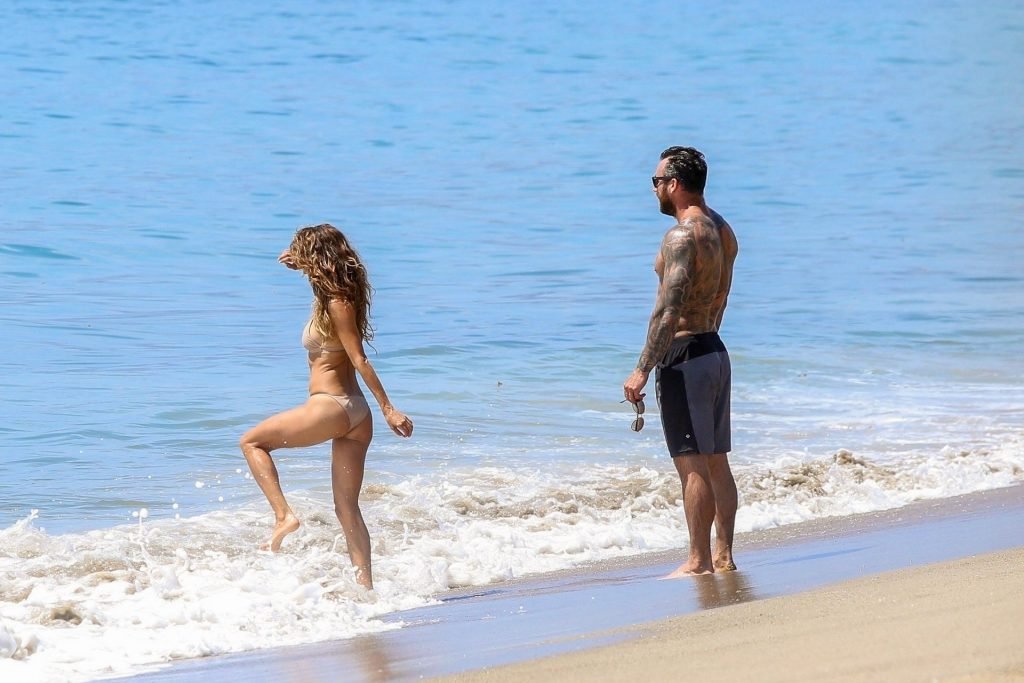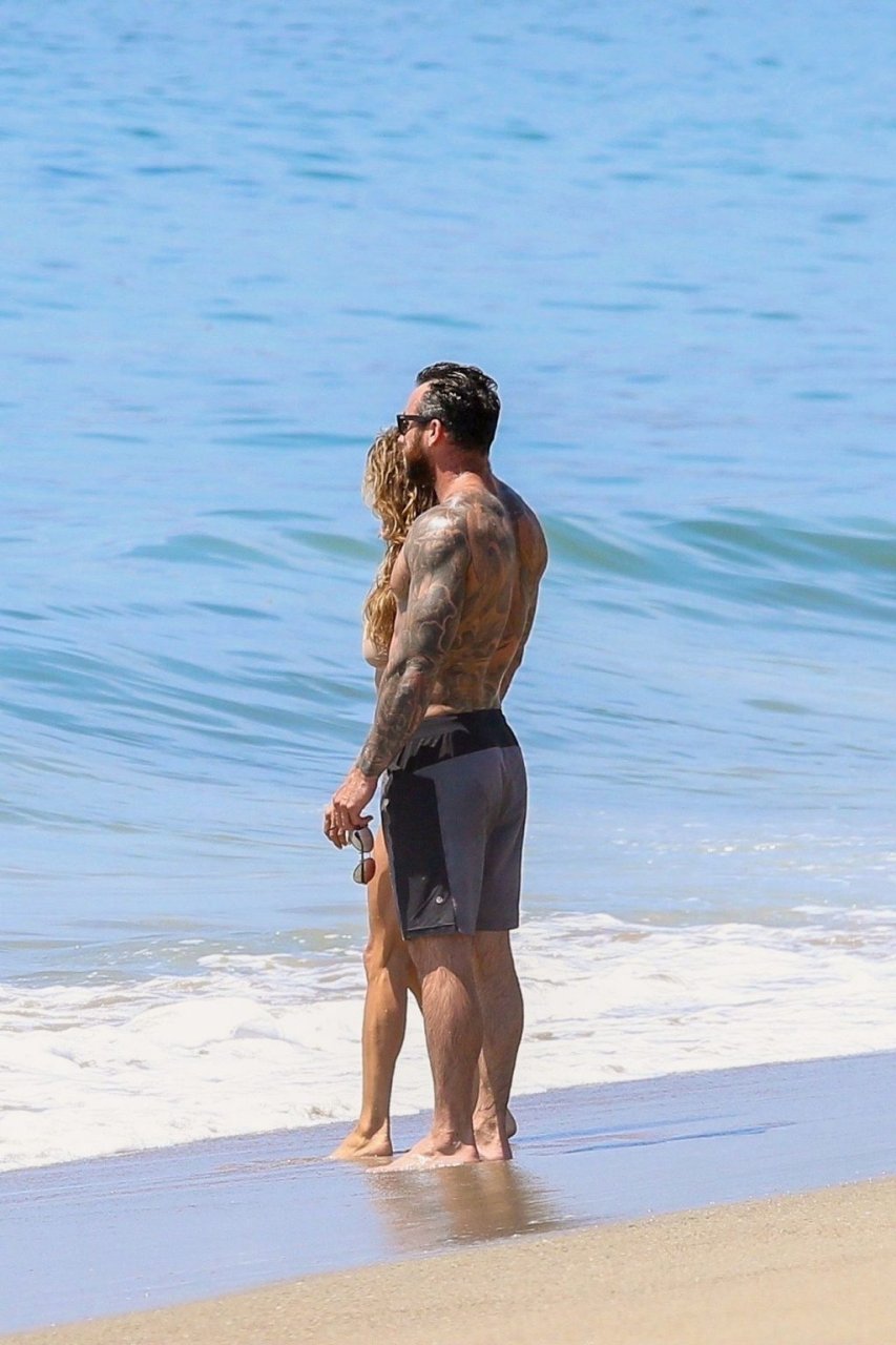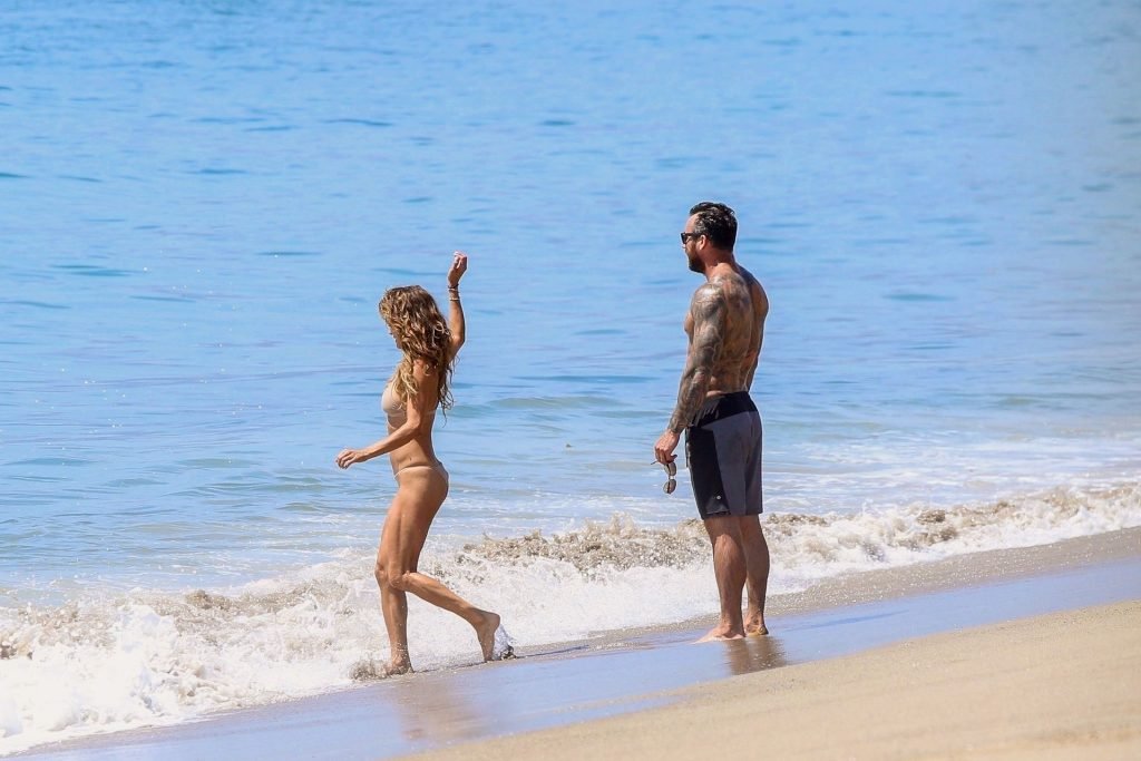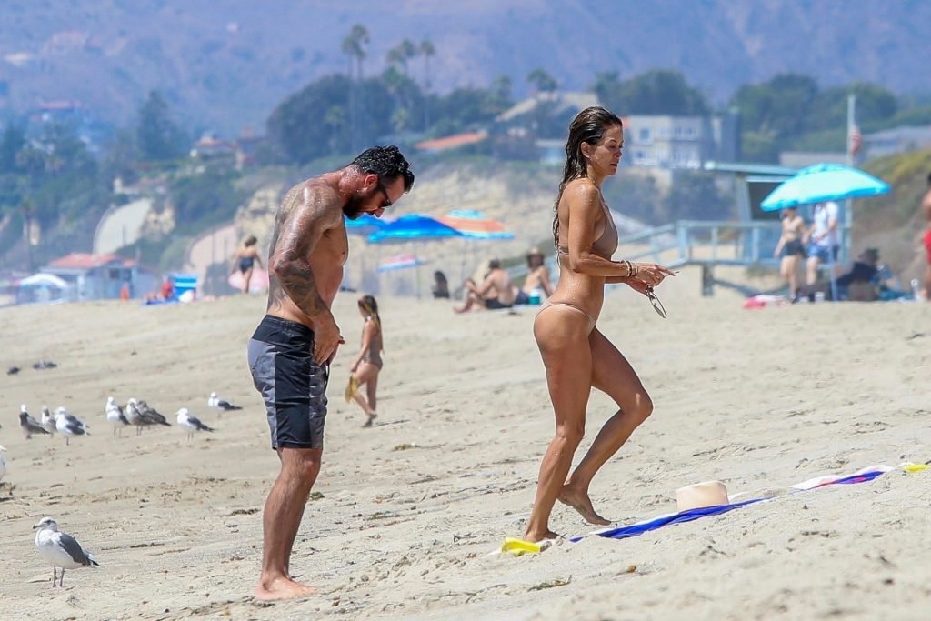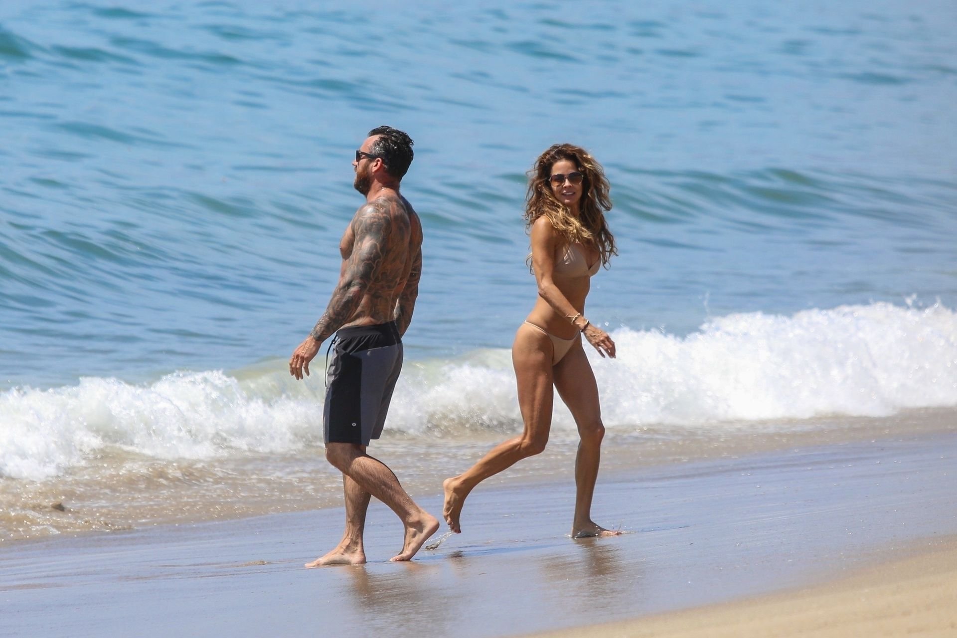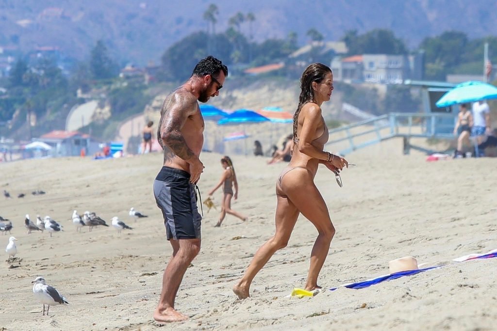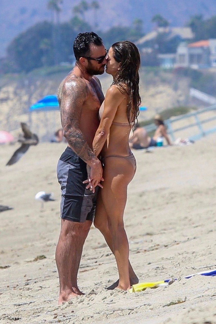 Brooke Burke está deslumbrante em um biquíni nude enquanto troca beijos com um novo namorado tatuado na praia em Malibu após um mergulho no oceano em um dia quente em Los Angeles, 26/08/2019.