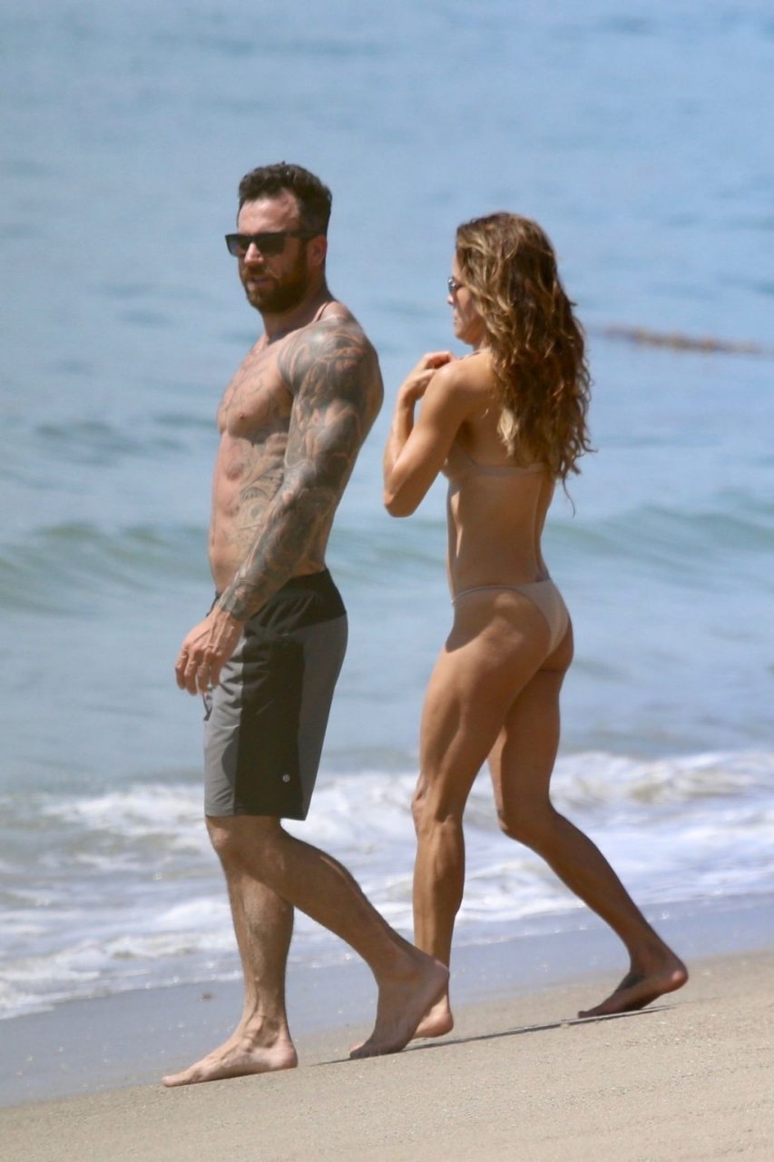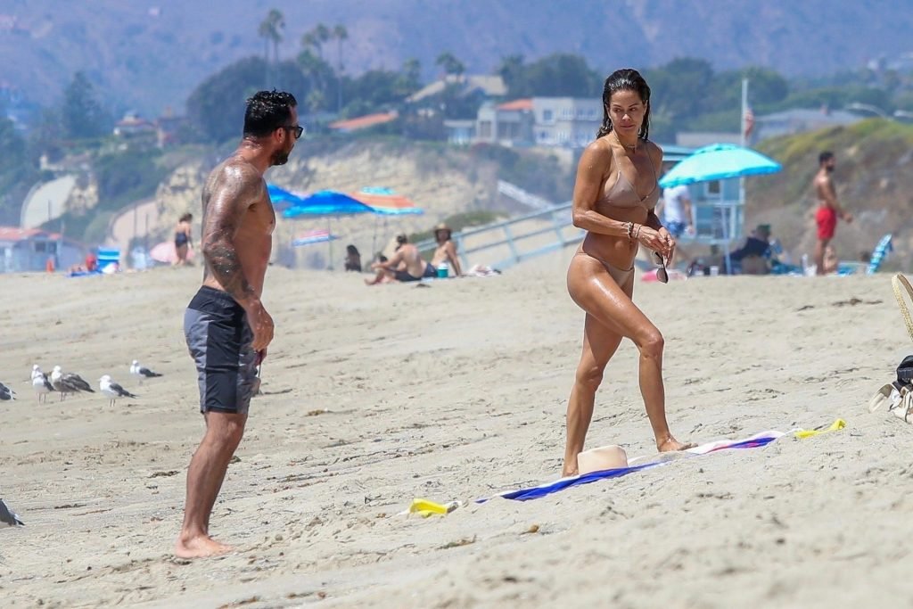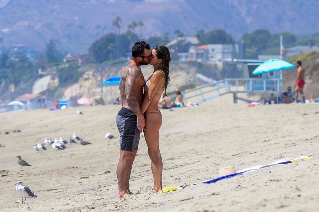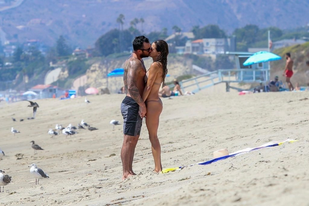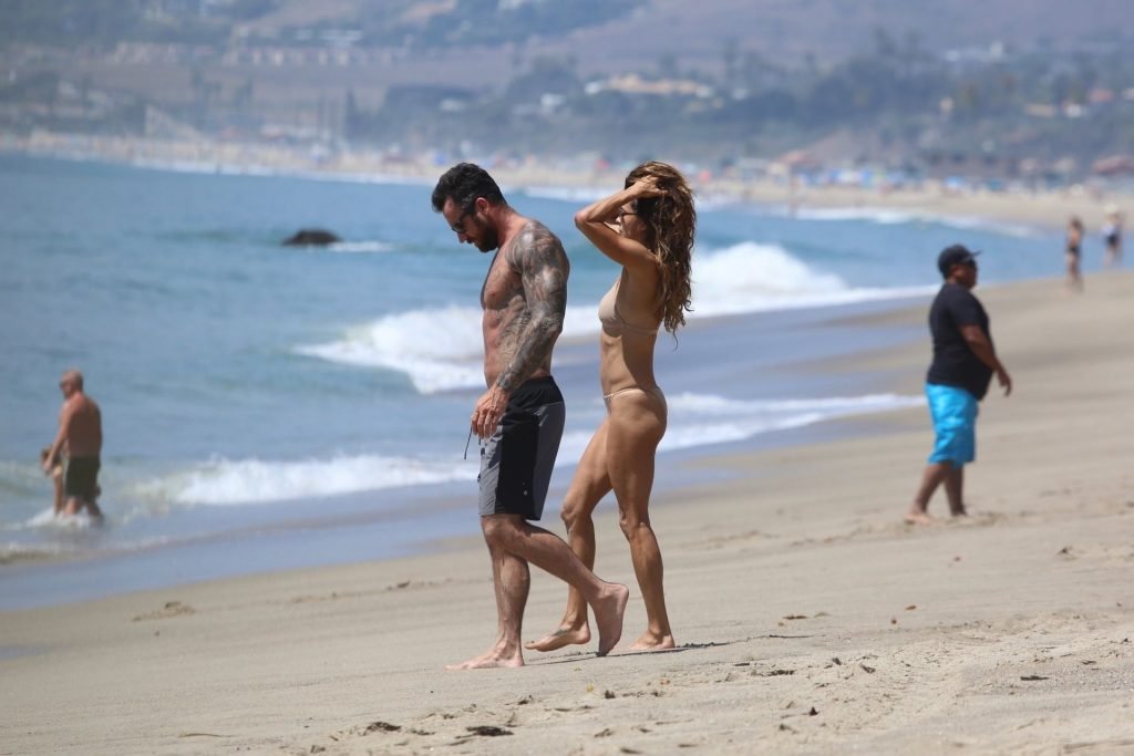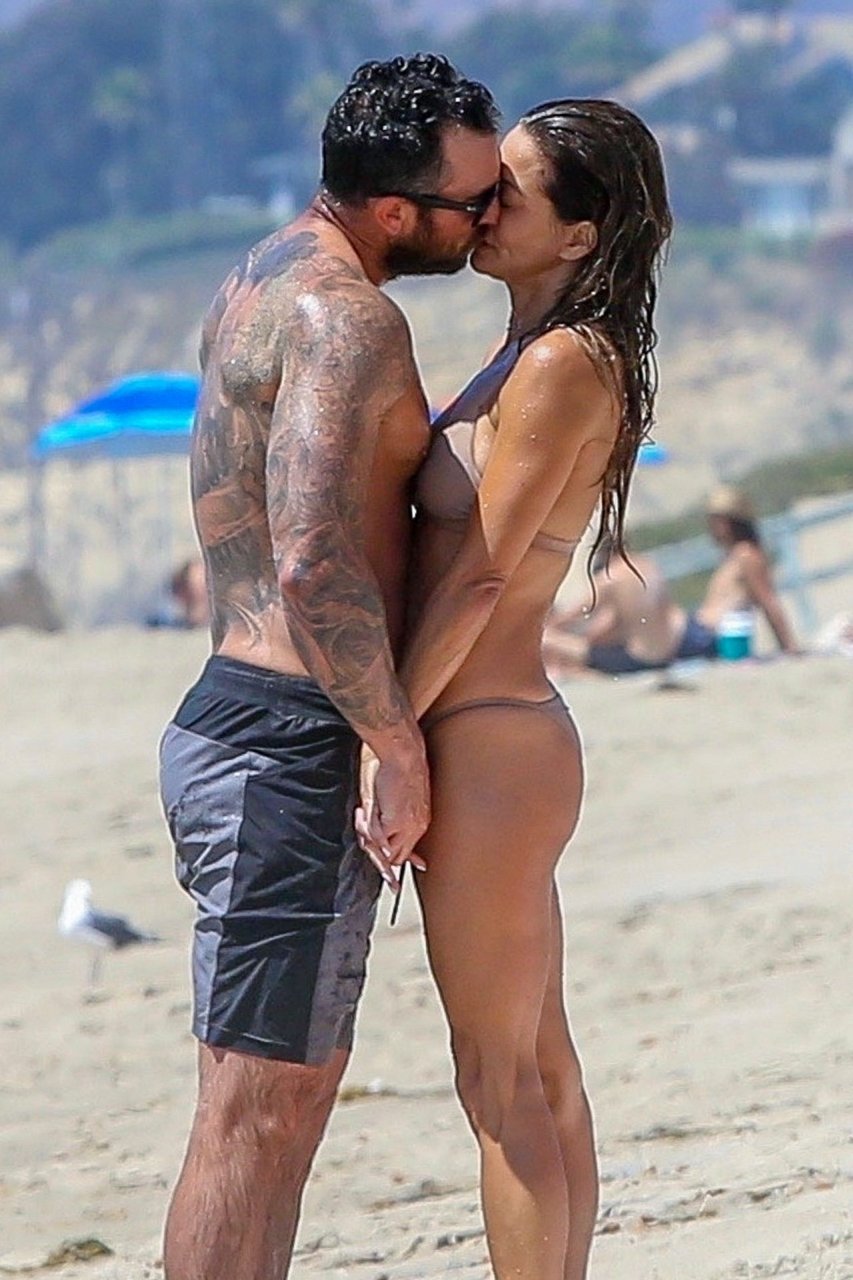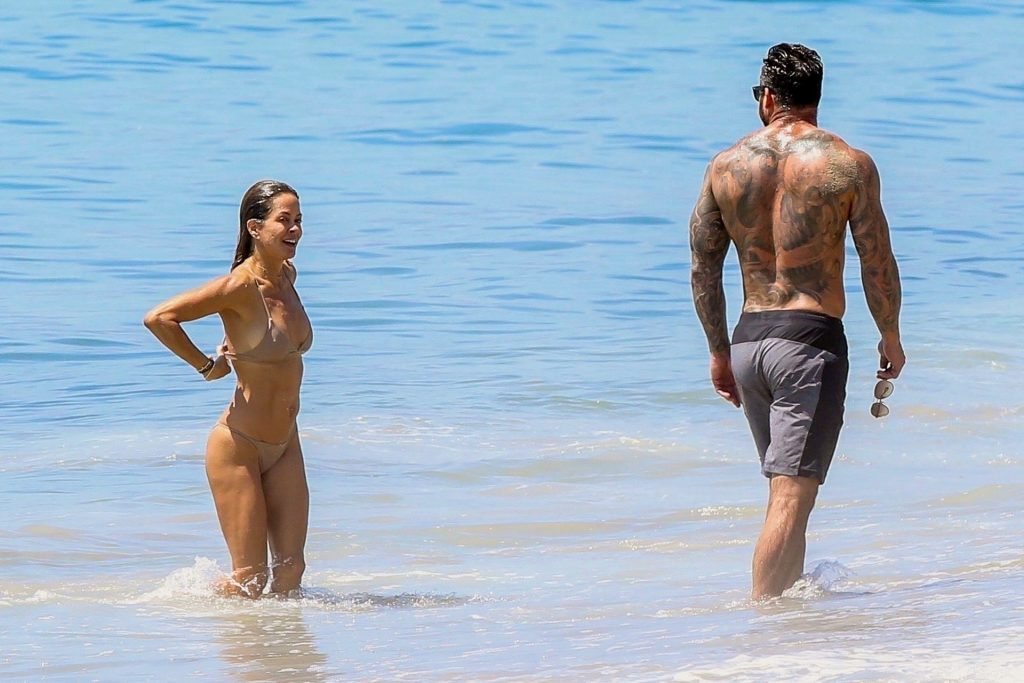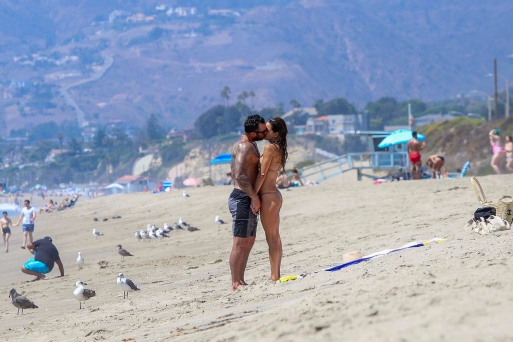 Brooke Burke está deslumbrante em um biquíni nude enquanto troca beijos com um novo namorado tatuado na praia em Malibu após um mergulho no oceano em um dia quente em Los Angeles, 26/08/2019.
