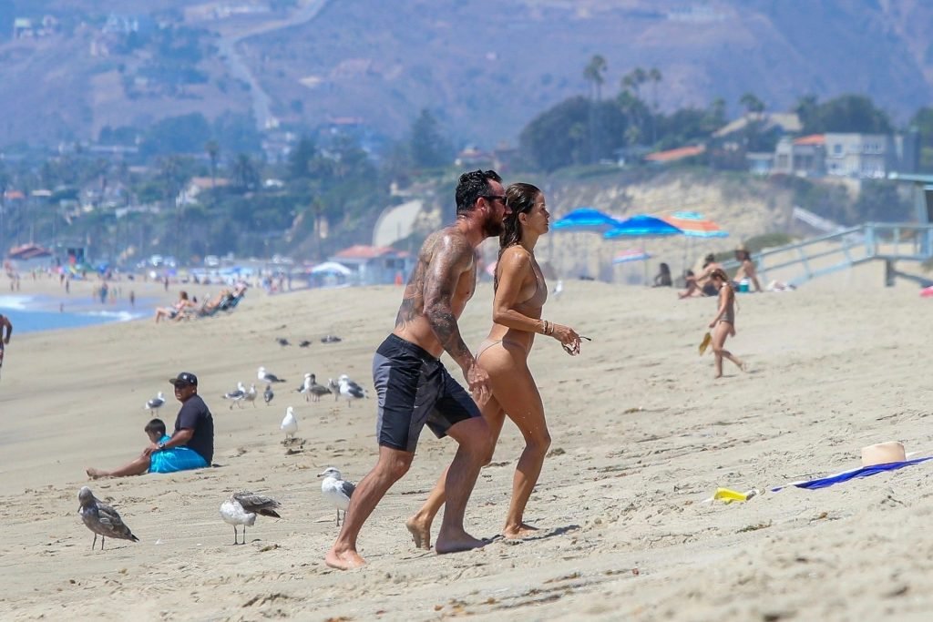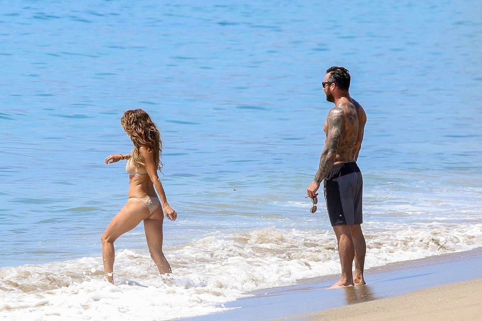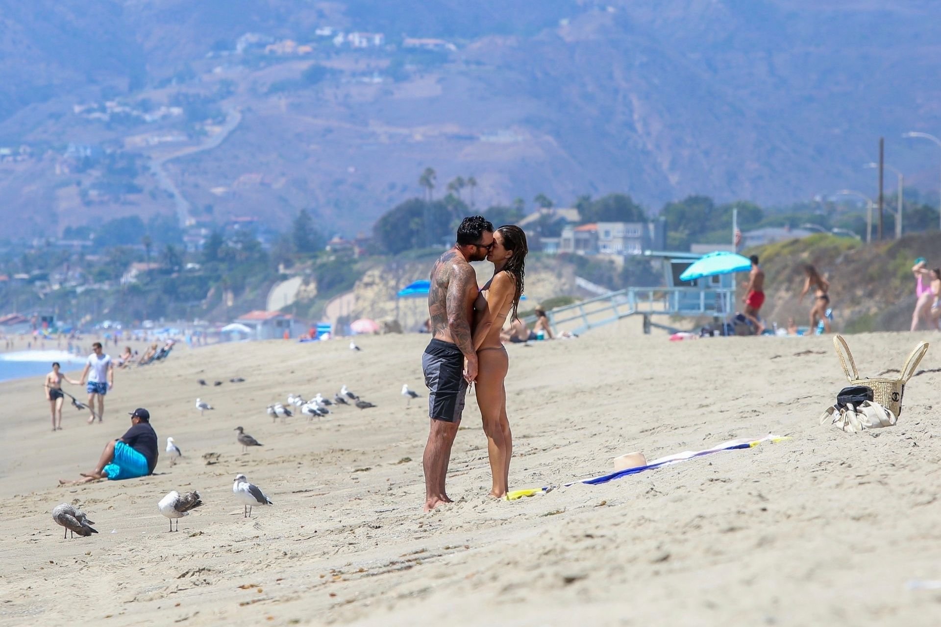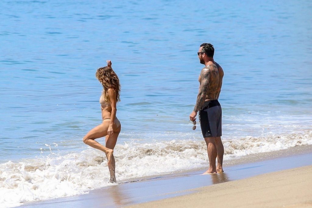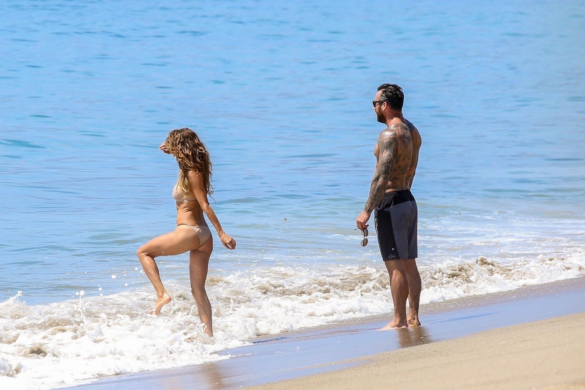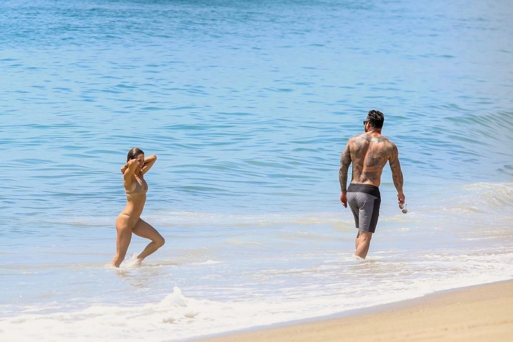 Brooke Burke está deslumbrante em um biquíni nude enquanto troca beijos com um novo namorado tatuado na praia em Malibu após um mergulho no oceano em um dia quente em Los Angeles, 26/08/2019.