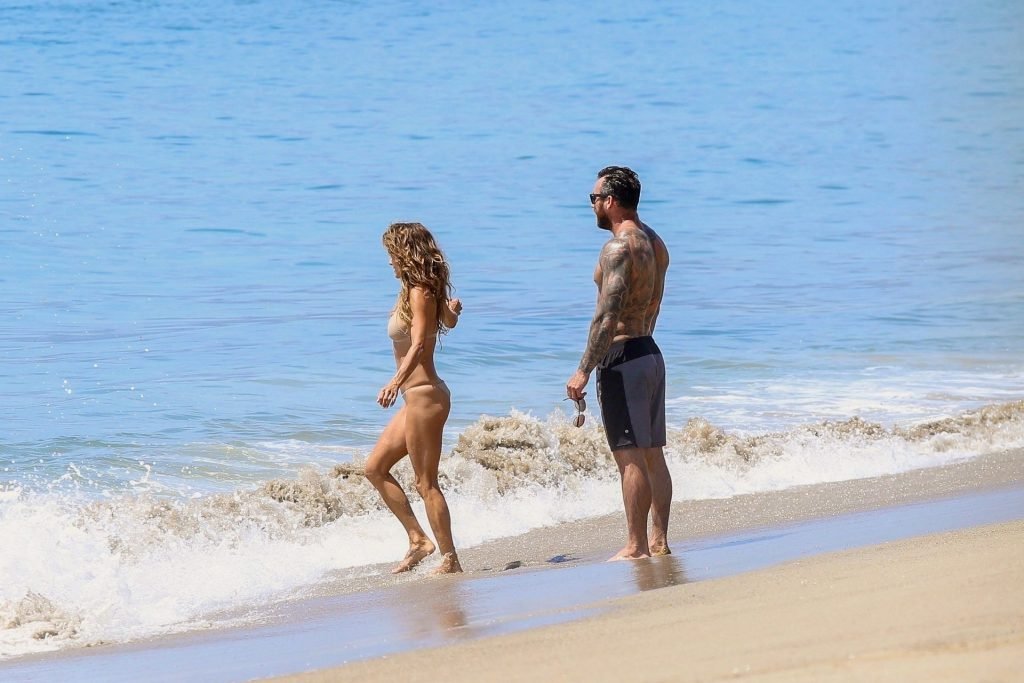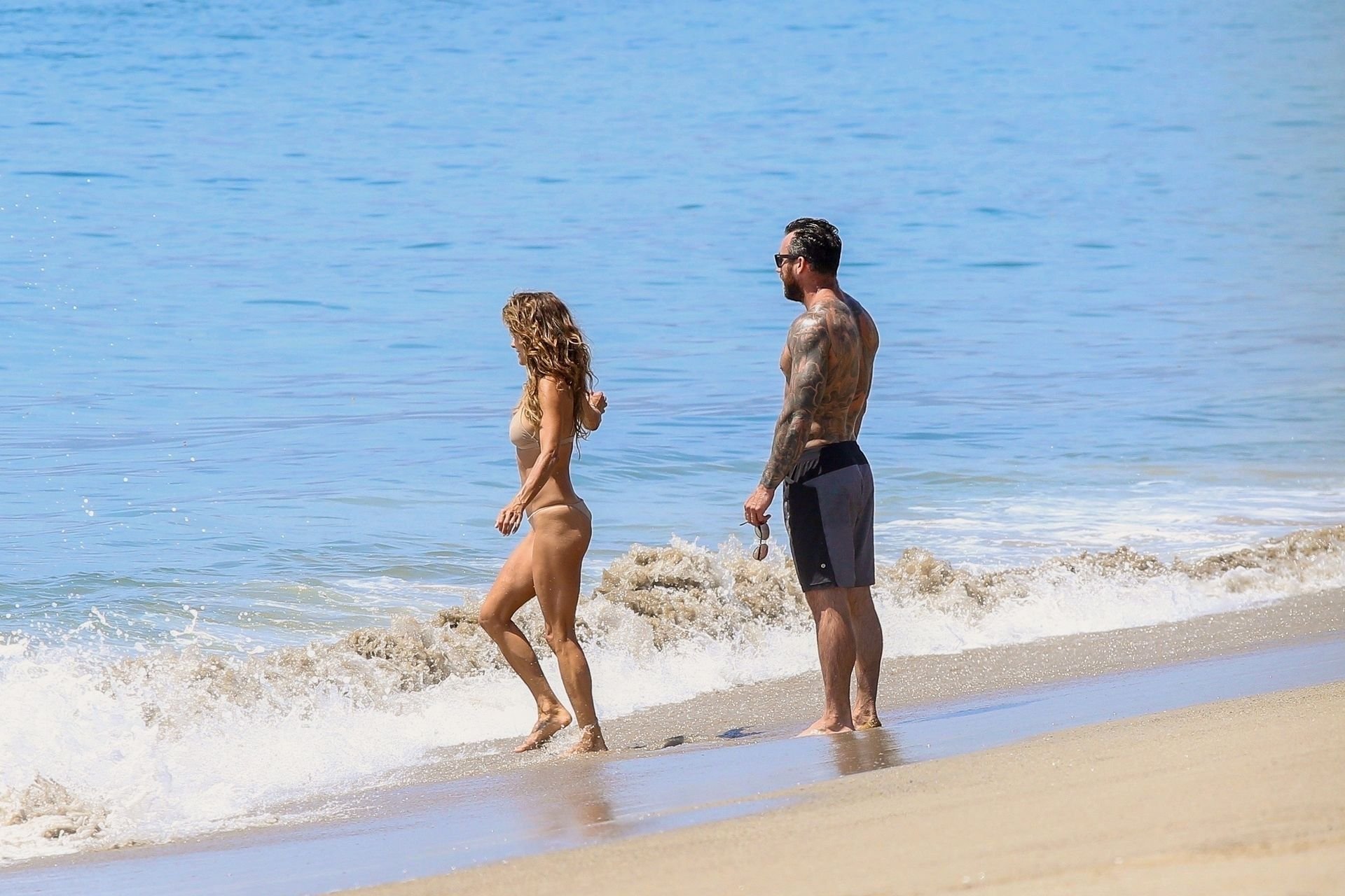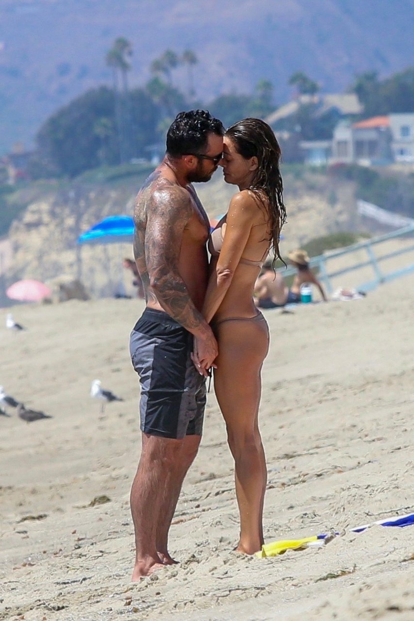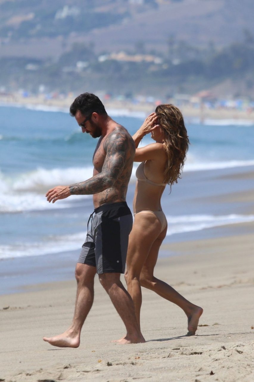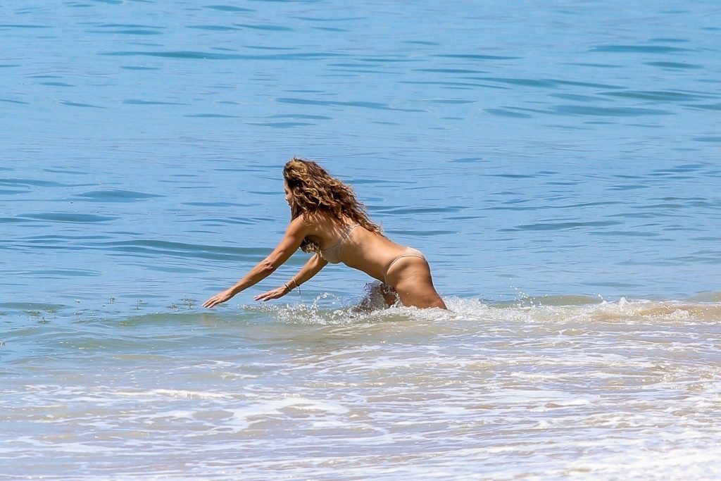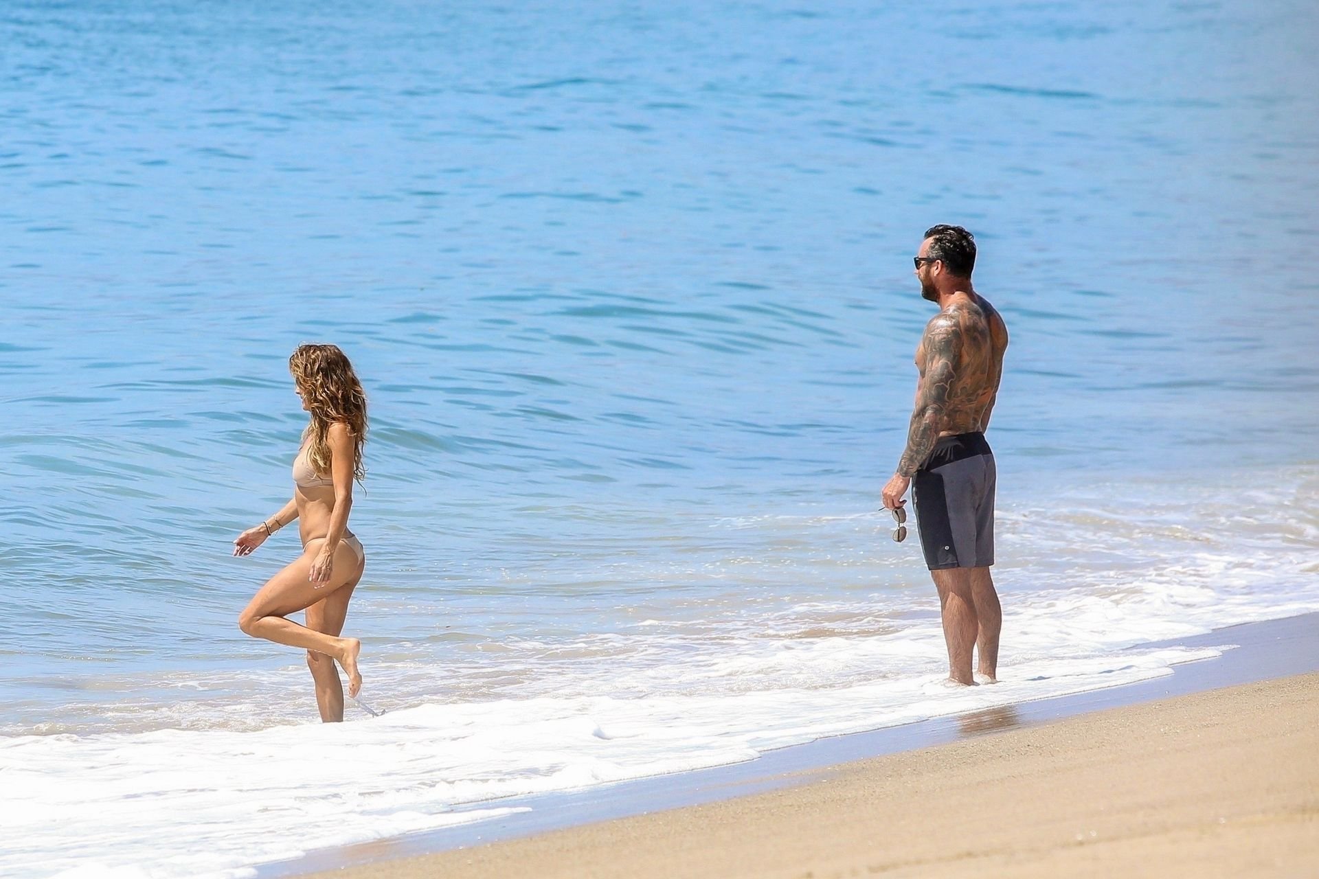 Brooke Burke está deslumbrante em um biquíni nude enquanto troca beijos com um novo namorado tatuado na praia em Malibu após um mergulho no oceano em um dia quente em Los Angeles, 26/08/2019.