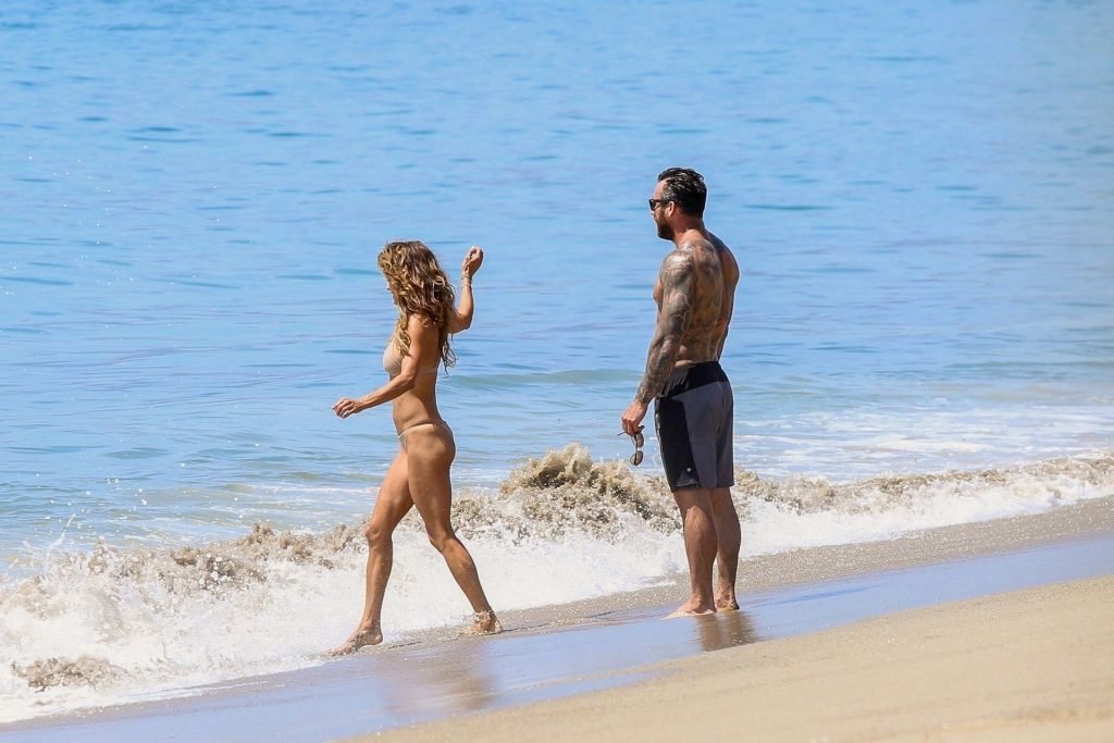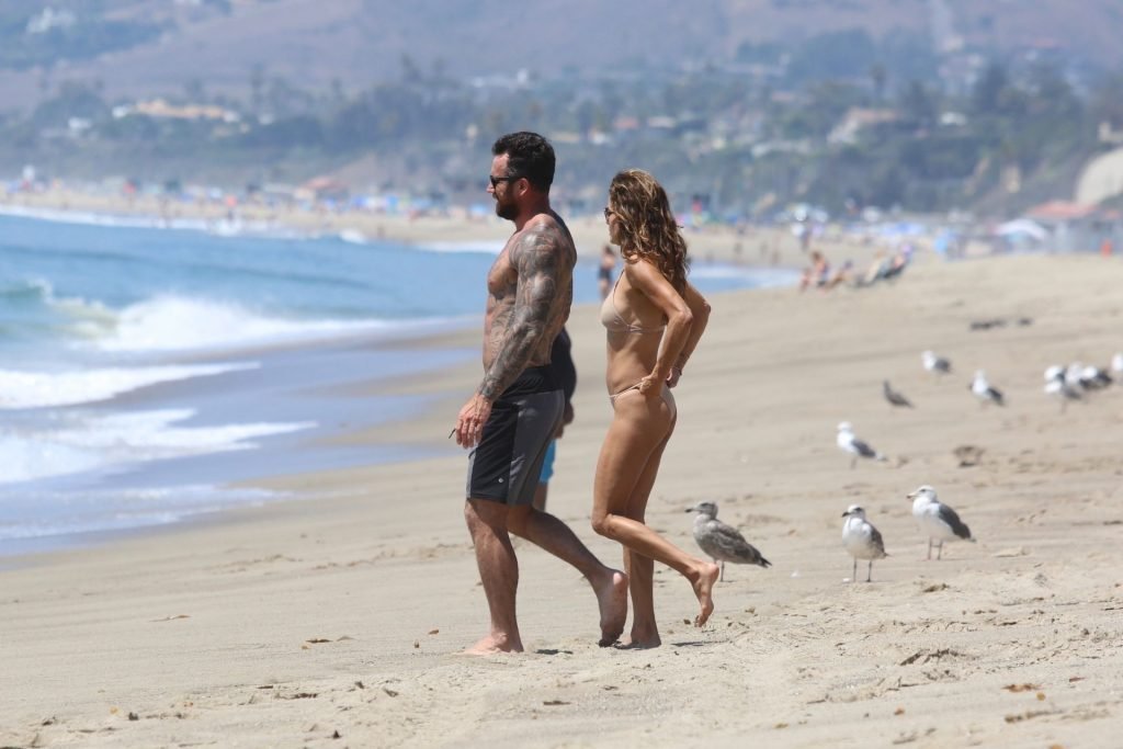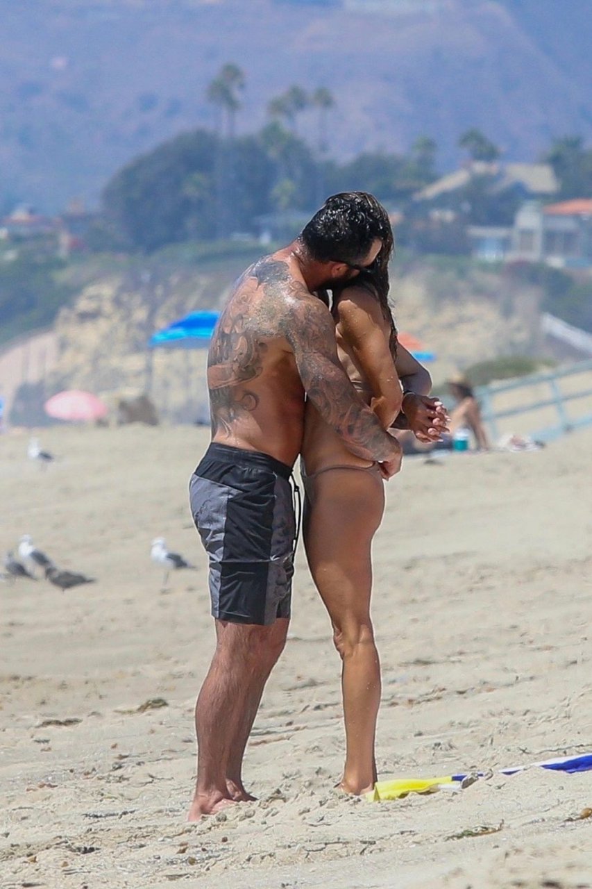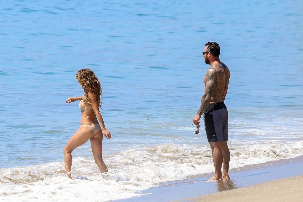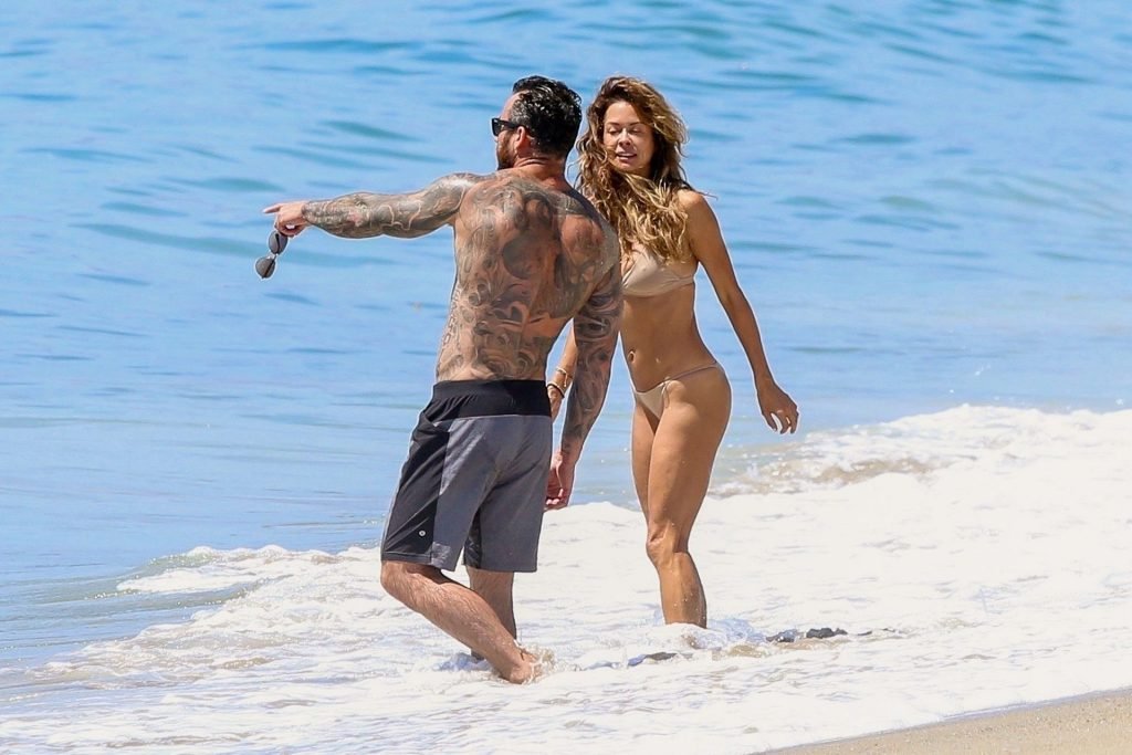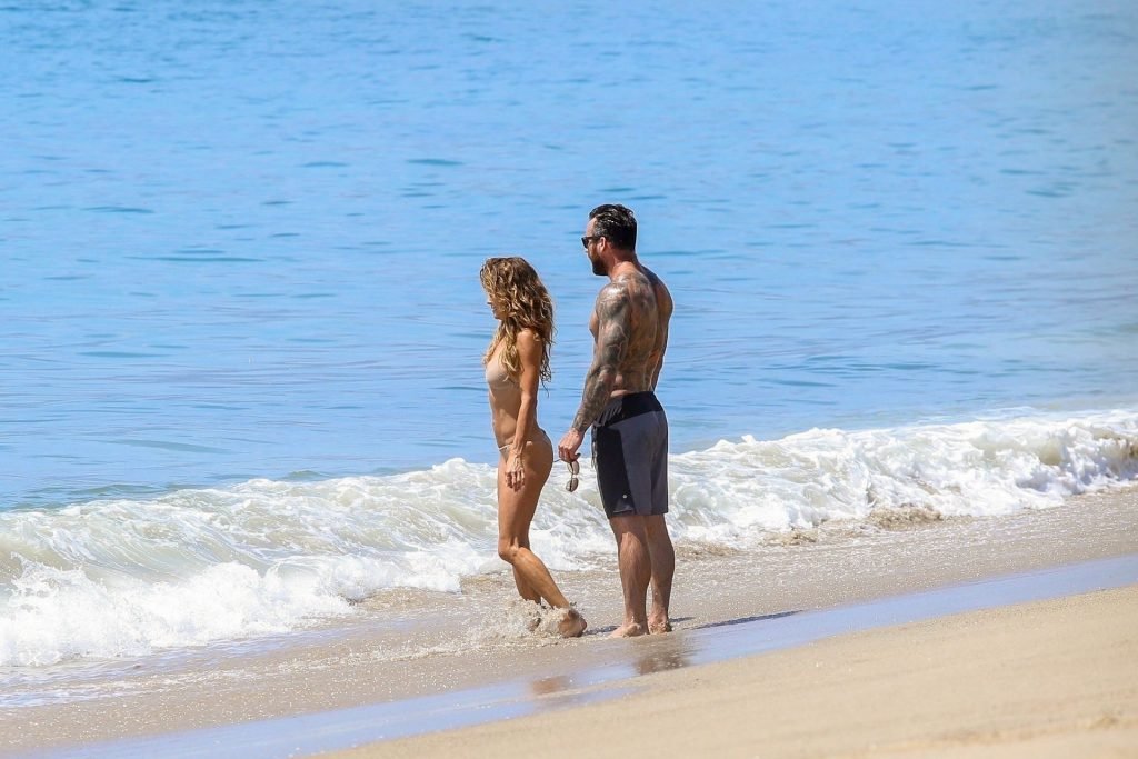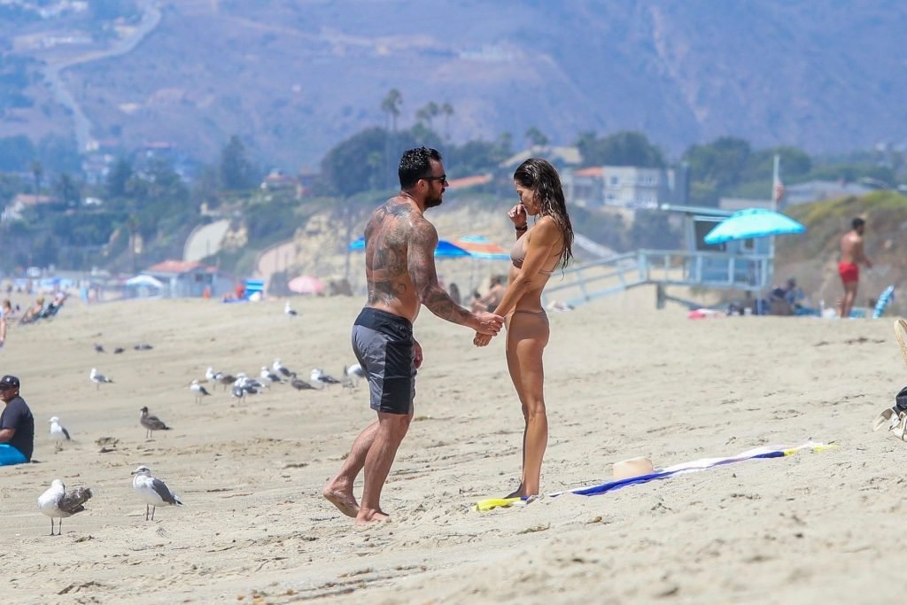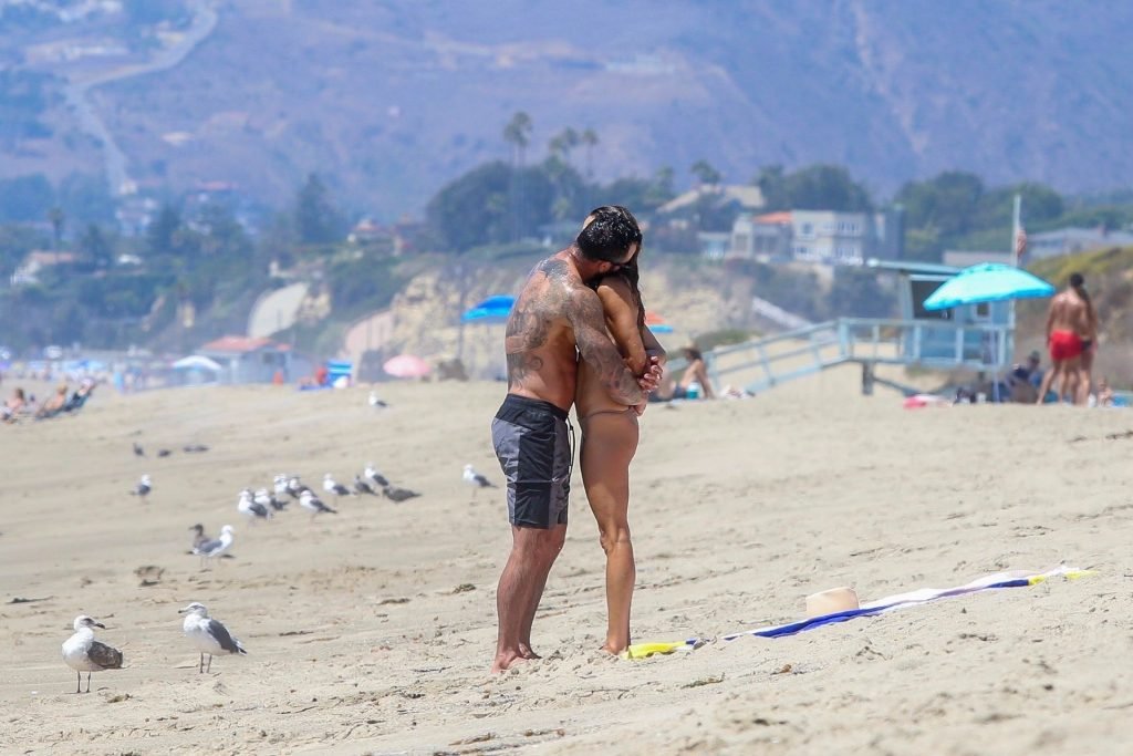 Brooke Burke está deslumbrante em um biquíni nude enquanto troca beijos com um novo namorado tatuado na praia em Malibu após um mergulho no oceano em um dia quente em Los Angeles, 26/08/2019.