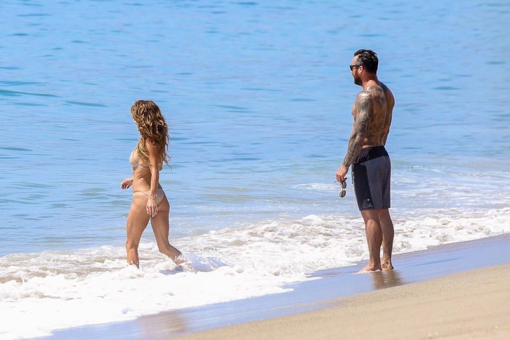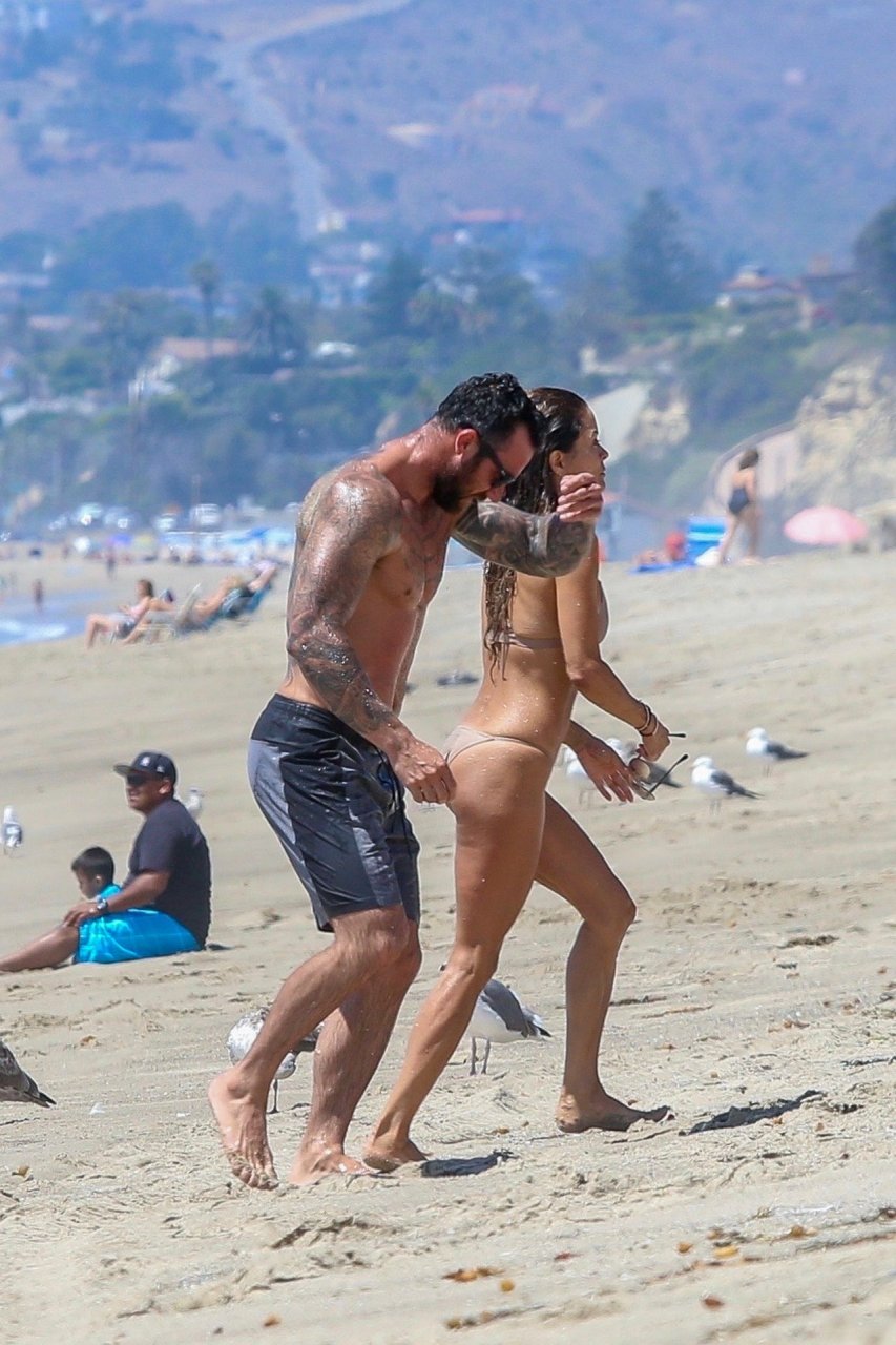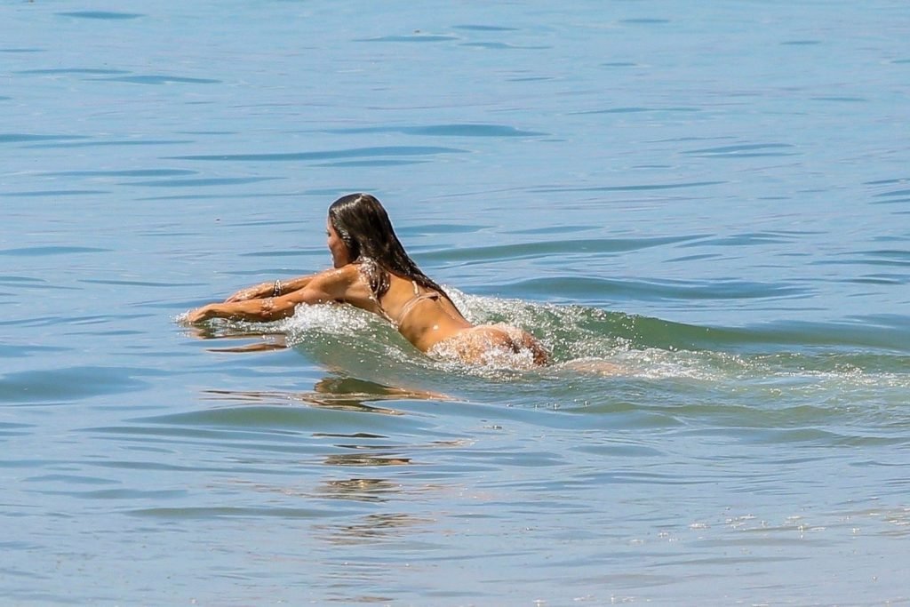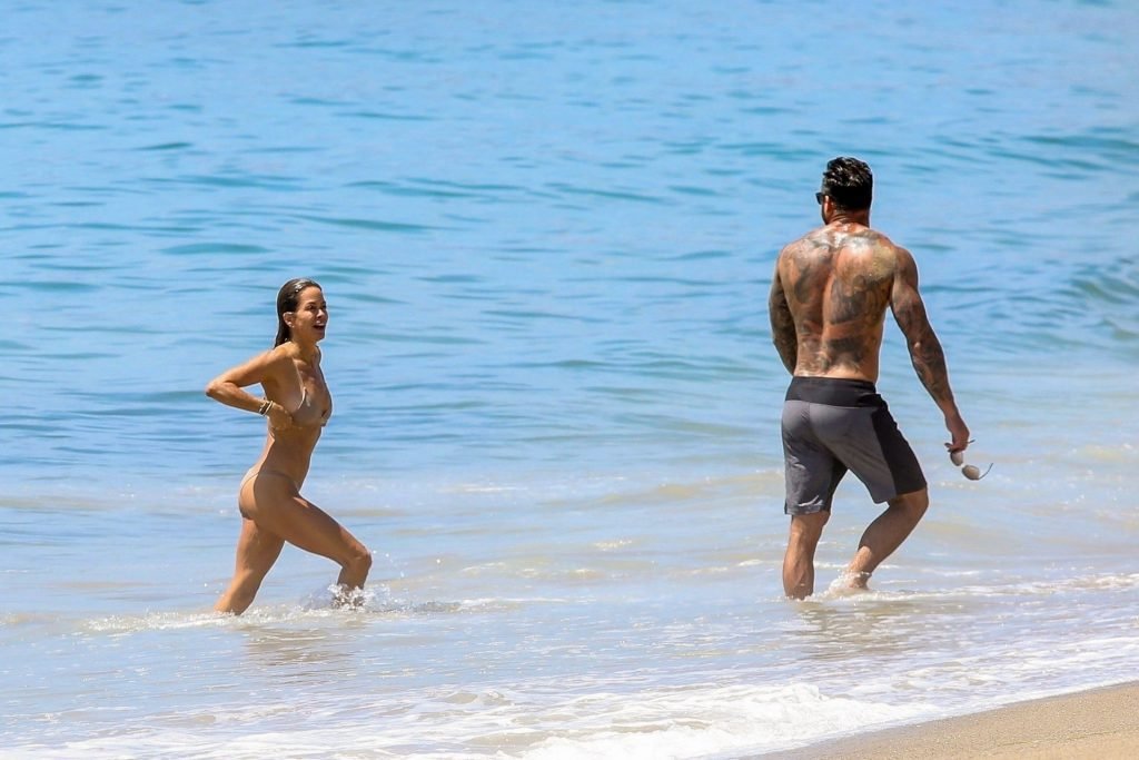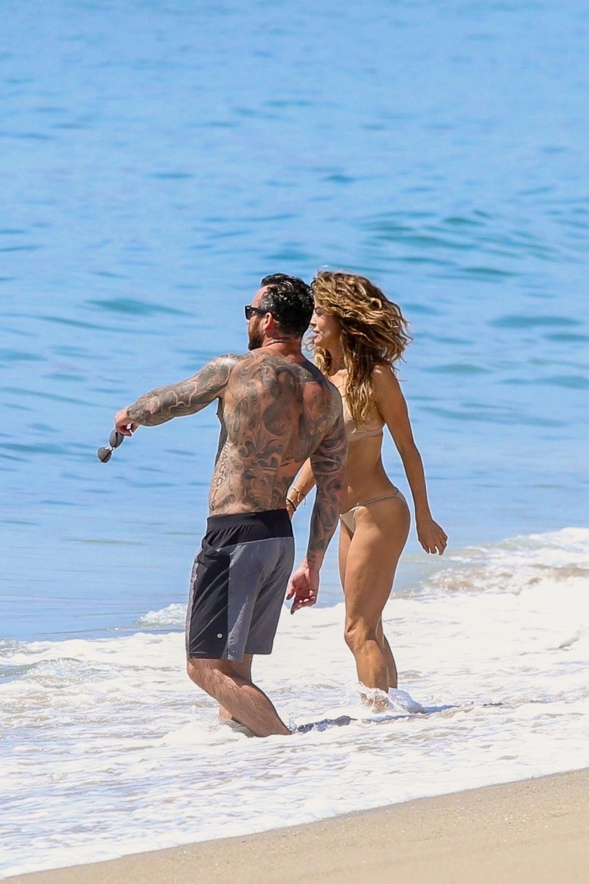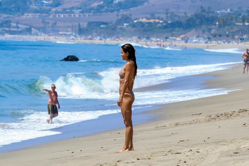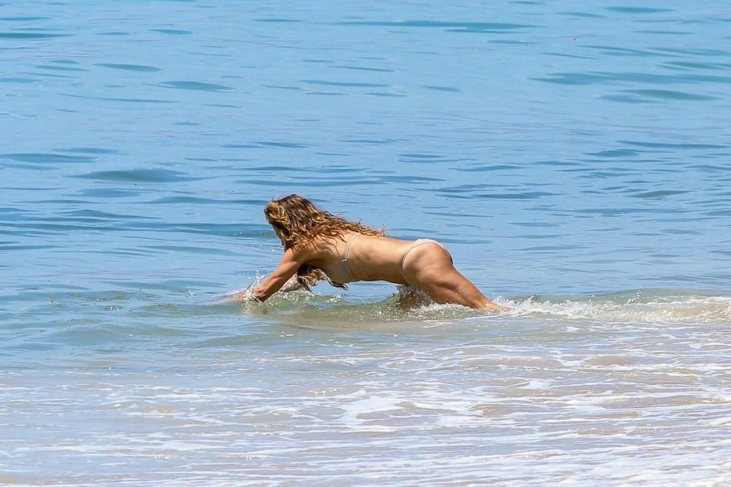 Brooke Burke está deslumbrante em um biquíni nude enquanto troca beijos com um novo namorado tatuado na praia em Malibu após um mergulho no oceano em um dia quente em Los Angeles, 26/08/2019.