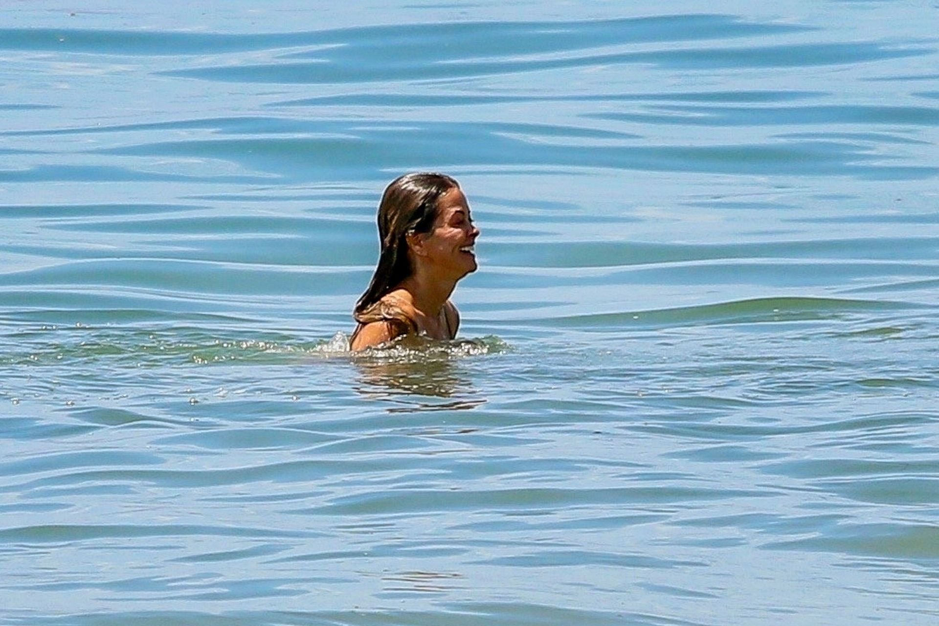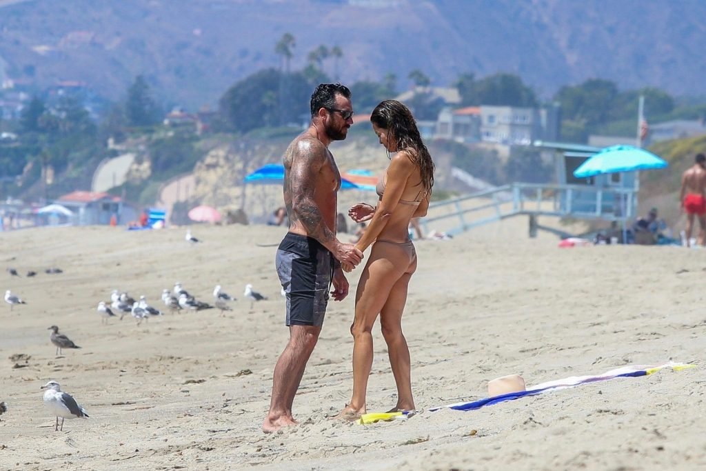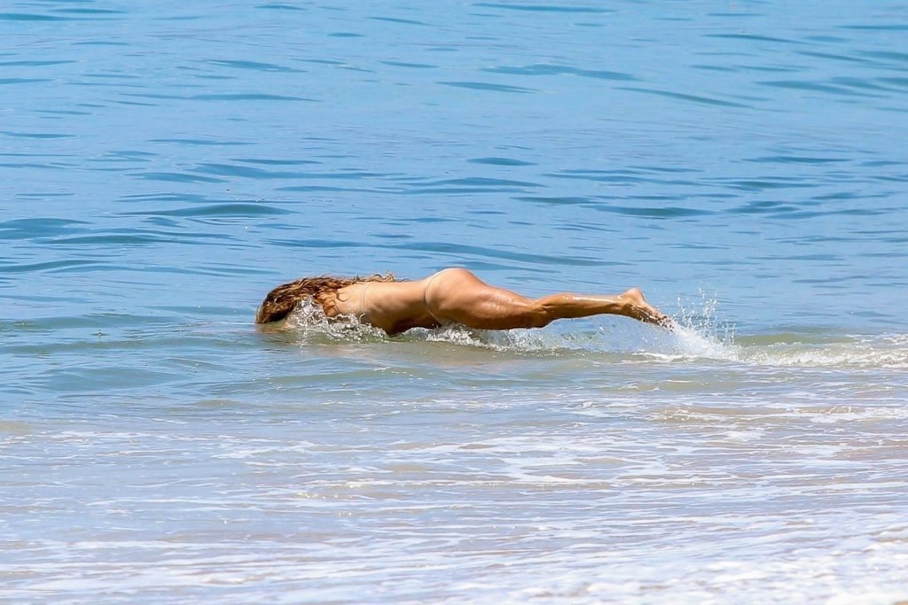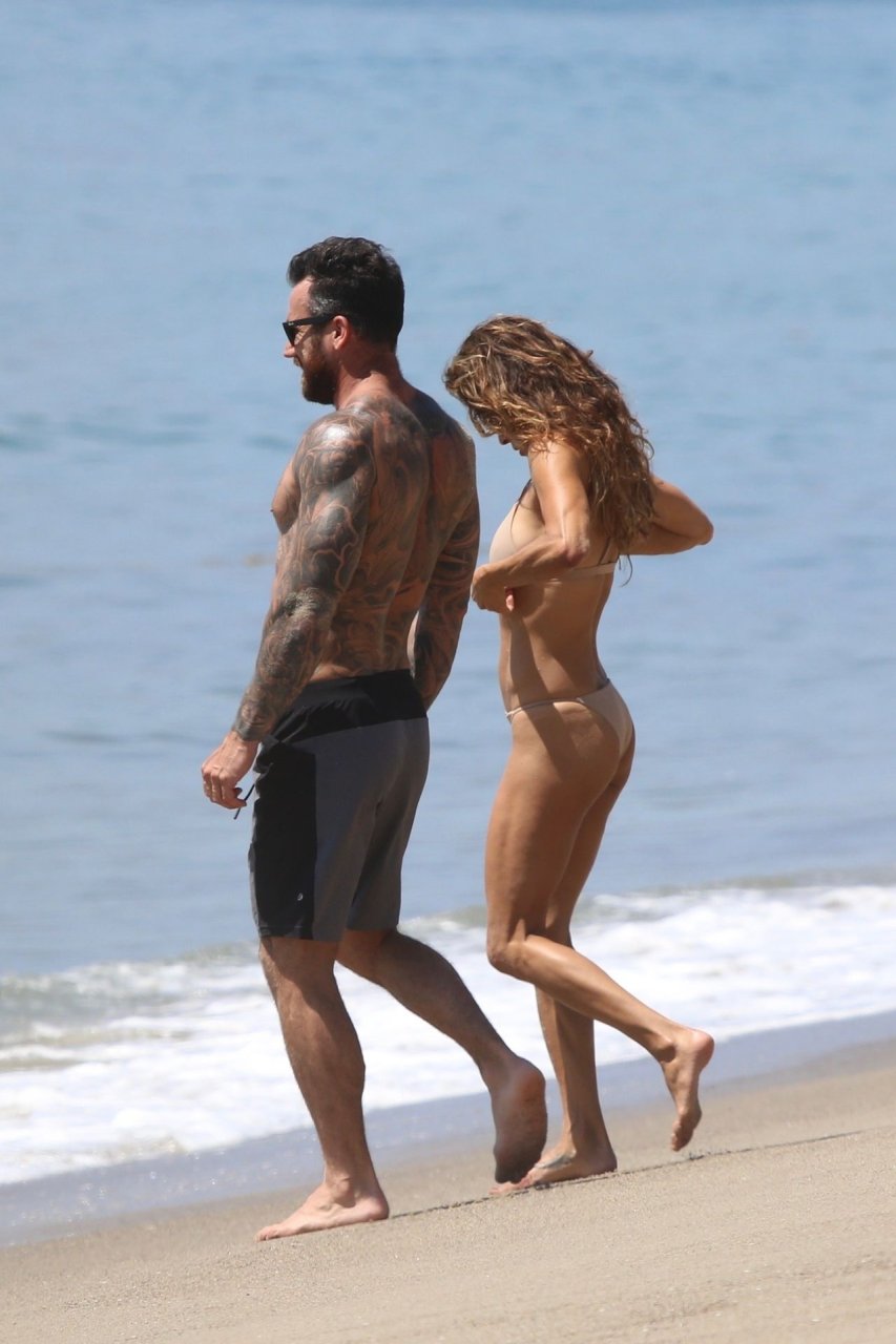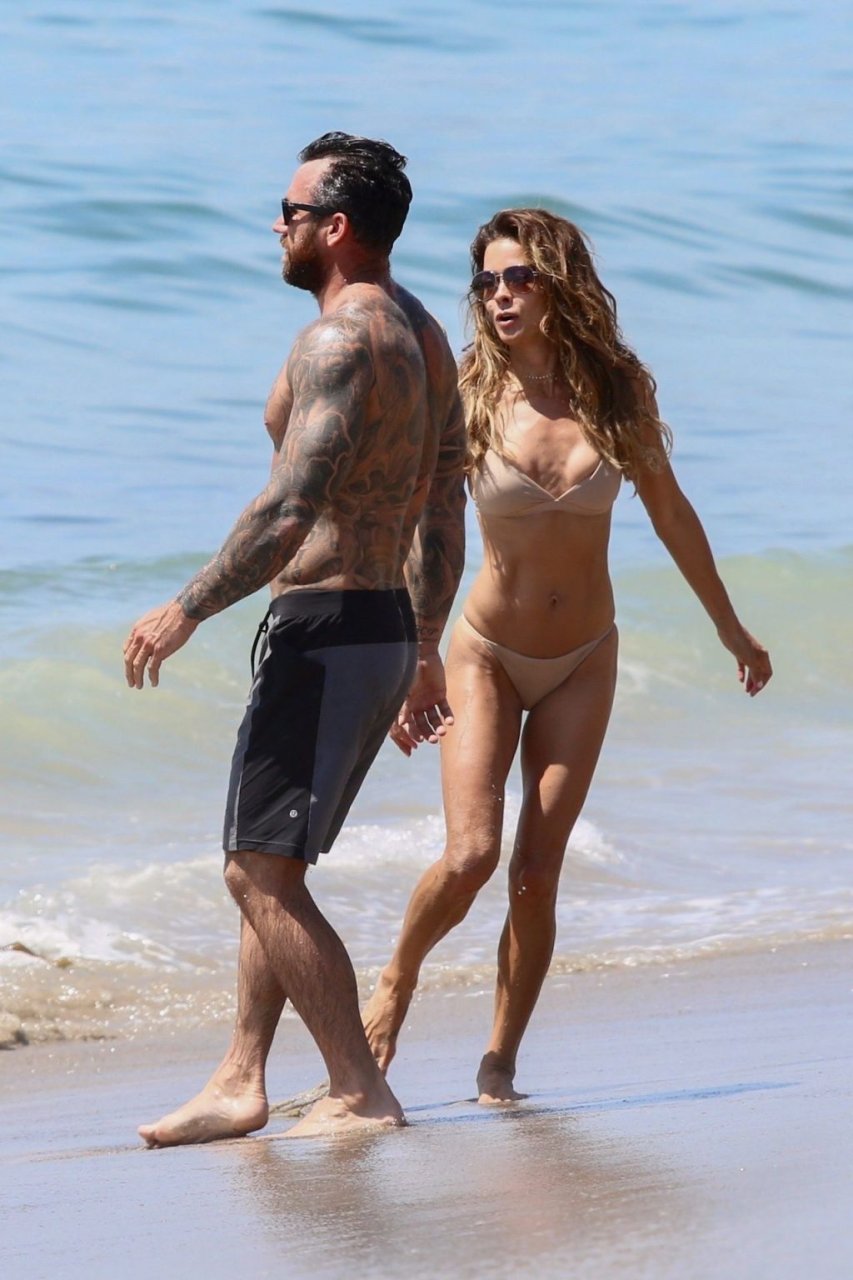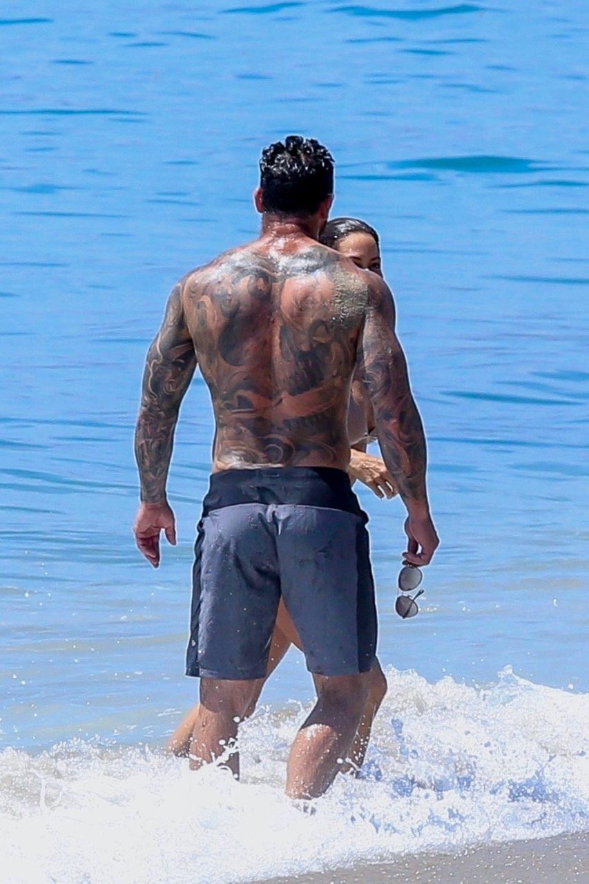 Brooke Burke está deslumbrante em um biquíni nude enquanto troca beijos com um novo namorado tatuado na praia em Malibu após um mergulho no oceano em um dia quente em Los Angeles, 26/08/2019.