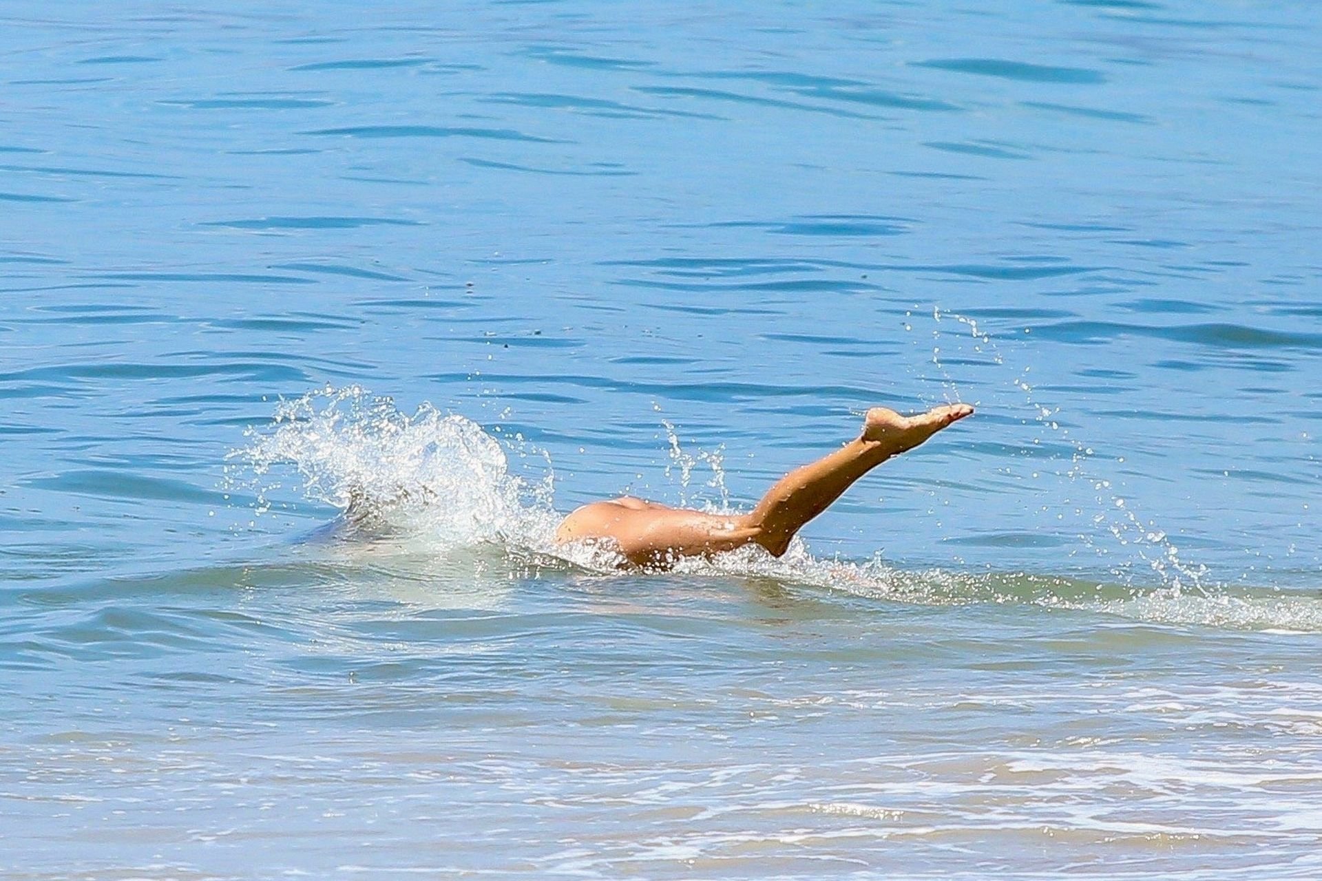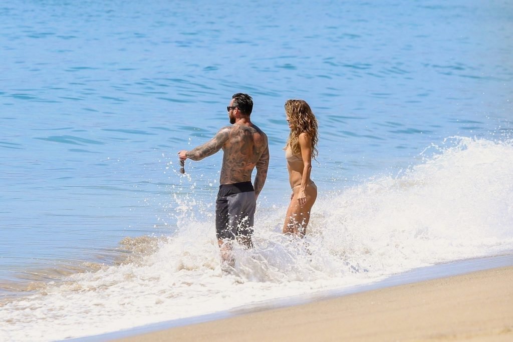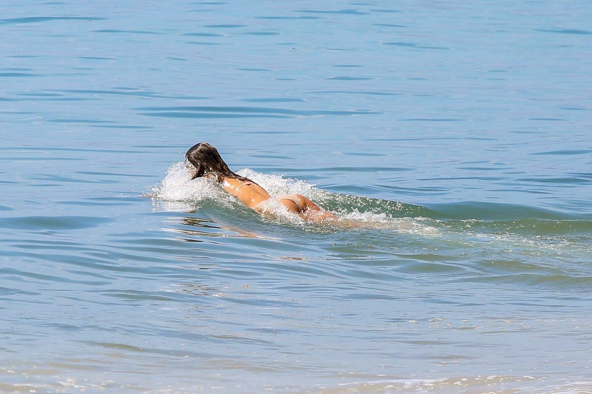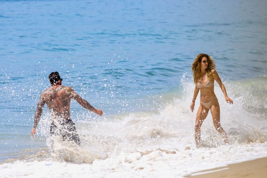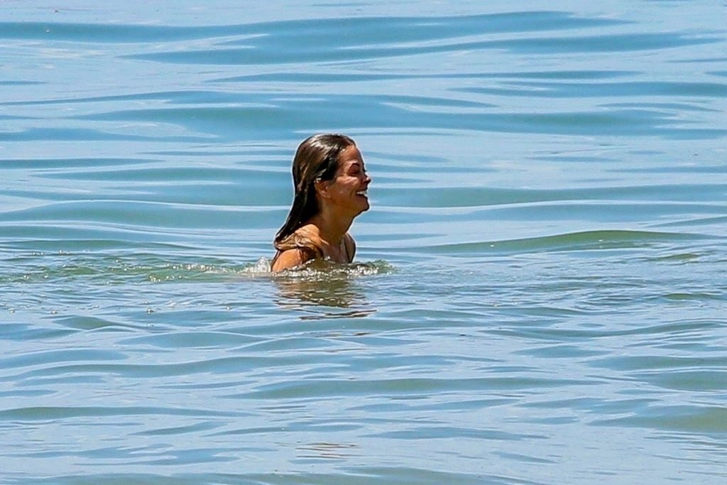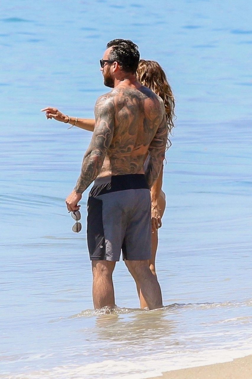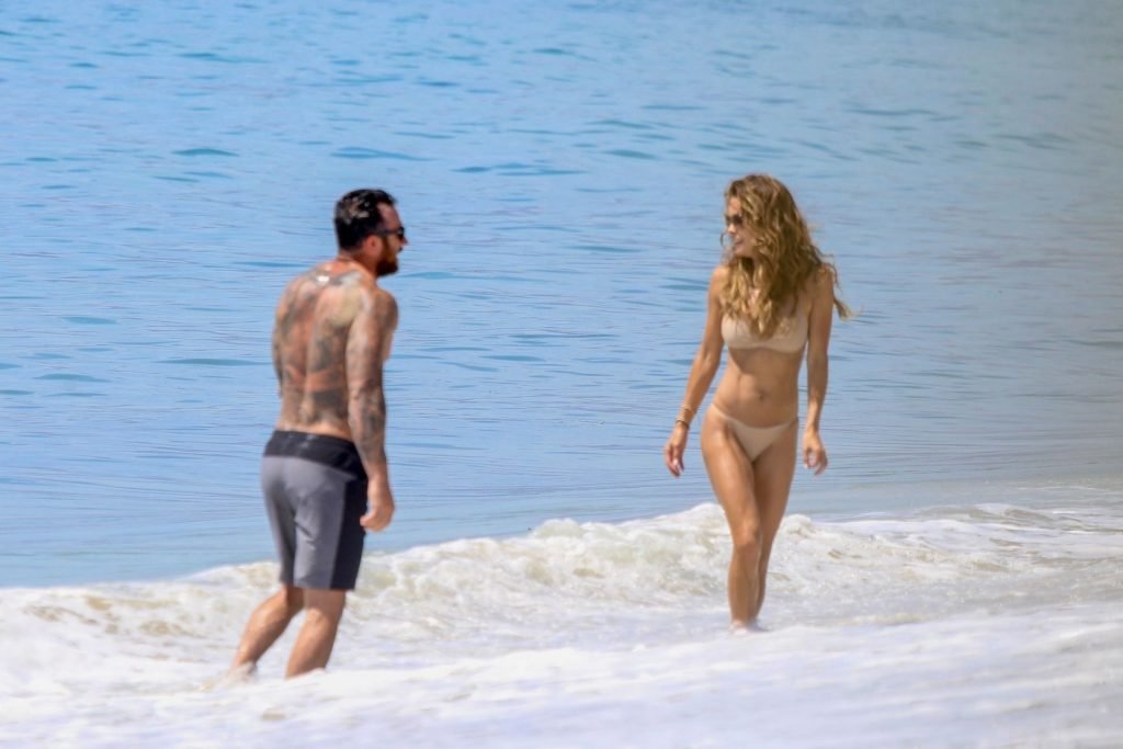 Brooke Burke está deslumbrante em um biquíni nude enquanto troca beijos com um novo namorado tatuado na praia em Malibu após um mergulho no oceano em um dia quente em Los Angeles, 26/08/2019.