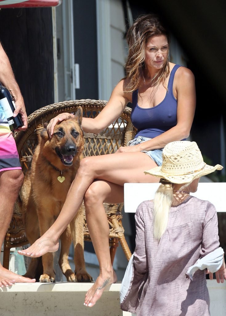 Model e atriz Brooke Burke exibe sua impressionante figura enquanto passa o dia em sua casa de praia com seus cães e alguns amigos em Malibu, 23/07/2017.