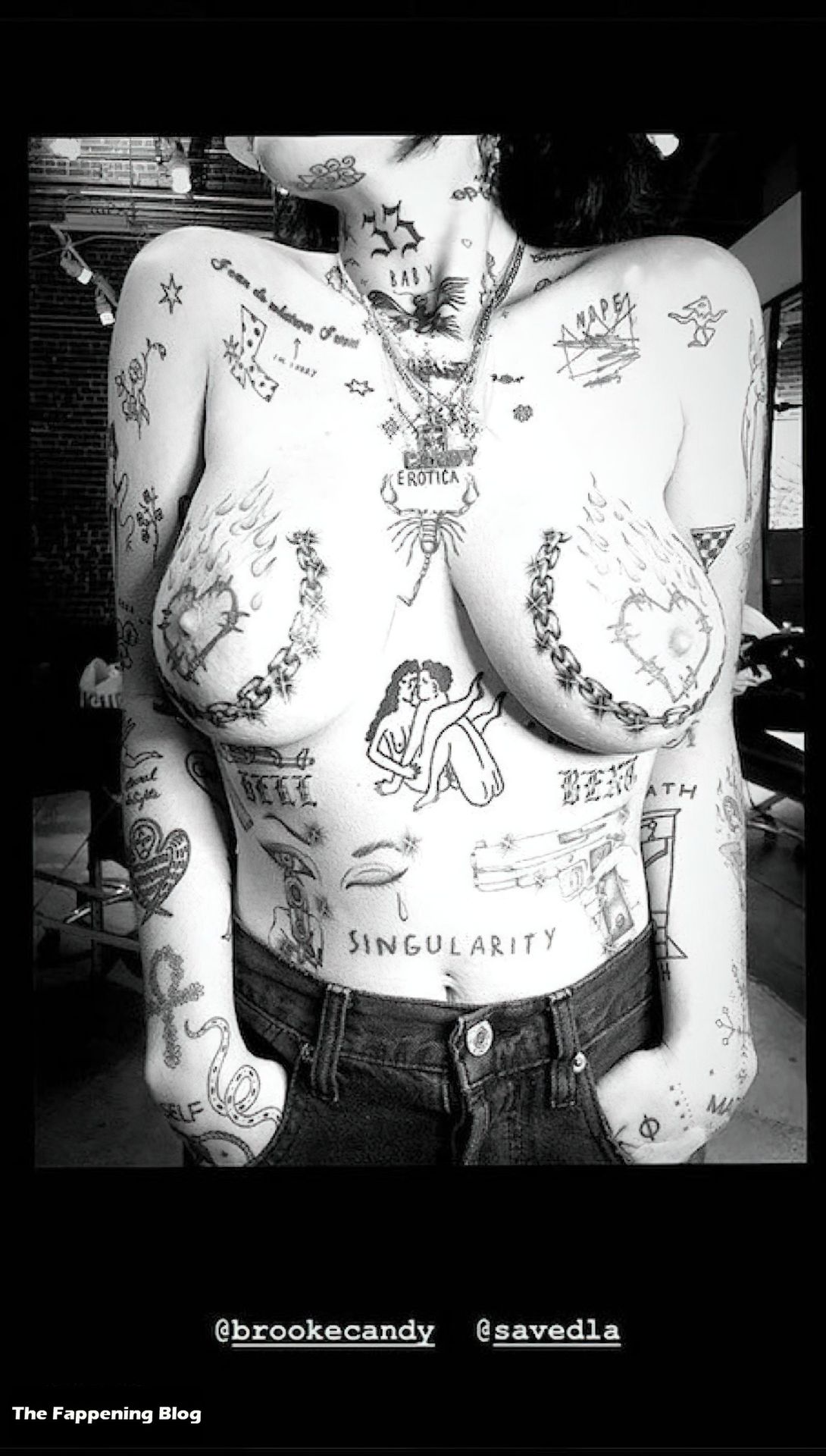 Brooke Candy está em uma nova mistura nua/sexy, mostrando seus seios nus e corpo tatuado quente em várias sessões eróticas, de mídia social e performances.