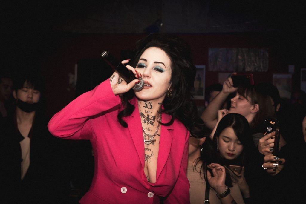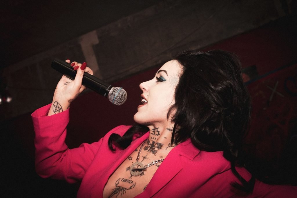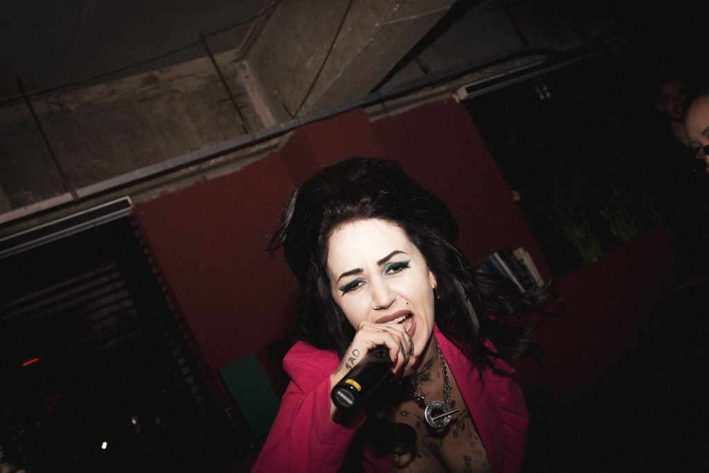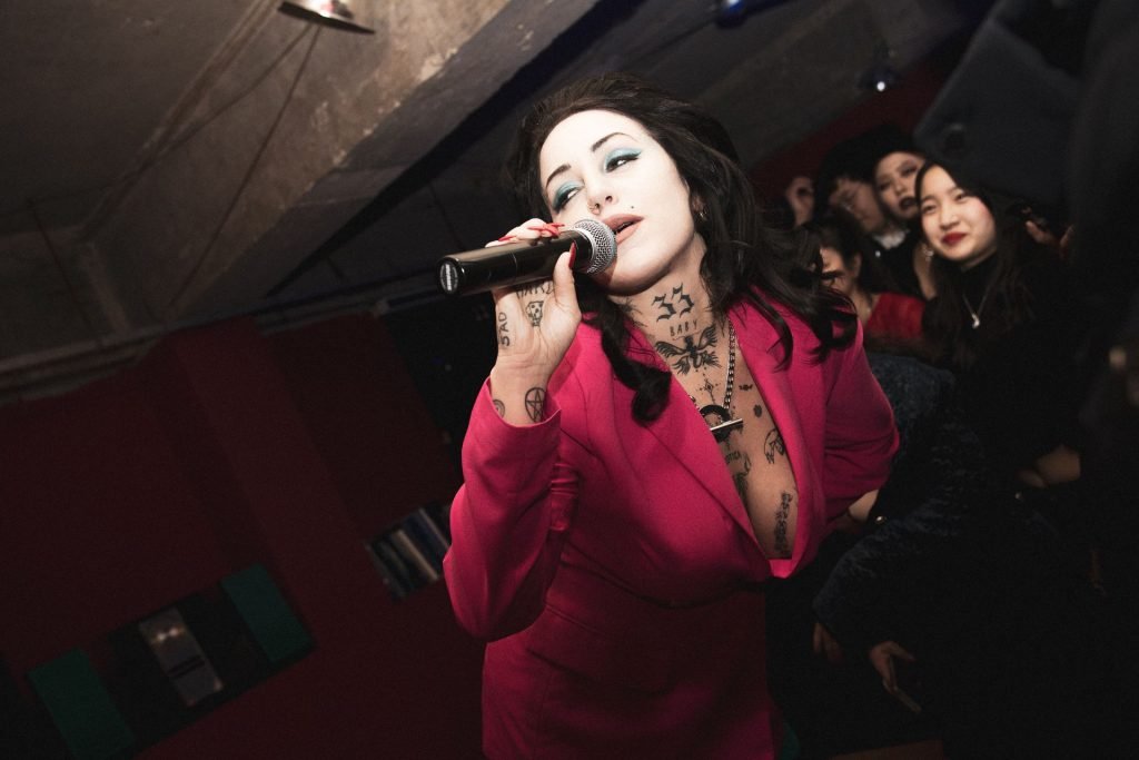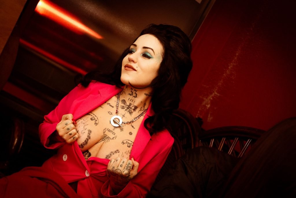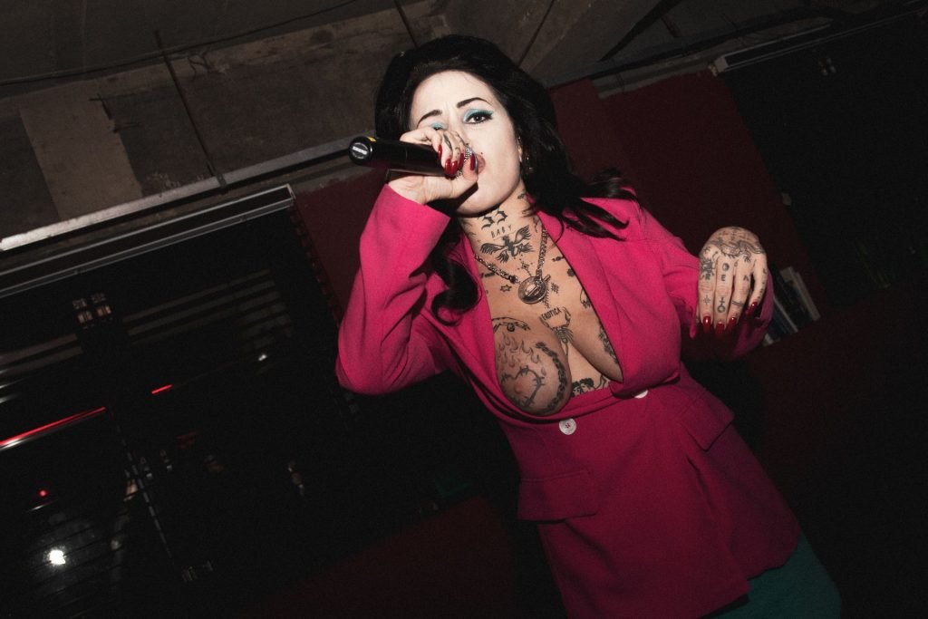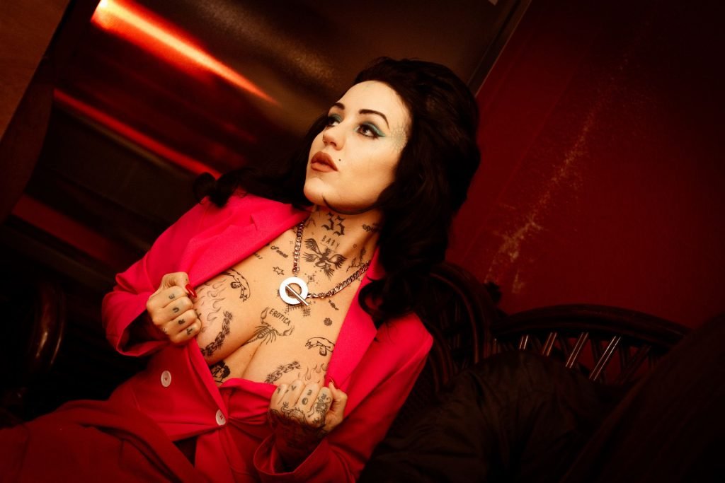 Um artista de sucesso e de alto perfil, sem dúvida, a julgar pelo local - um porão - e pelas legiões de fãs presentes. Quanto aos seios, não consigo dizer como são; as tatuagens realmente fazem um bom trabalho escondendo-os.