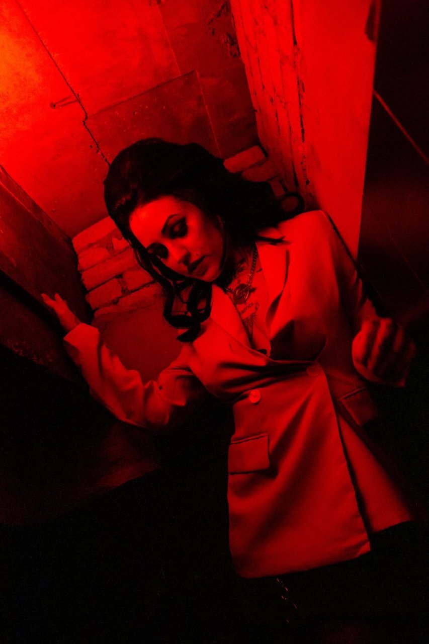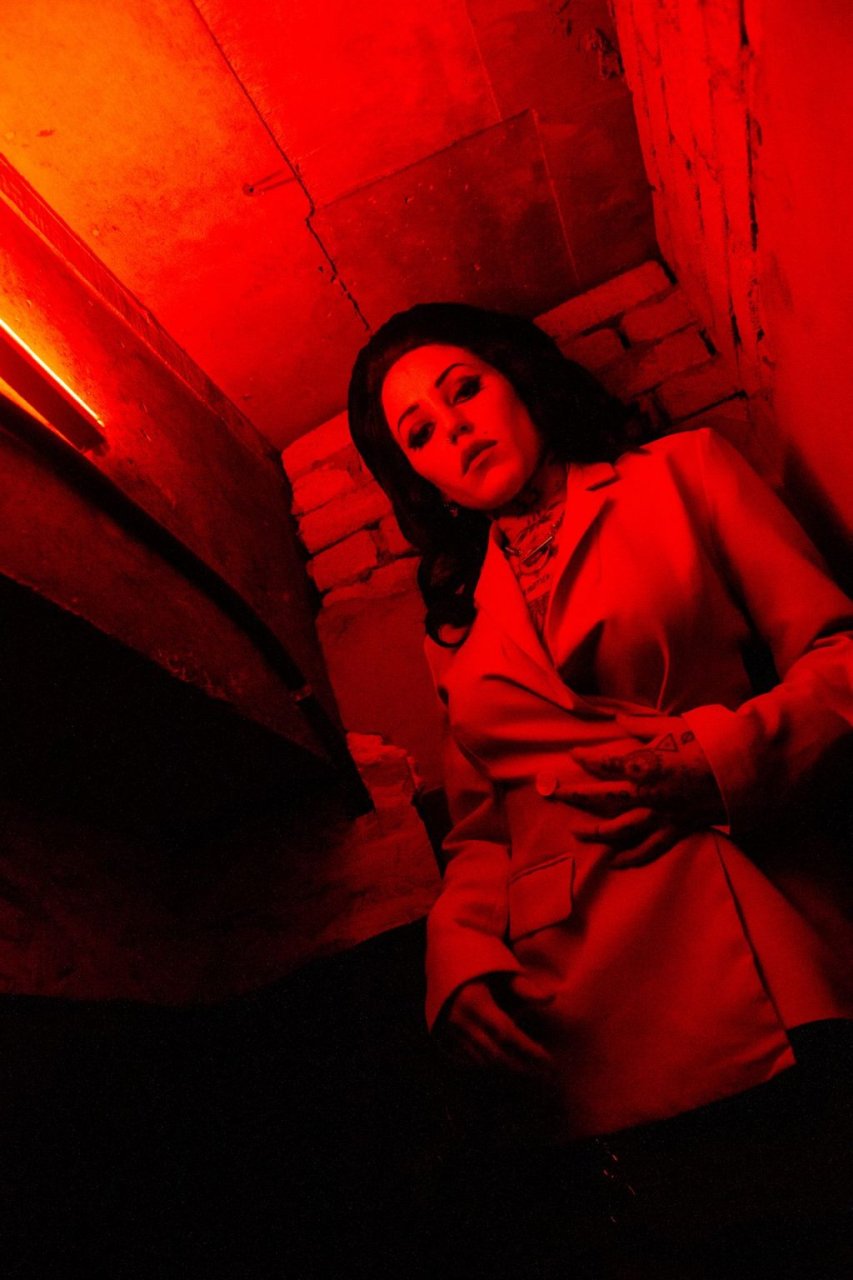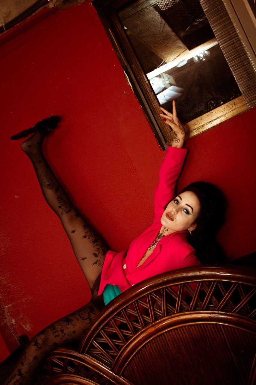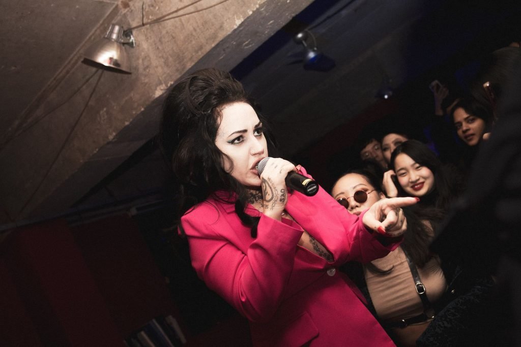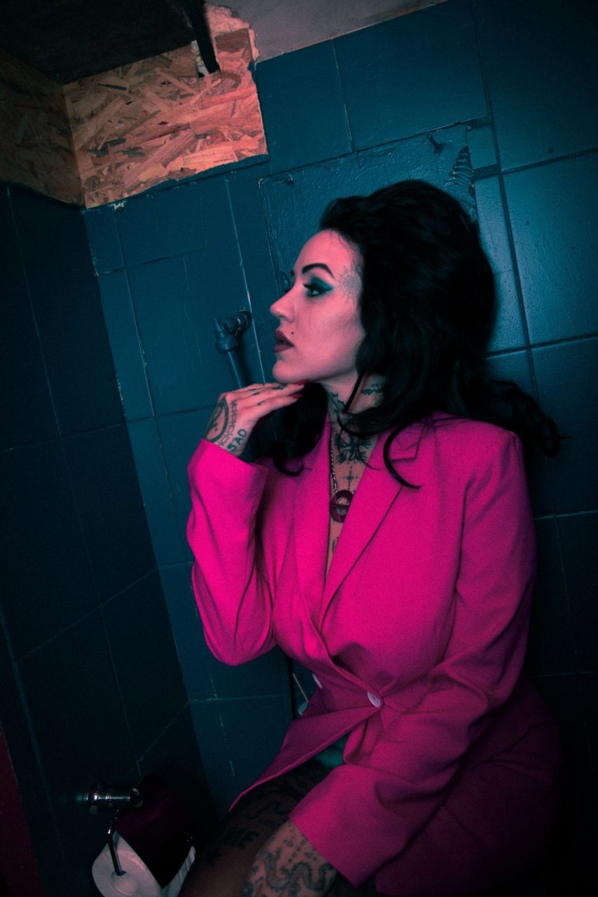 Um artista de sucesso e de alto perfil, sem dúvida, a julgar pelo local - um porão - e pelas legiões de fãs presentes. Quanto aos seios, não consigo dizer como são; as tatuagens realmente fazem um bom trabalho escondendo-os.