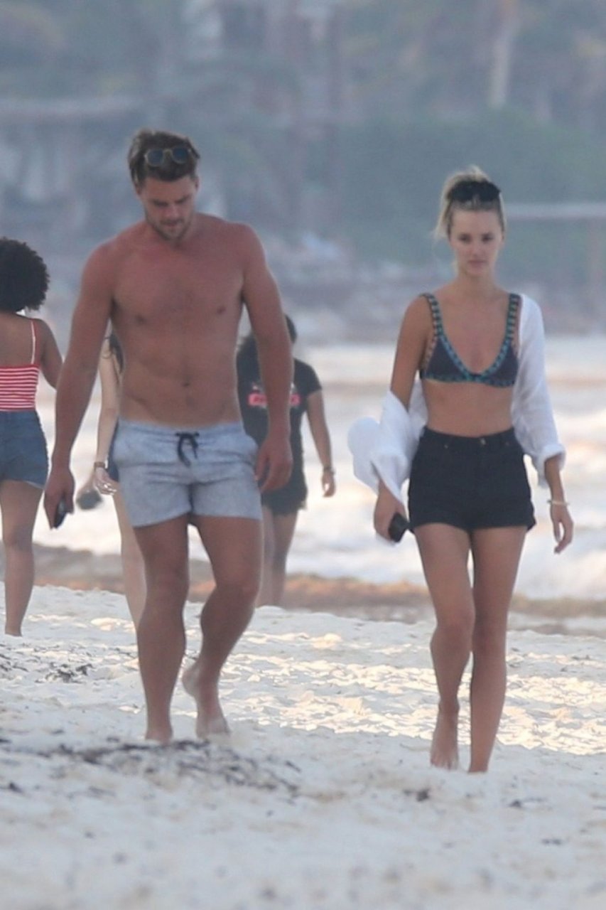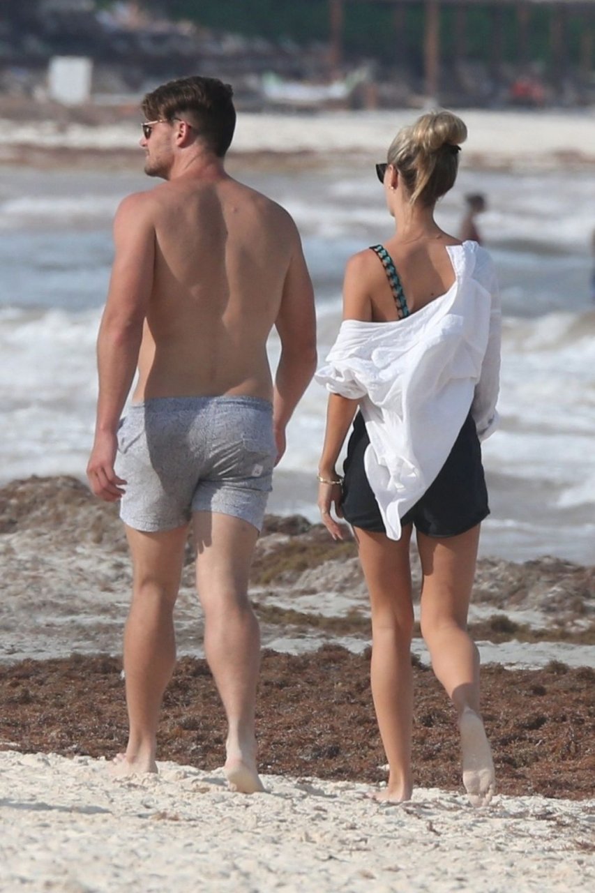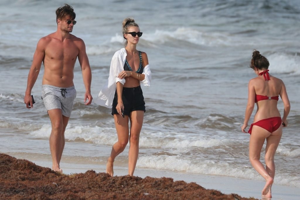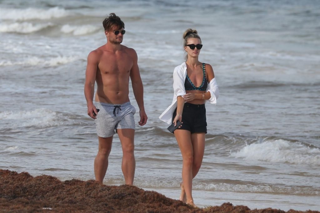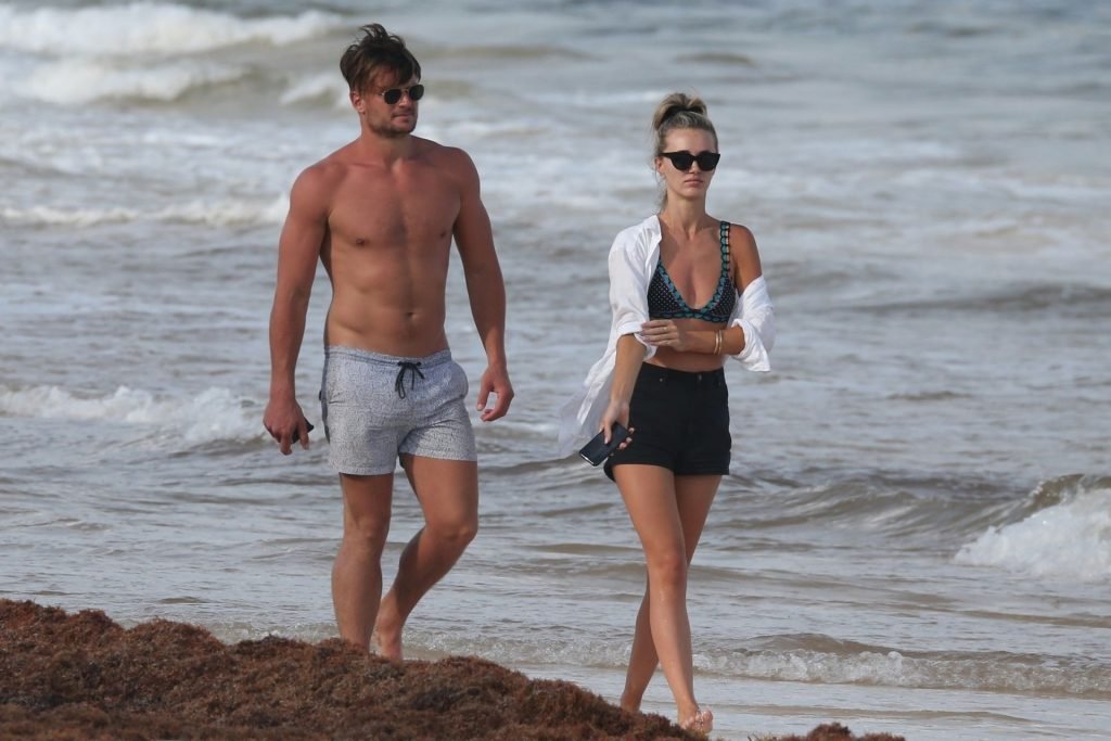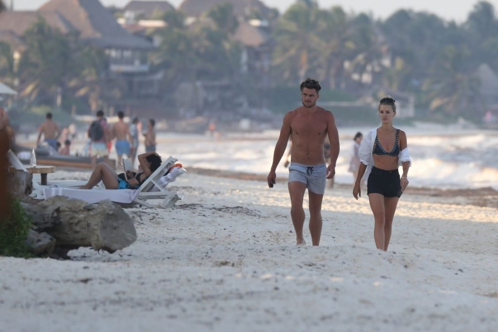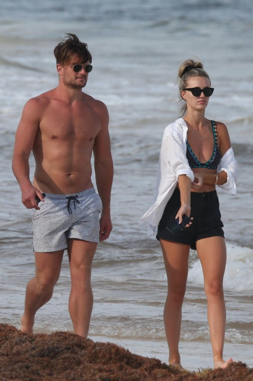 A modelo australiana Brooke Hogan e Myles Pitt caminham pela praia durante férias juntos em Tulum, México, 21/04/2019.