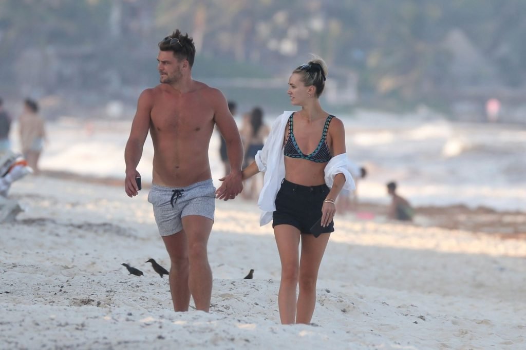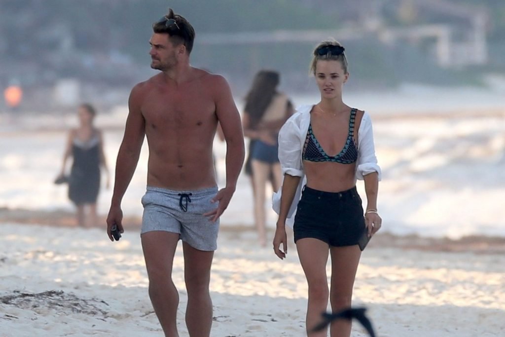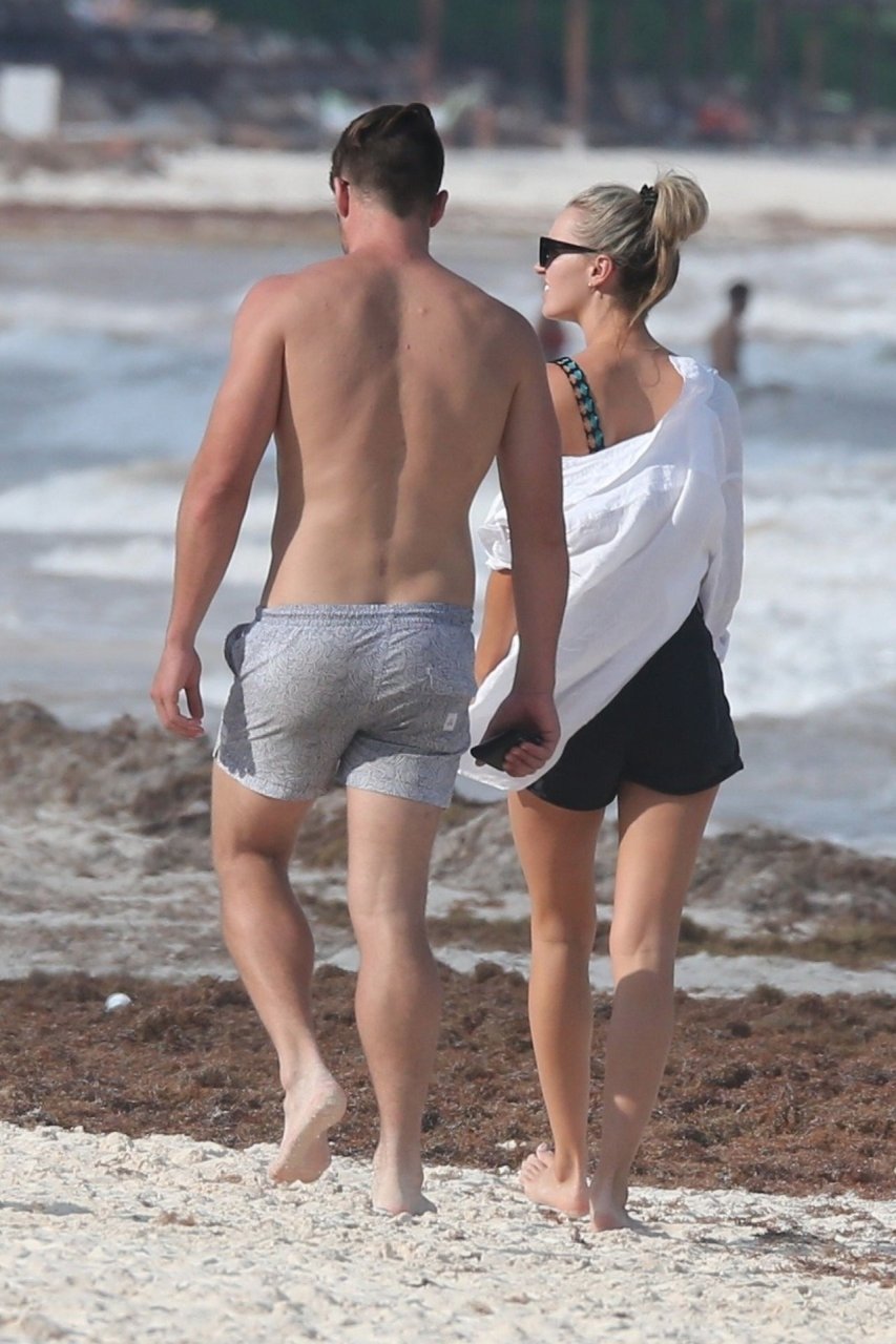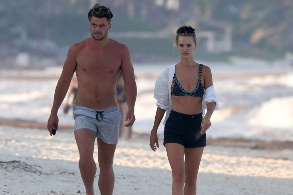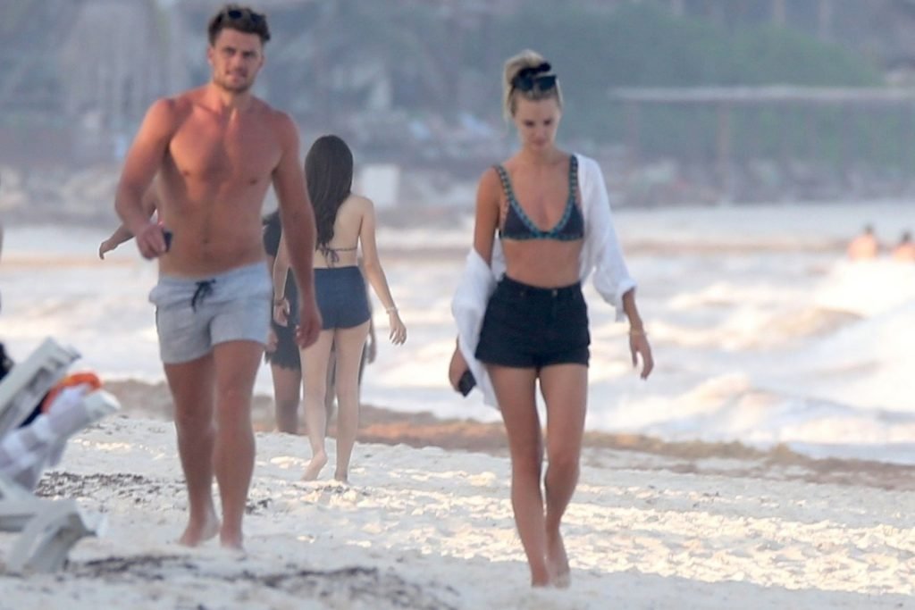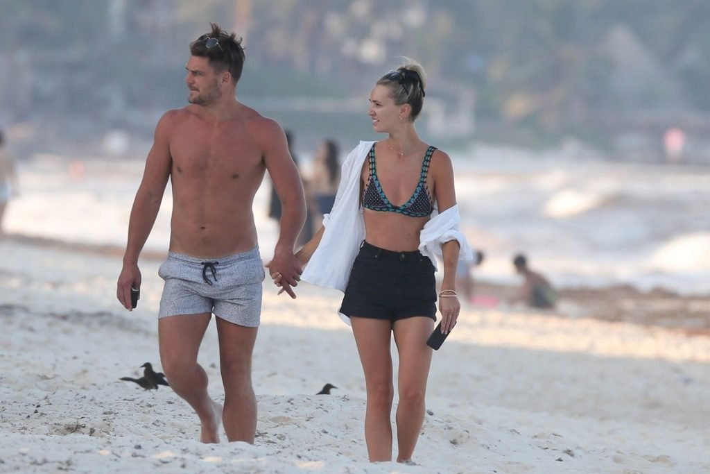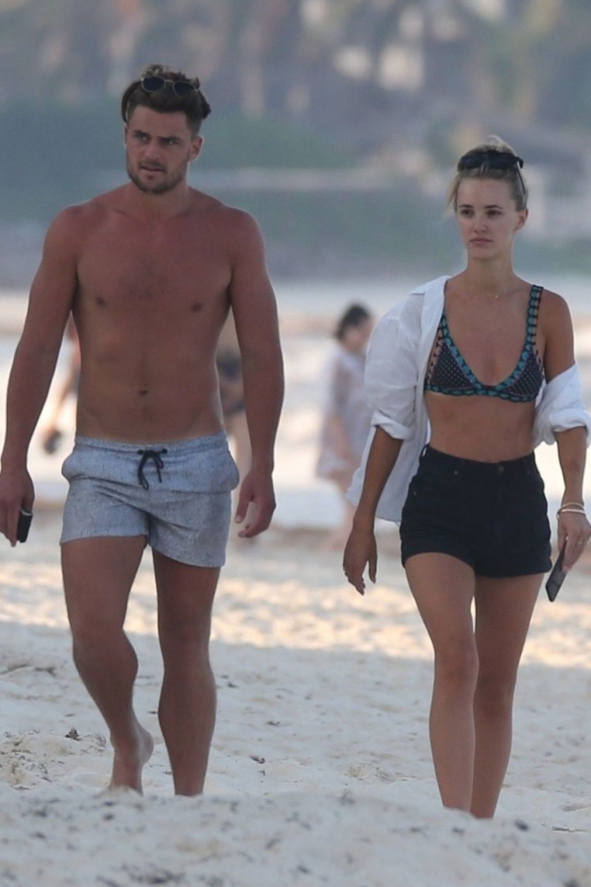 A modelo australiana Brooke Hogan e Myles Pitt caminham pela praia durante férias juntos em Tulum, México, 21/04/2019.