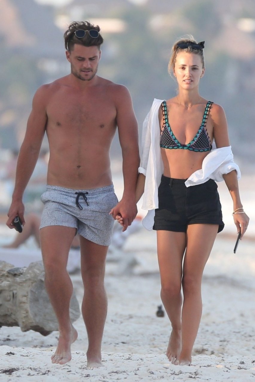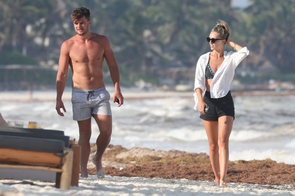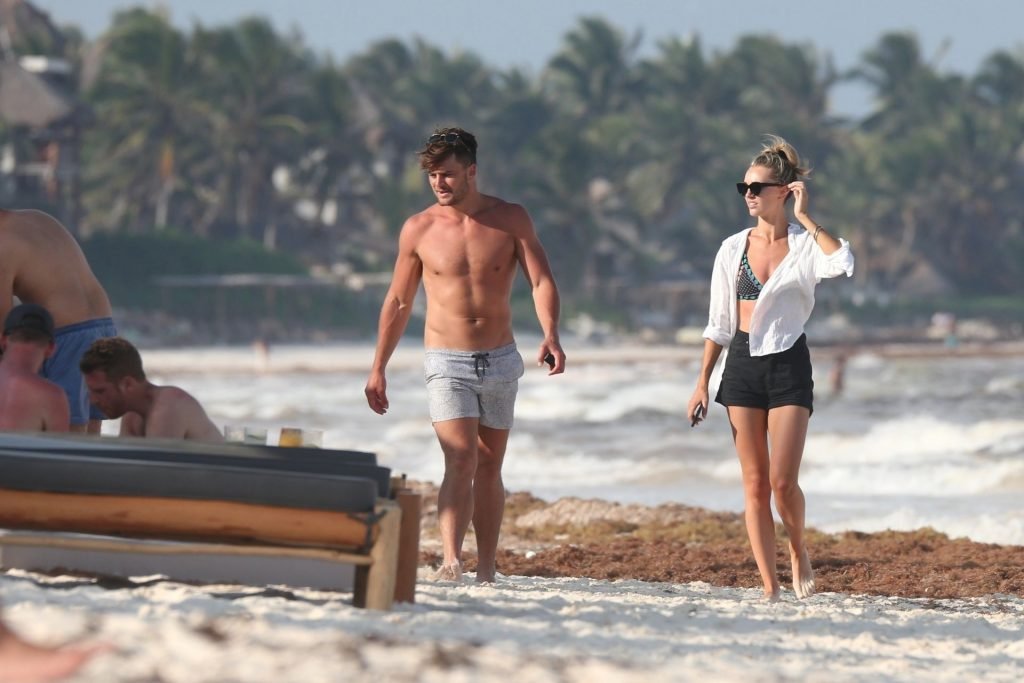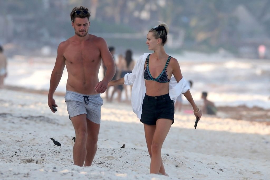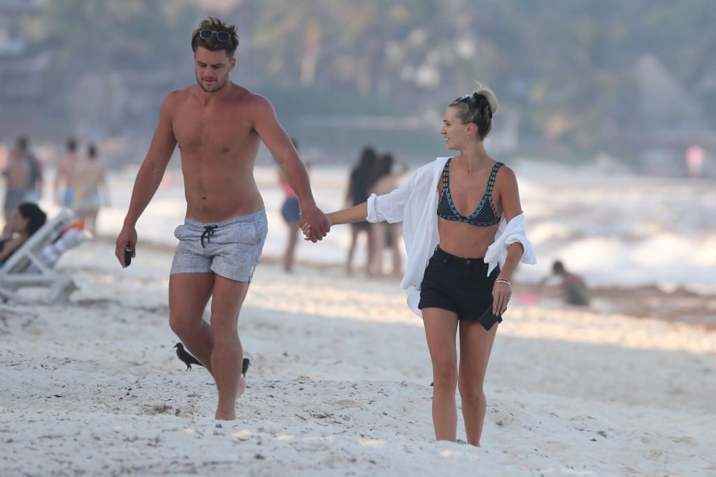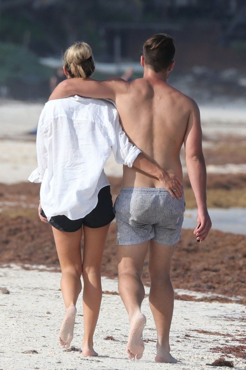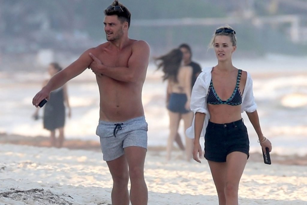 A modelo australiana Brooke Hogan e Myles Pitt caminham pela praia durante férias juntos em Tulum, México, 21/04/2019.