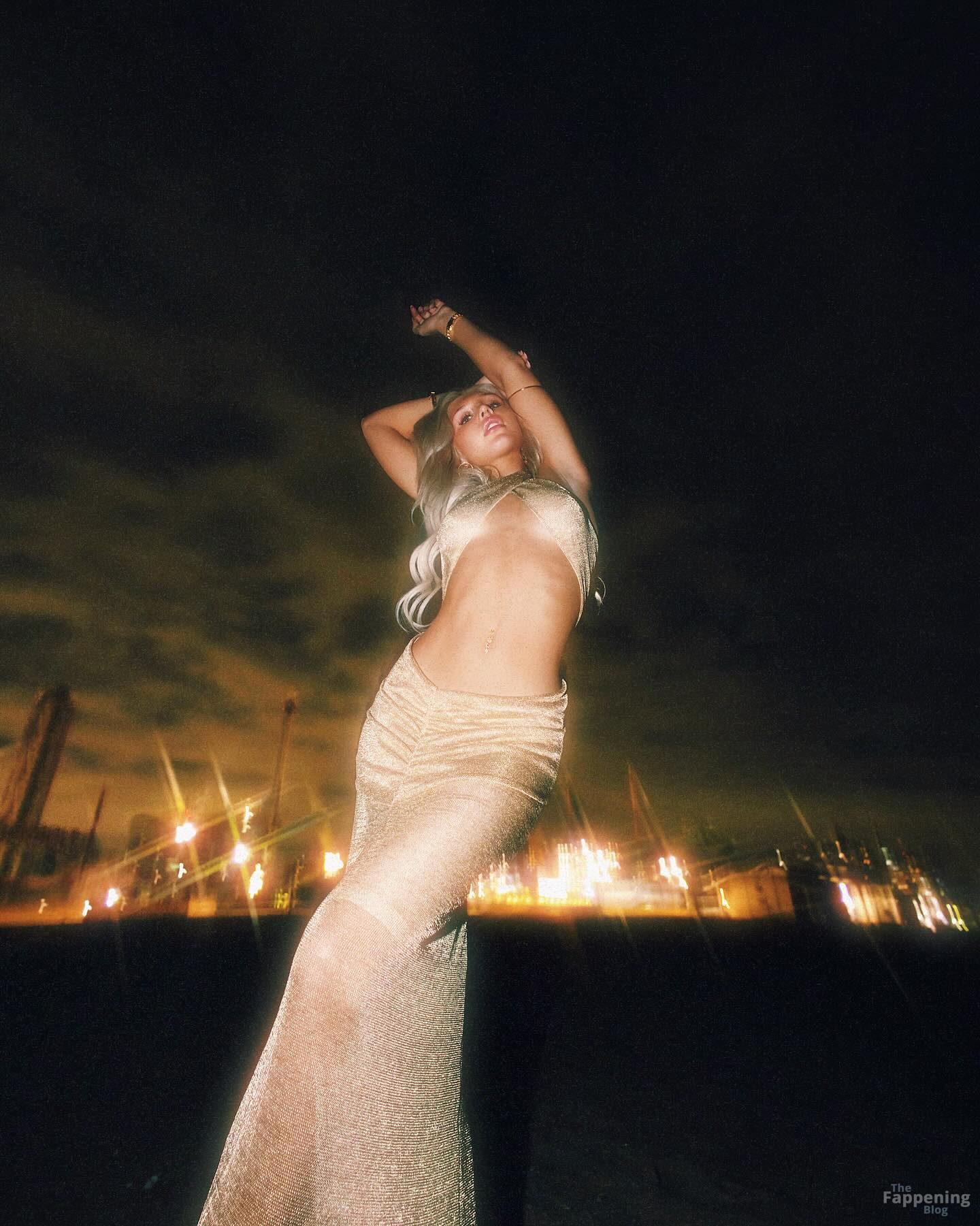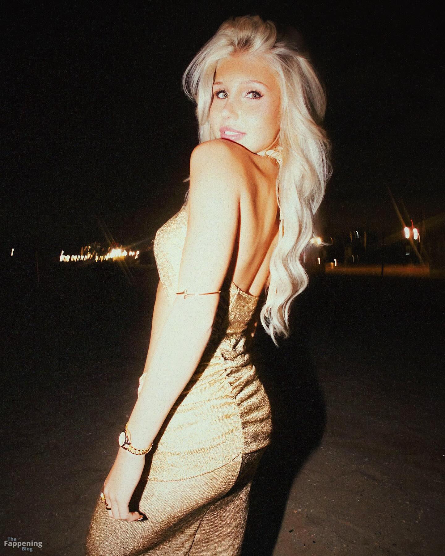 Brooklyn Riley brilha com um vestido dourado na praia à noite. Confira seu ensaio nas redes sociais abaixo.