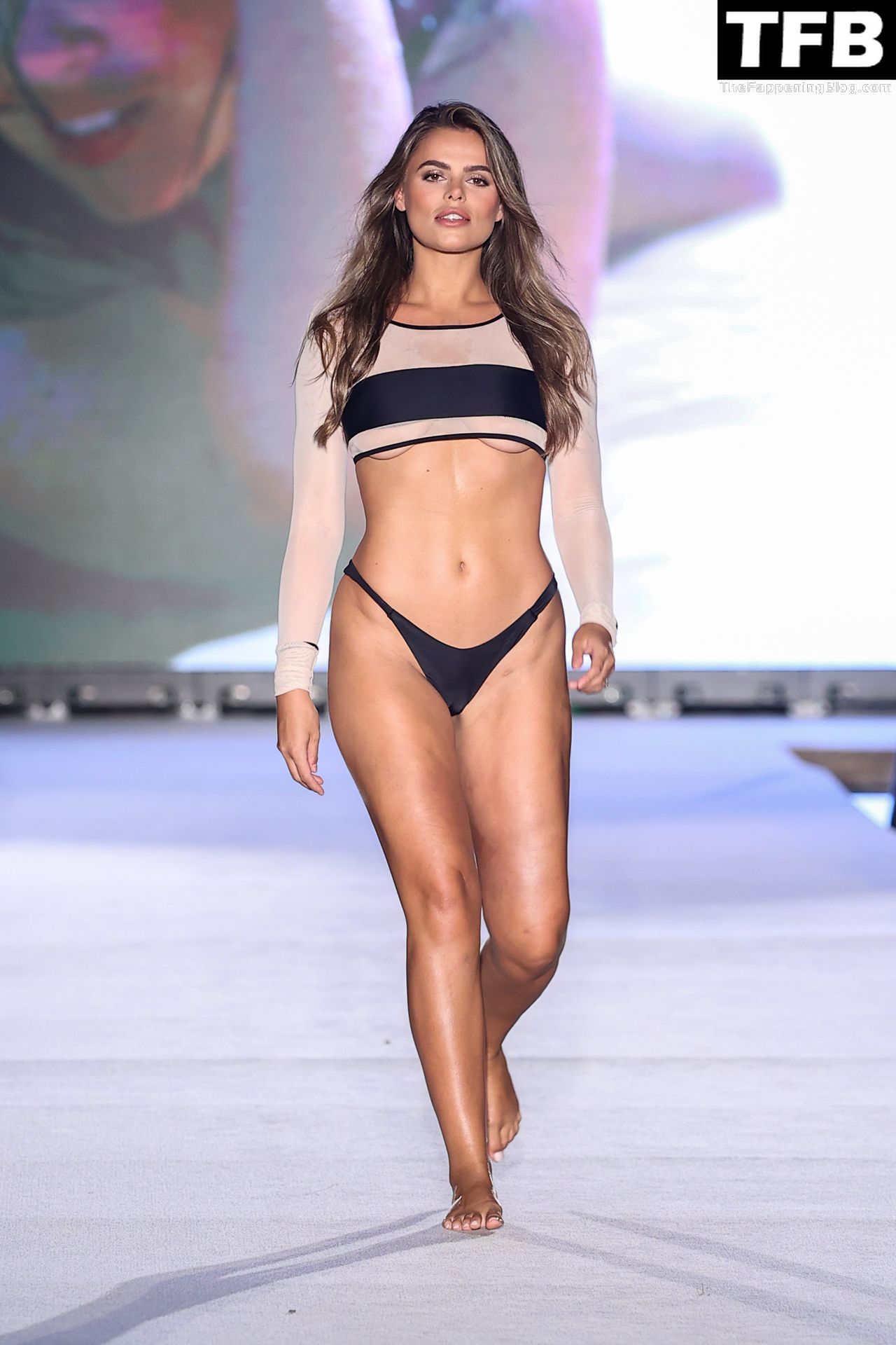 Brooks Nader posa nos bastidores e desfila na passarela do desfile de moda praia da Sports Illustrated durante o Paraiso Miami Beach em Miami Beach, Flórida, 16/07/2022.