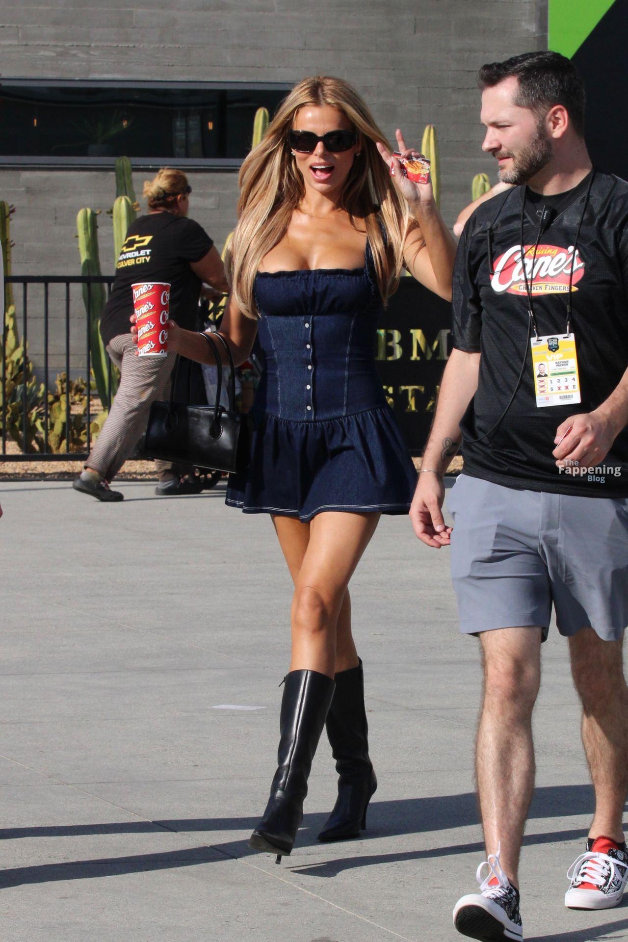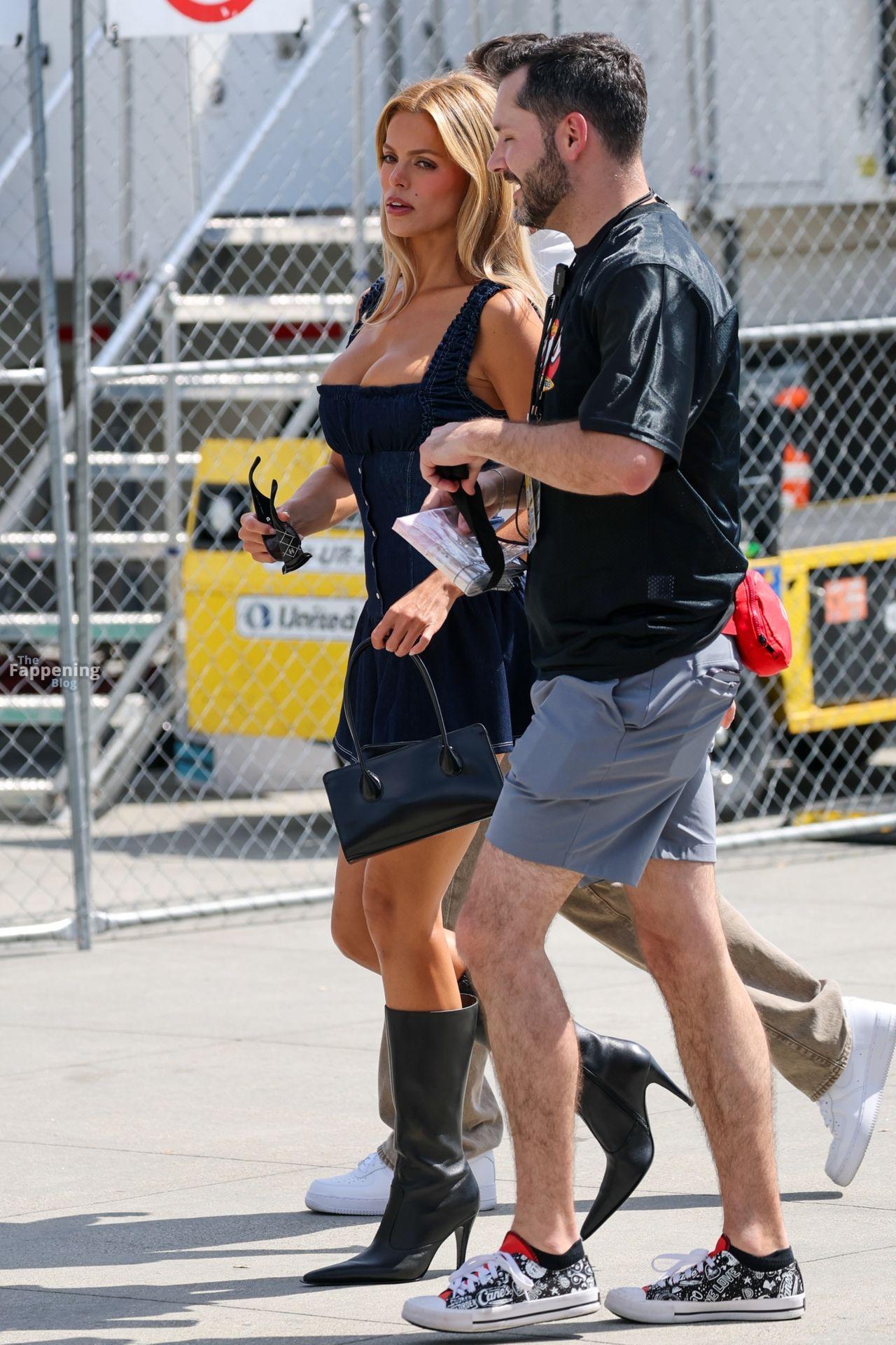 Brooks Nader é vista saindo do jogo de Fanatics Flag Football, caminhando sem calcinha em um vestido curto de jeans combinado com botas pretas longas e óculos escuros enquanto sai após o evento.